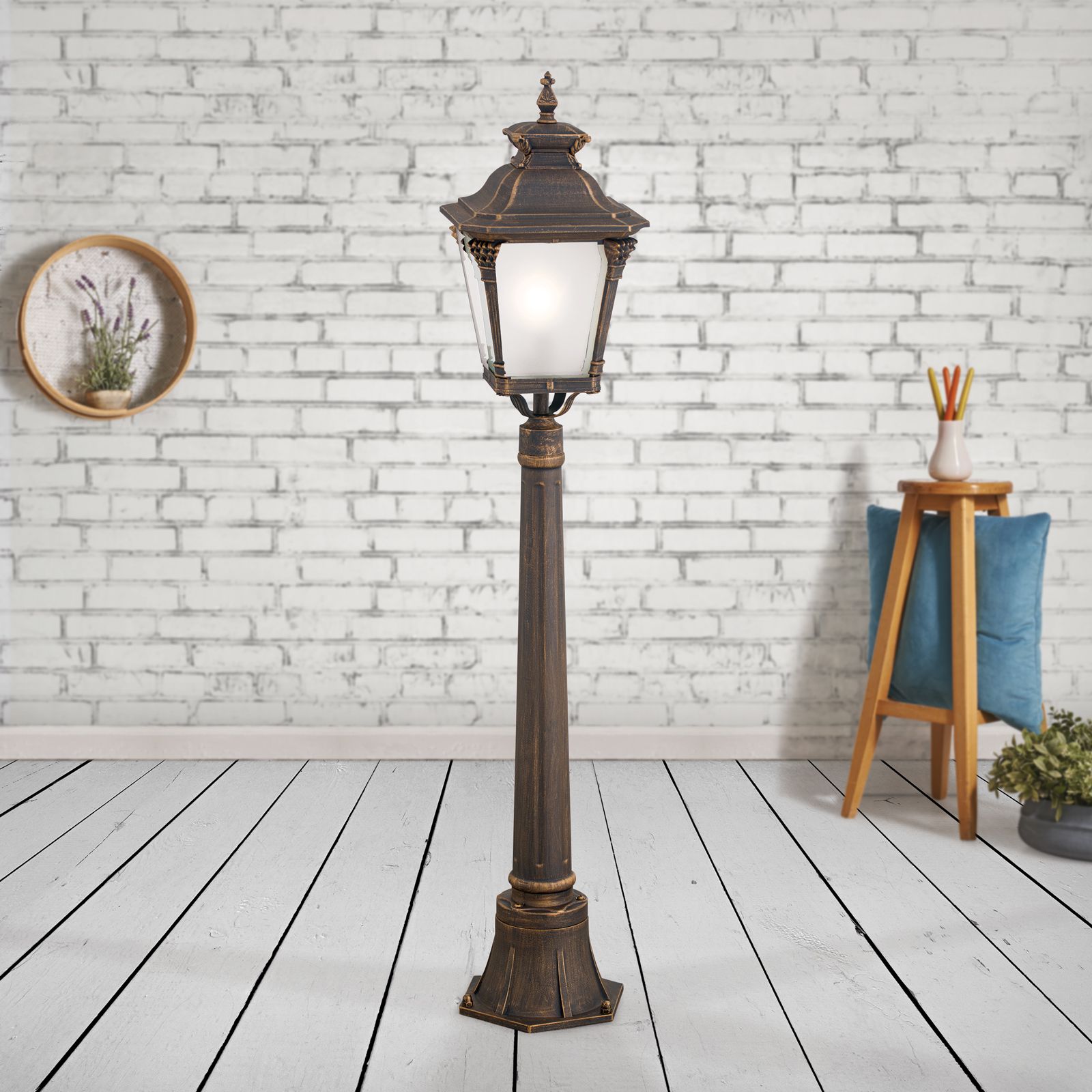 Filigrane Kanneluren und zahlreiche weitere Zierelemente prägen das antike Design der Wegleuchte, das durch die Veredelung mit handgewischter Patinafarbe verstärkt wird.