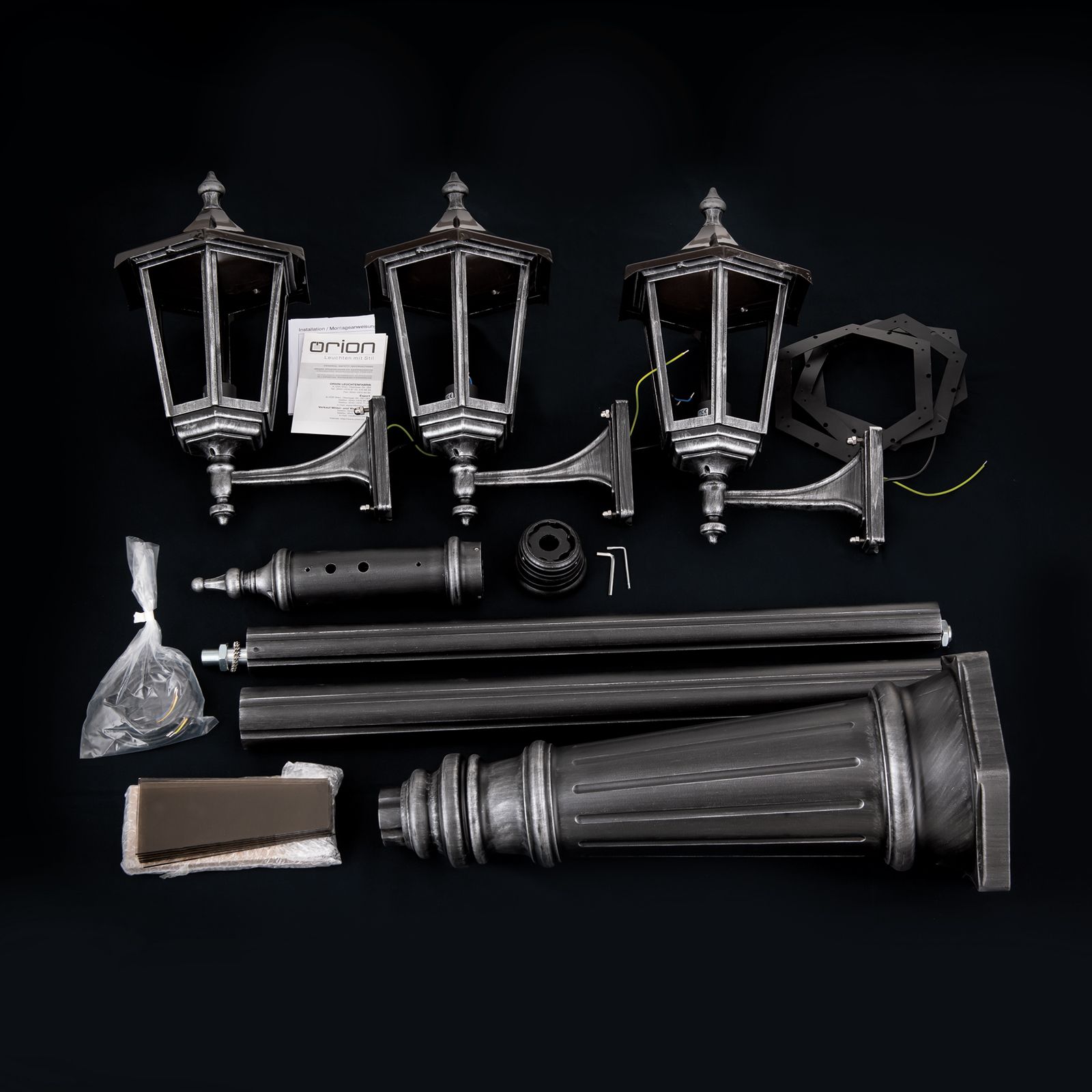 Die dreiflammige Mastleuchte HERMINE überzeugt durch ihr klassisches Design und den robusten Charakter. Die Schutzart IP43 und der hochwertige Siluminguss machen sie besonders witterungsbeständig und wetterfest. Durch ihr antikes Erscheinungsbild verleiht sie Garten- und Parkanlagen einen verwunschen, romantischen Charakter und sorgt gleichzeitig für eine sichere Beleuchtung großer Außenareale. Die Oberfläche ist in einem antiken Schwarzsilber gestaltet und wird von einem kupferbraunen Dach mit schwarzer Spitze bekrönt.