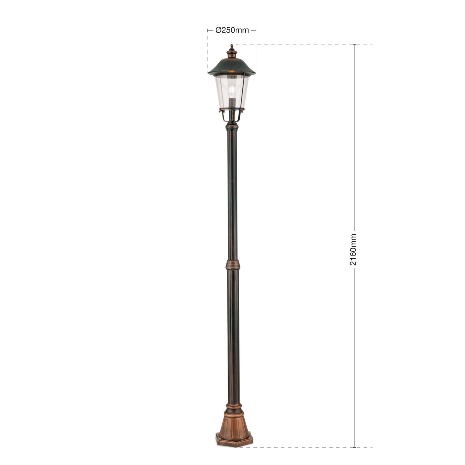 Der beständige Siluminguss ist mit einer kupferfarbenen Patina veredelt und der Laternenschirm mit klarem und robustem Acrylglas ausgestattet.