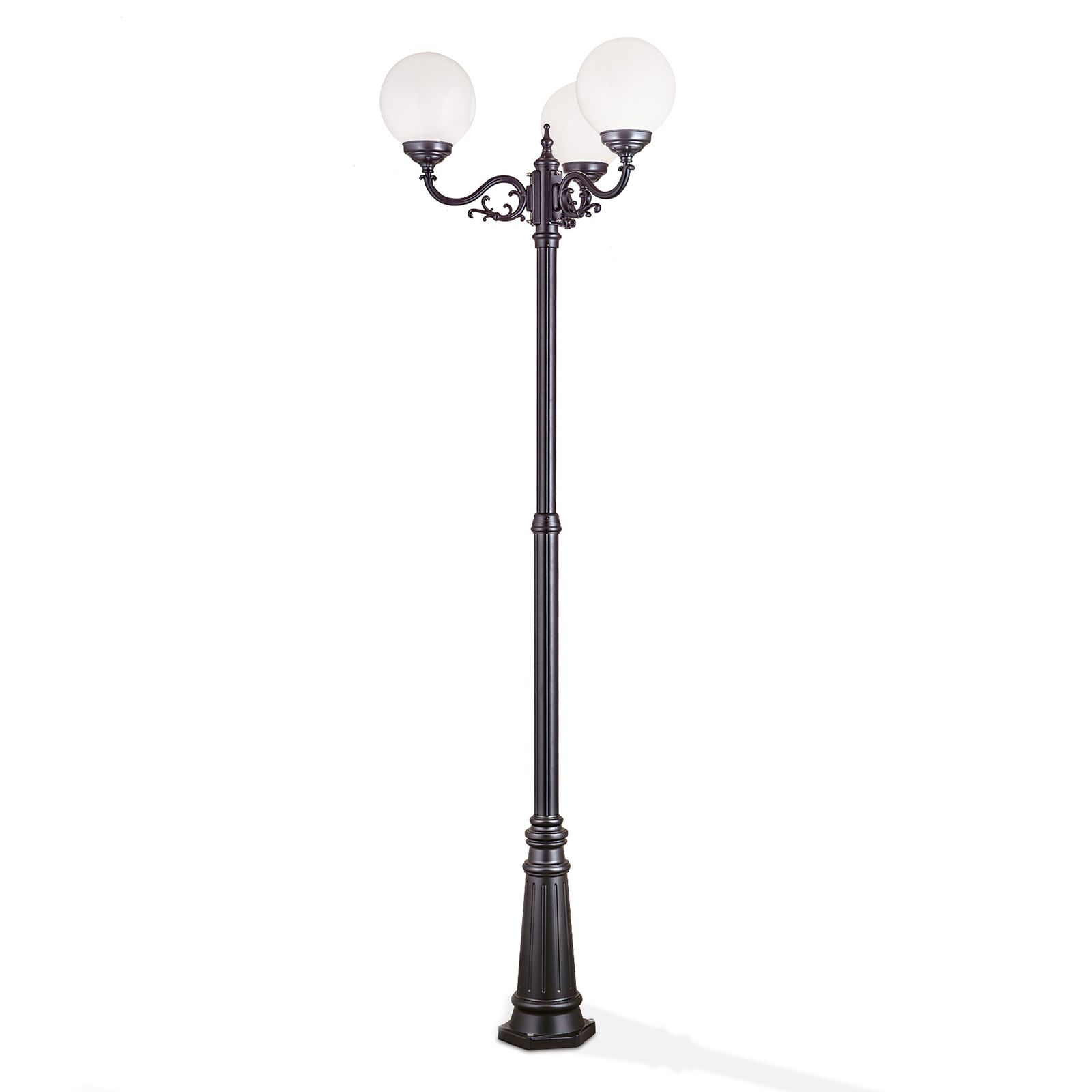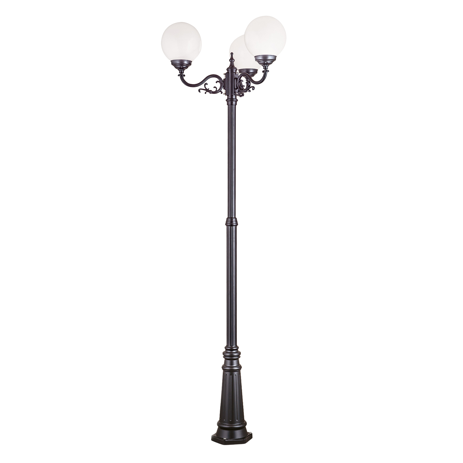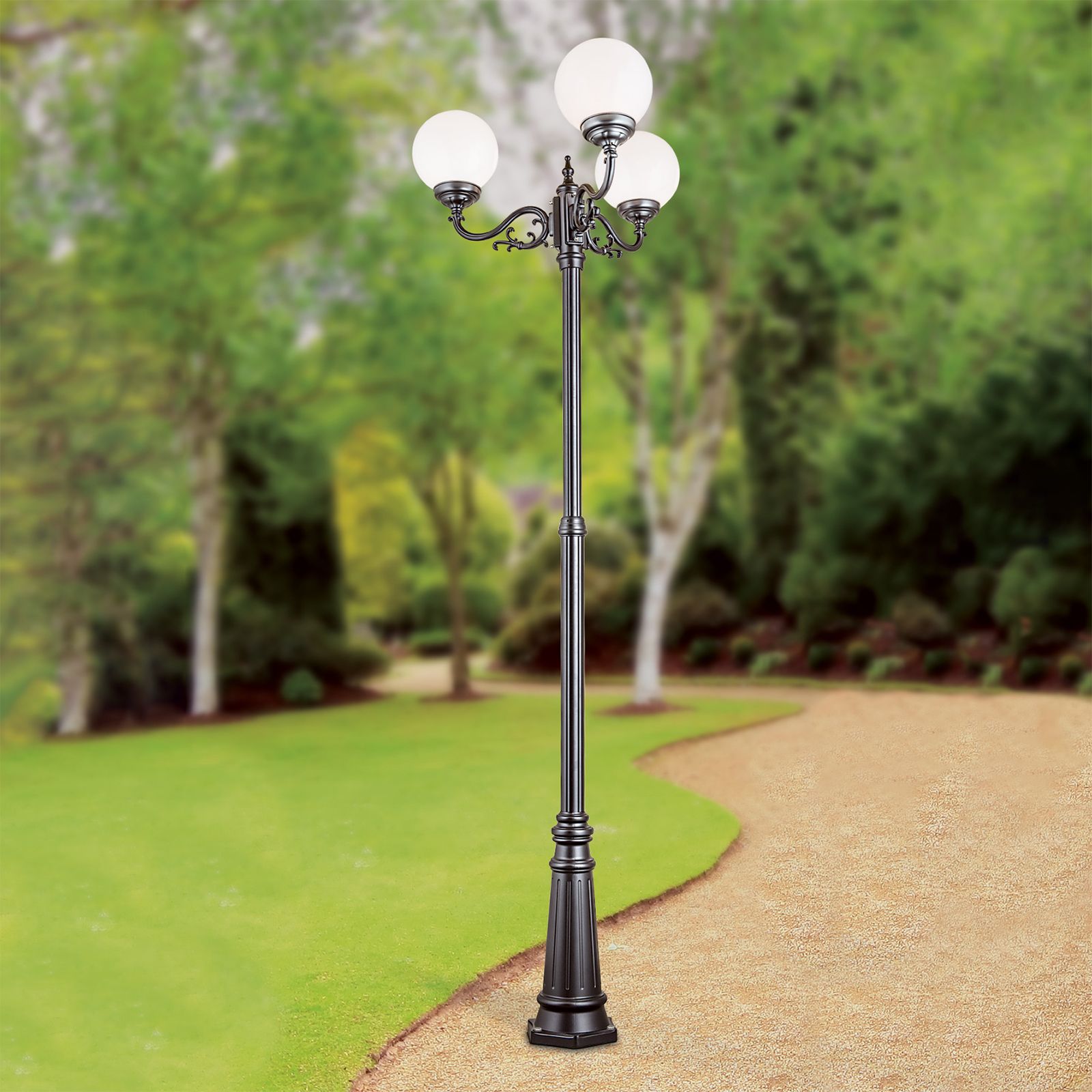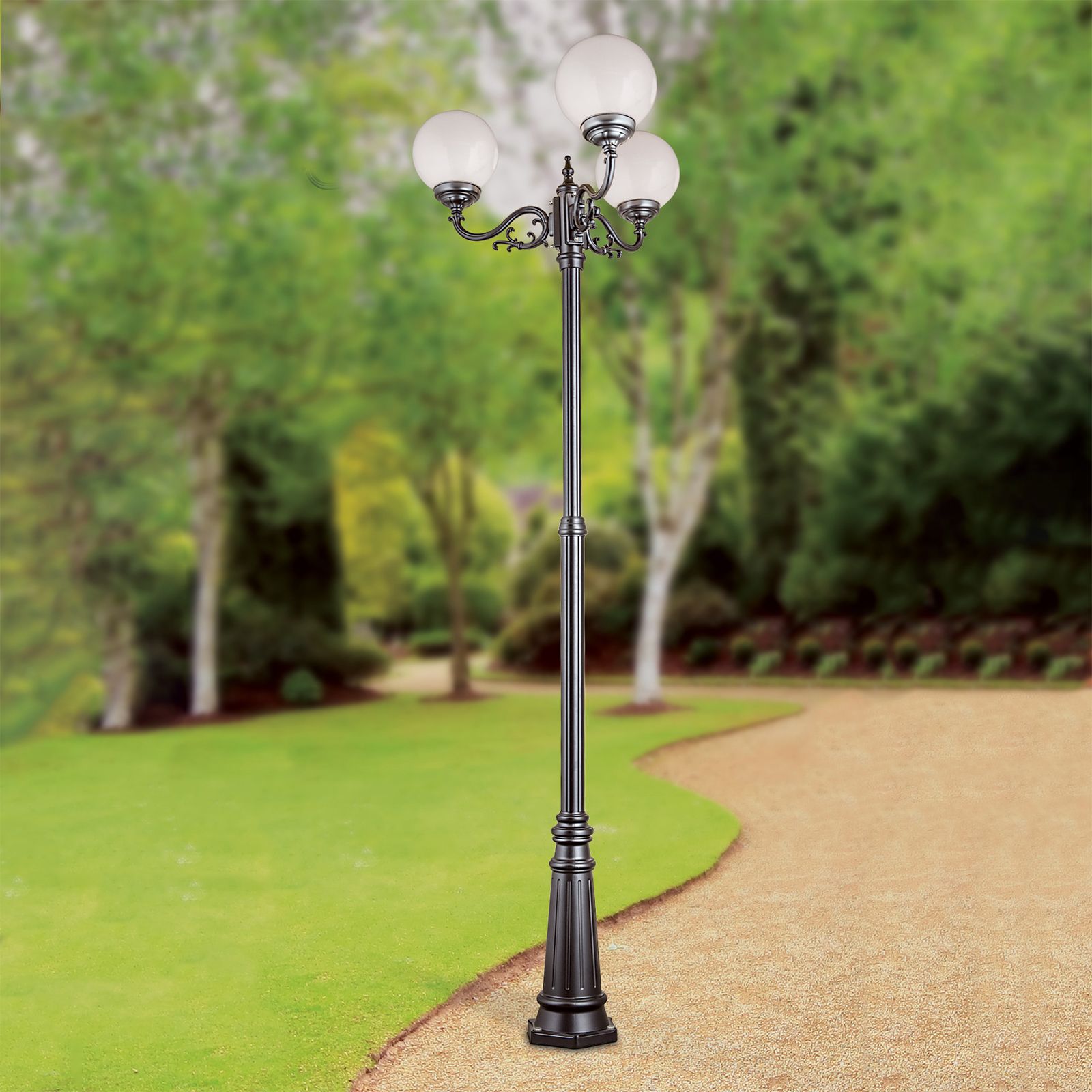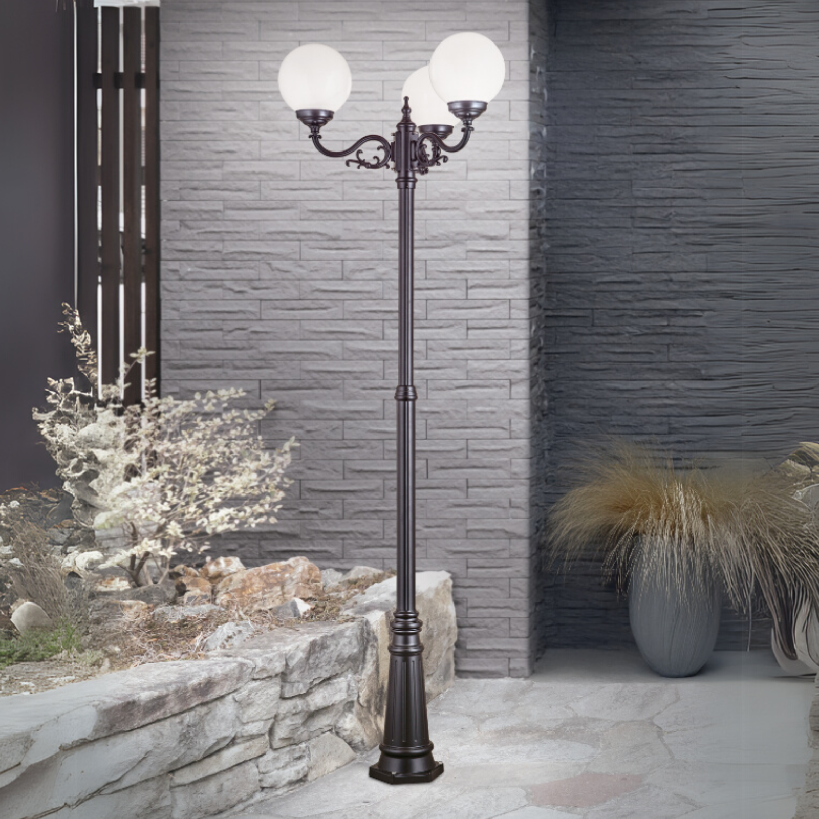Bei der dreiflammigen Mastleuchte REIKA handelt es sich um eine dekorative Außenleuchte, die sich hervorragend als Orientierungslicht an einem Wegrand eignet. Mit dem dezenten, aber auch märchenhaften Design sorgt sie für eine gute Beleuchtung im gewünschten Bereich und bringt somit auch mehr Sicherheit im Dunkeln. Auf ihrem Mast sind drei opal-glänzende Acrylglaskugeln im gleichen Abstand zueinander befestigt, die für eine gleichmäßige und angenehme Lichtverteilung sorgen. Die Leuchte ist mit einem Phasenanschnittdimmer dimmbar, wenn das Variieren der Helligkeit erwünscht ist. Ausgestattet ist sie mit drei E27-Fassung und kann mit maximal 75 Watt bestückt werden. LED-Lampen sind die ideale Ergänzung für diese Mastleuchte, um den Energie- und Wartungsaufwand niedrig zu halten.