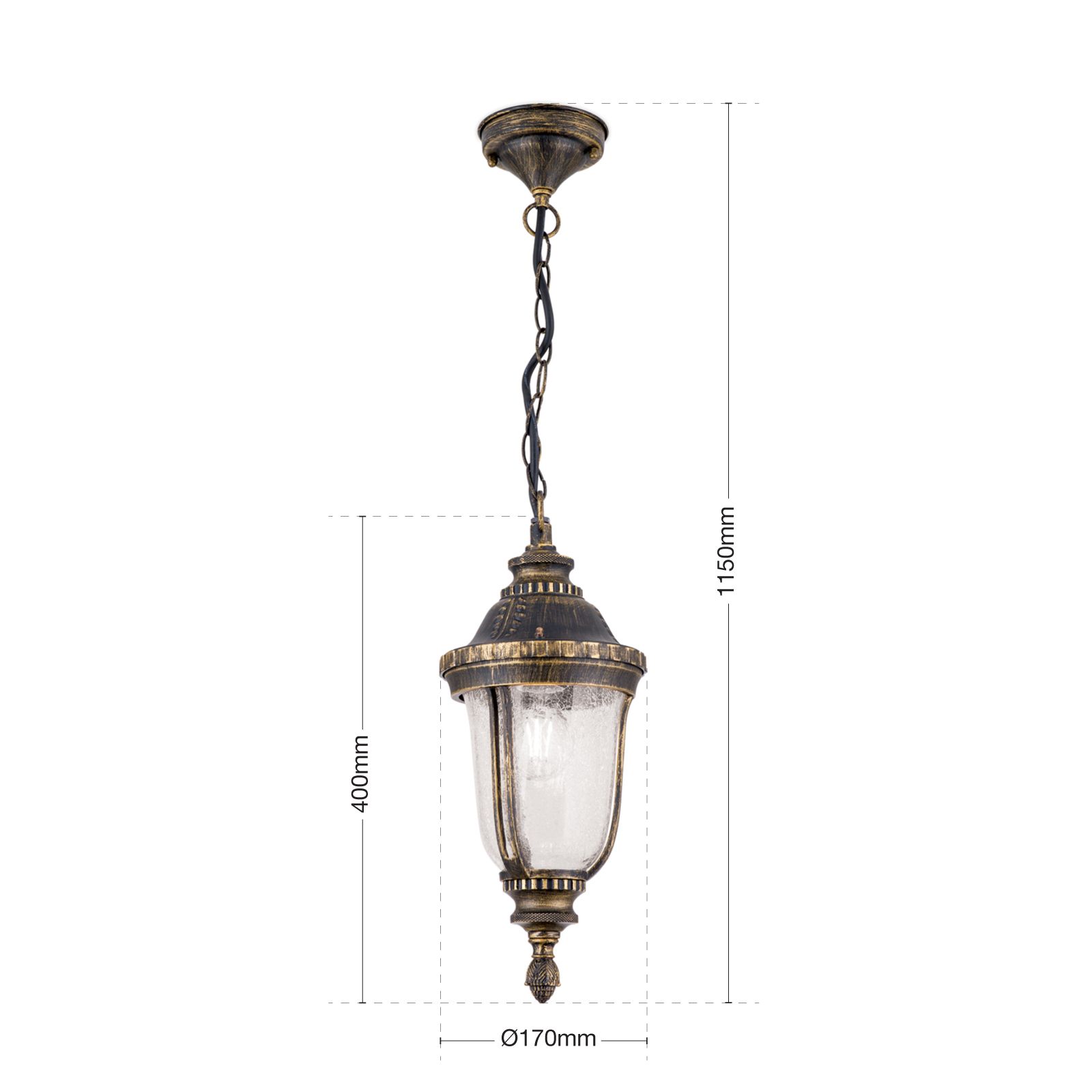 Ein witterungsbestängiger Siluminguss sorgt für Korrosionsschutz und langanhaltende Freude. Durch die Abhängung der Laterne an einer Kette, kann die Höhe der Leuchte bei der Montage einfach an die spezifischen Bedingungen angepasst werden.
