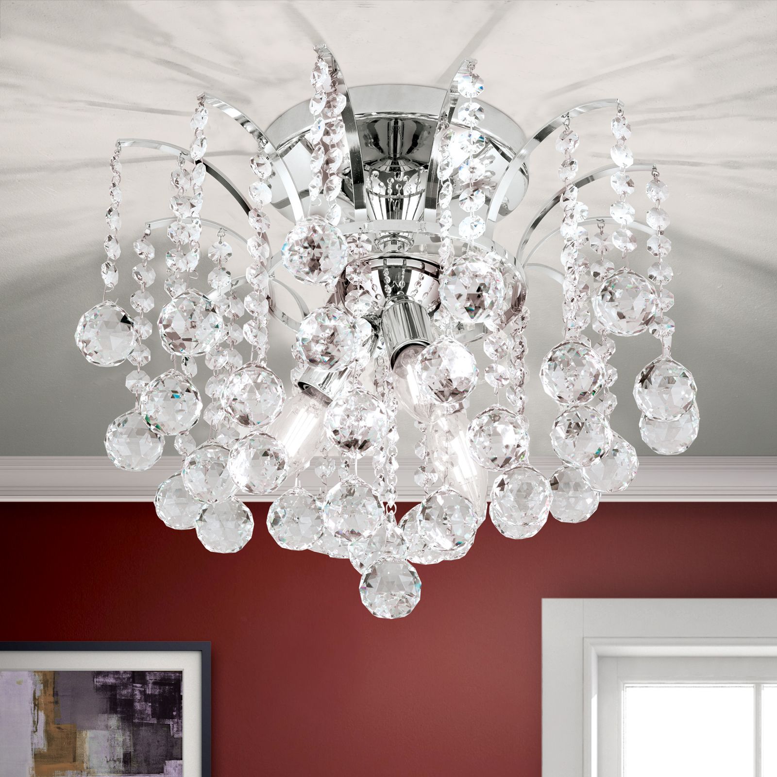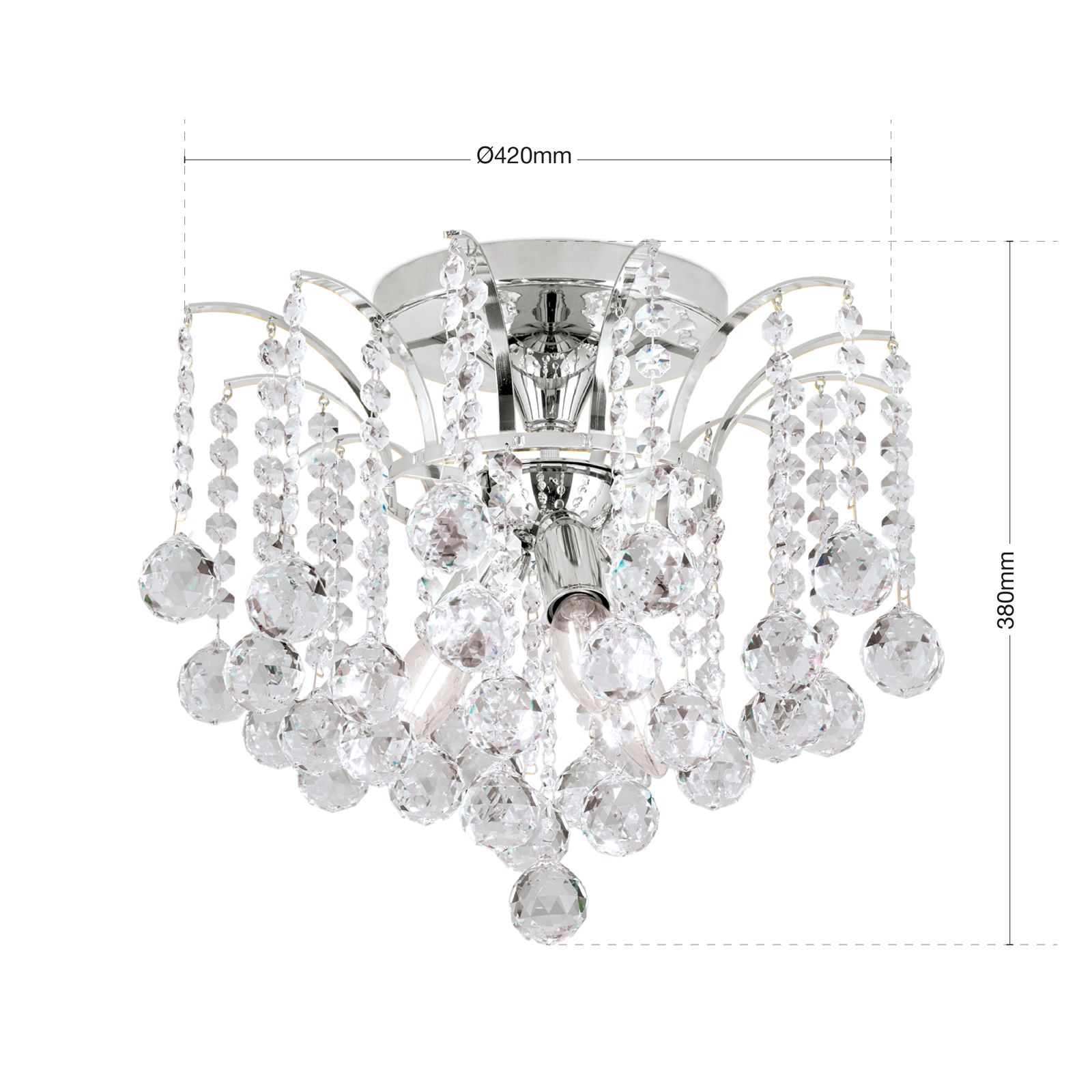 Der Deckenkronleuchter KRISTALL KLASSISCH besticht nicht nur durch die besondere Lichtwirkung, sondern auch durch sein imposantes Erscheinungsbild, welches aus einem filigranen Vollmessinggestell und unzähligen Asfour-Kristallen besteht. Das an Wasserfontänen erinnernde Design eignet sie sich sowohl für klassische als auch moderne Innenausstattungen und ist vielseitig einsetzbar. Eine Vielzahl an Kristallketten, bestehend aus Koppen und facettierten Kugeln, sorgt für ein spektakuläres Lichtspiel. Durch die glänzende Oberfläche wird das Glitzern der Kristalle, das aufgrund der direkten Bestrahlung entsteht, intensiviert. Die 3 E14-Fassungen, die mit maximal je 40 Watt betrieben werden können, befinden sich hinter den Kristallen mittig versteckt und strahlen das Licht gleichmäßig ab.