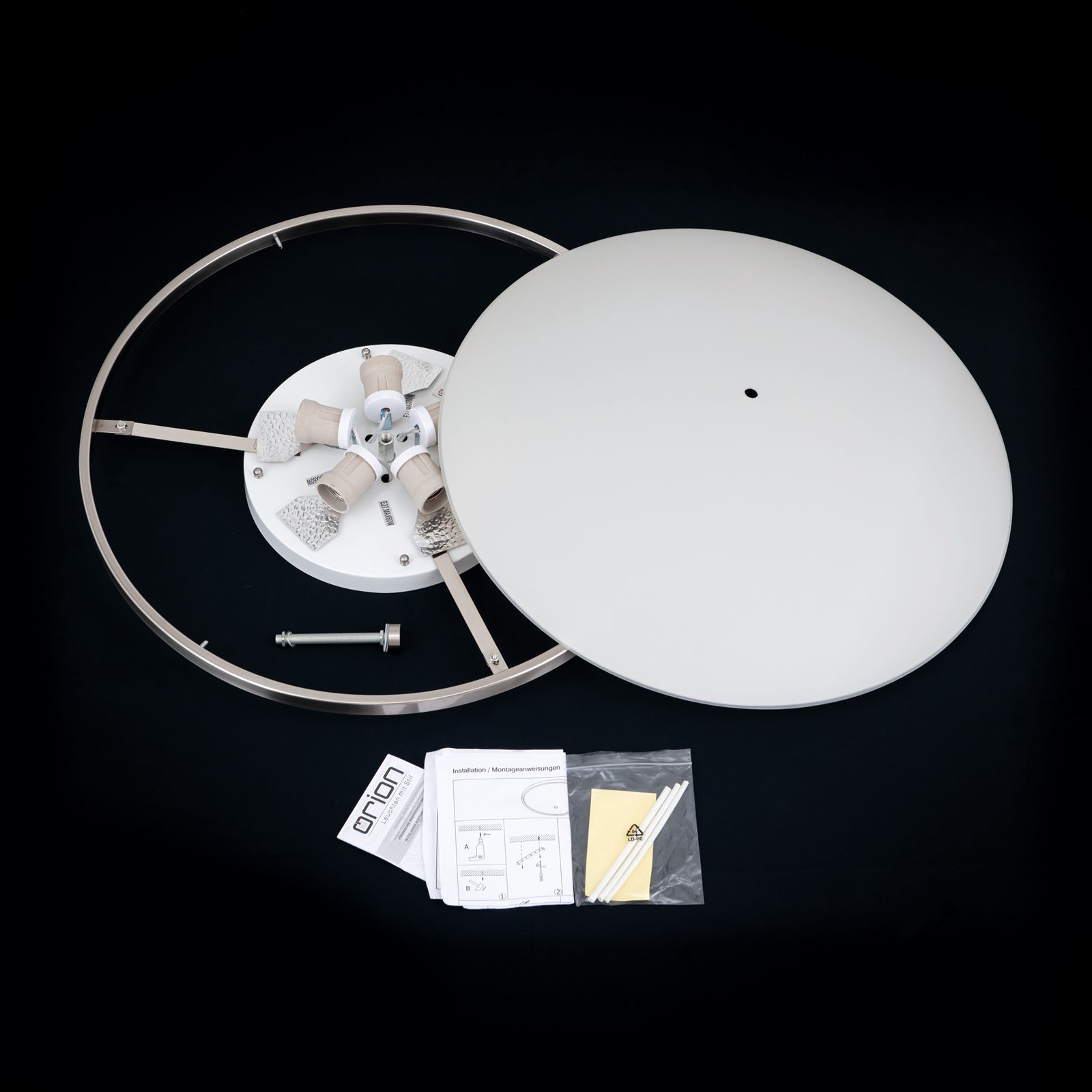 Die dimmbare Deckenleuchte AIDA mit einem beachtlichen Durchmesser von 56 Zentimetern und ganzen fünf E27-Fassungen zu je 60 Watt sorgt mit ihrem Schirm aus Opalglas nicht nur für eine hohe Lichtausbeute.