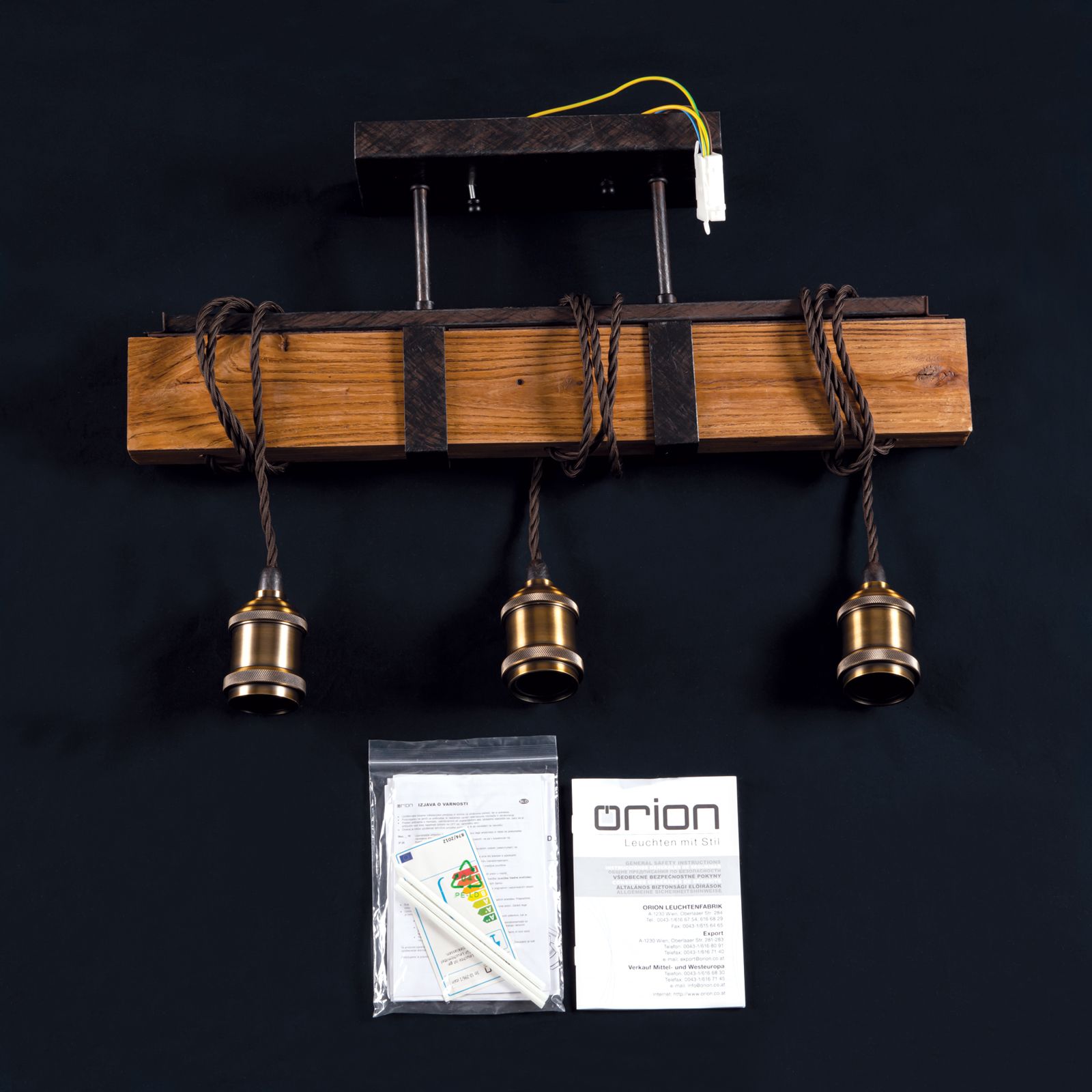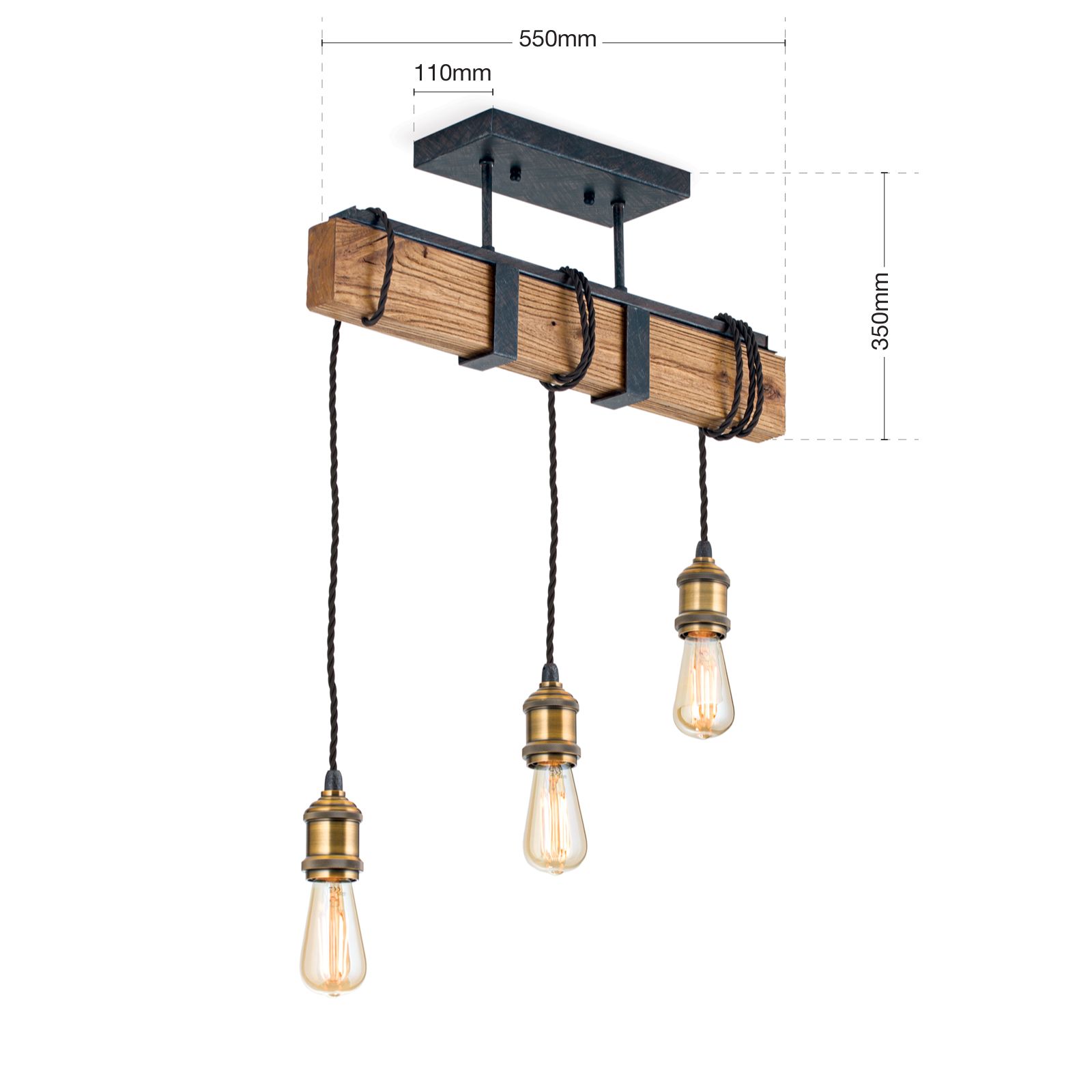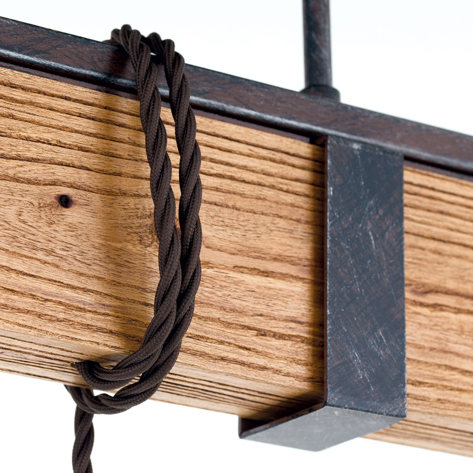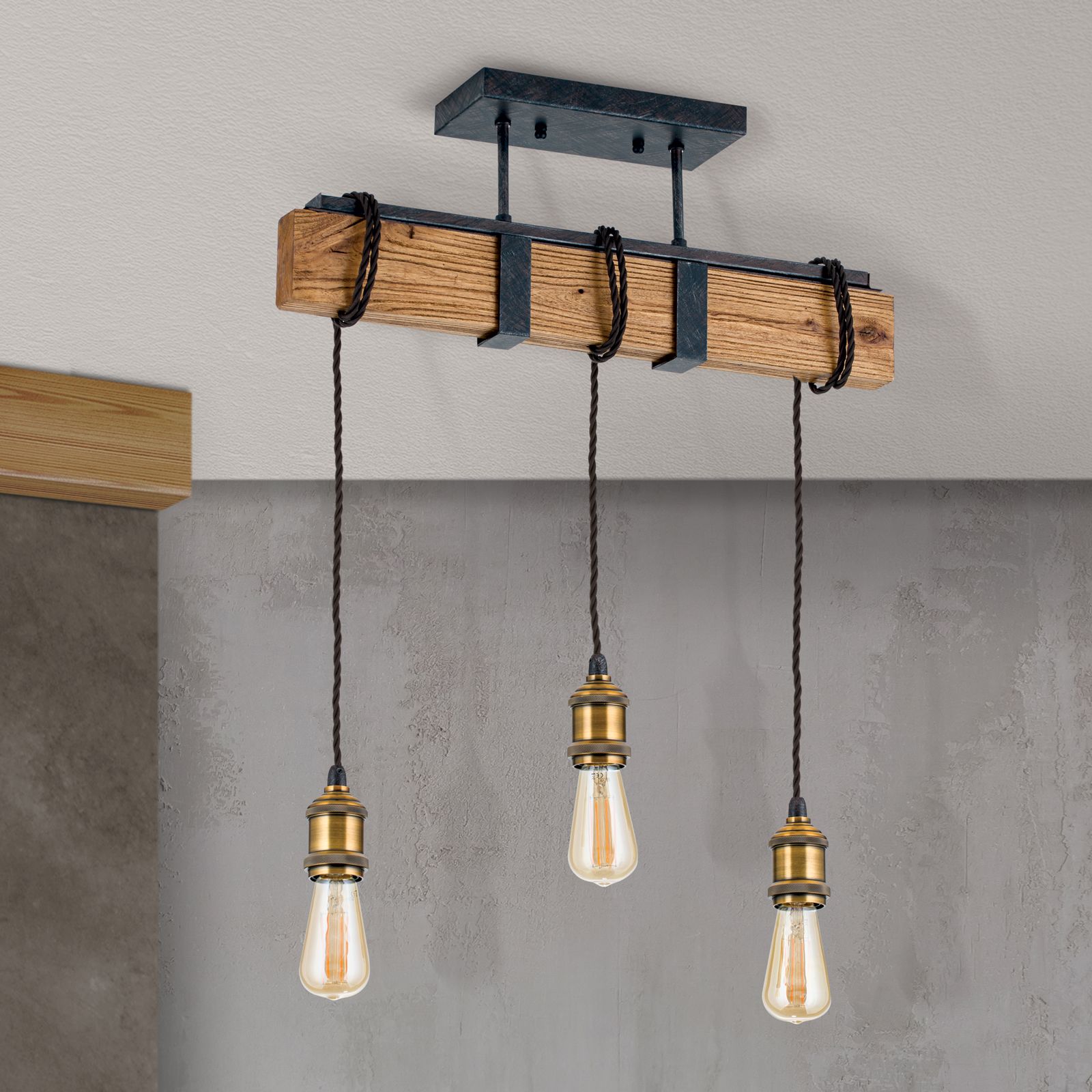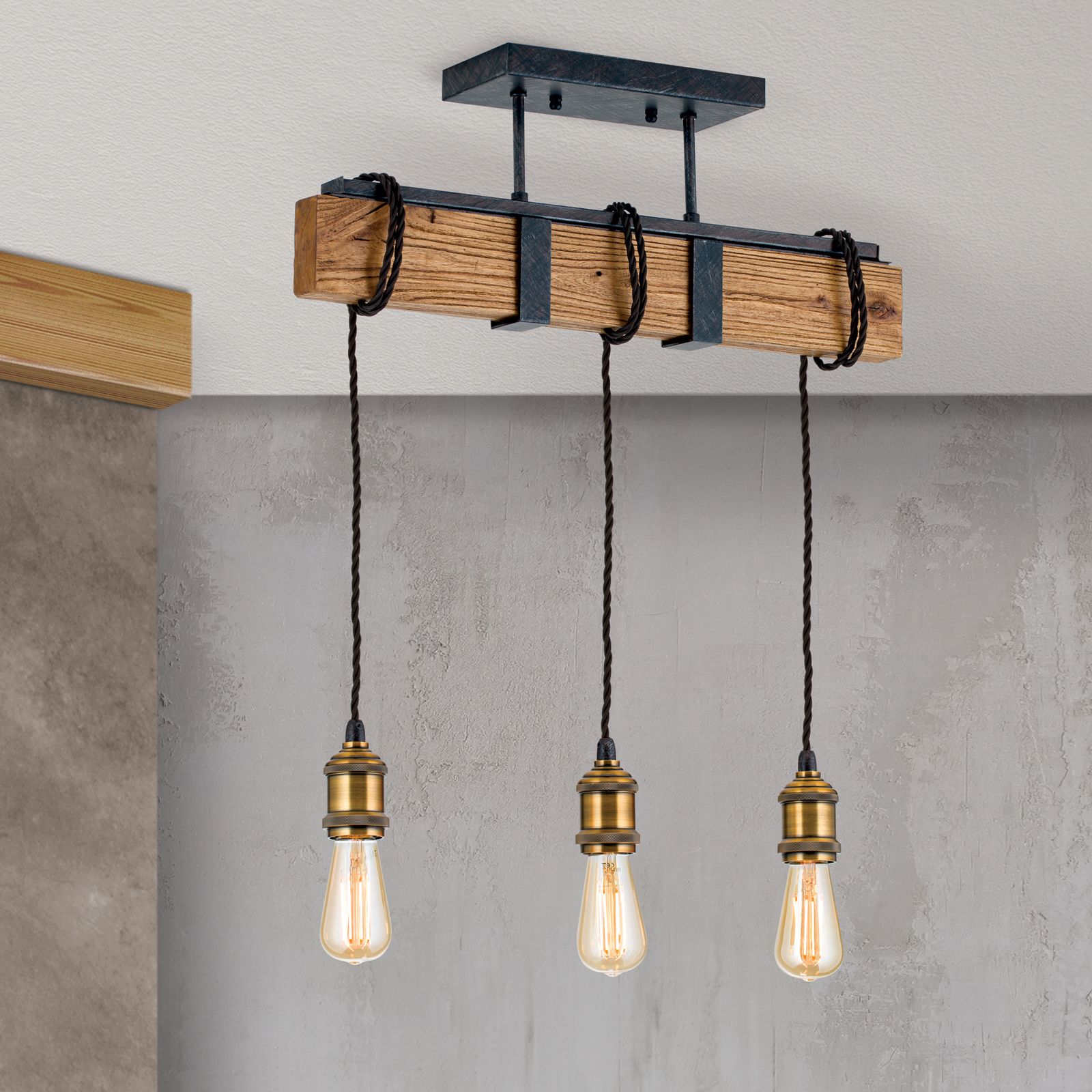 Im angesagten Vintagestil präsentiert sich die Deckenleuchte CELLAR mit ihren 3 Flammen. Die Kombination verschiedener Materialien wie Holz, Stahl und Antikfinish machen sie zu einem ganz besonderen Wohnaccessoire. Angebracht über einer Bar oder als coole Esstischbeleuchtung gibt sie ihr Licht gleichmäßig in alle Richtungen ab. Die 3 E27-Fassungen können mit maximal 60 Watt je Fassung betrieben werden. Da dekorative Leuchtmittel diese Leuchte ausmachen, empfehlen sich Globe- oder Vintage-Glühbirnen, die für ein authentisches Flair sorgen. Die Fassungen hängen jeweils an einem Kabel herab und können spielend leicht in ihrer Höhe justiert werden, indem sie einfach um den Holzbalken gewickelt werden. Die Länge der Abhängung können Sie so genau an ihre Bedürfnisse anpassen.