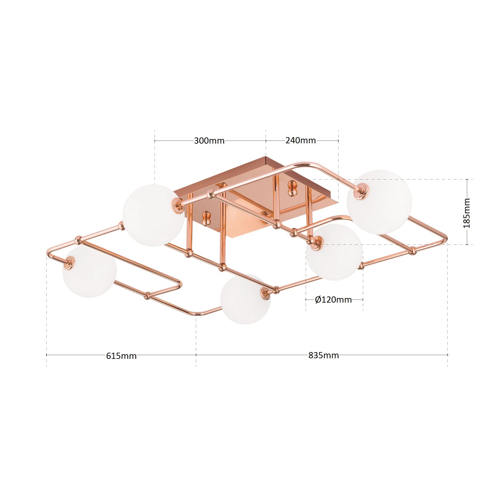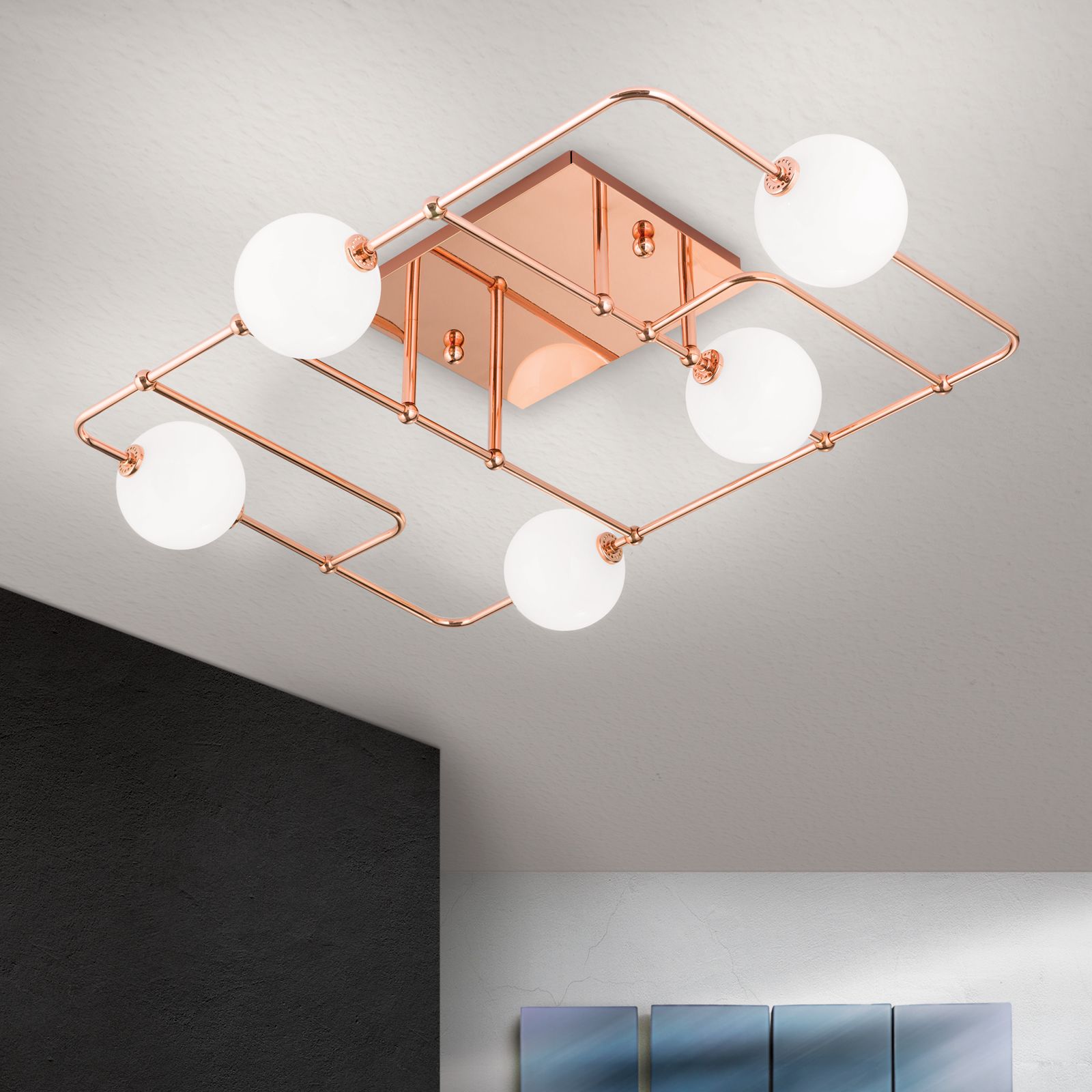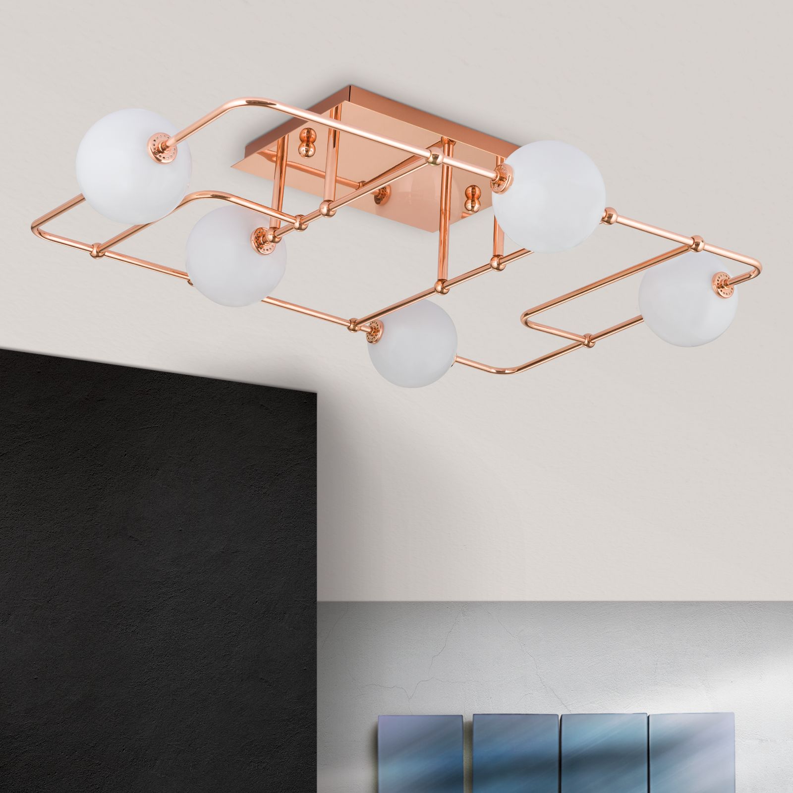 Deckenleuchte PIPES, Kupfer mit opal-glänzenden Gläsern