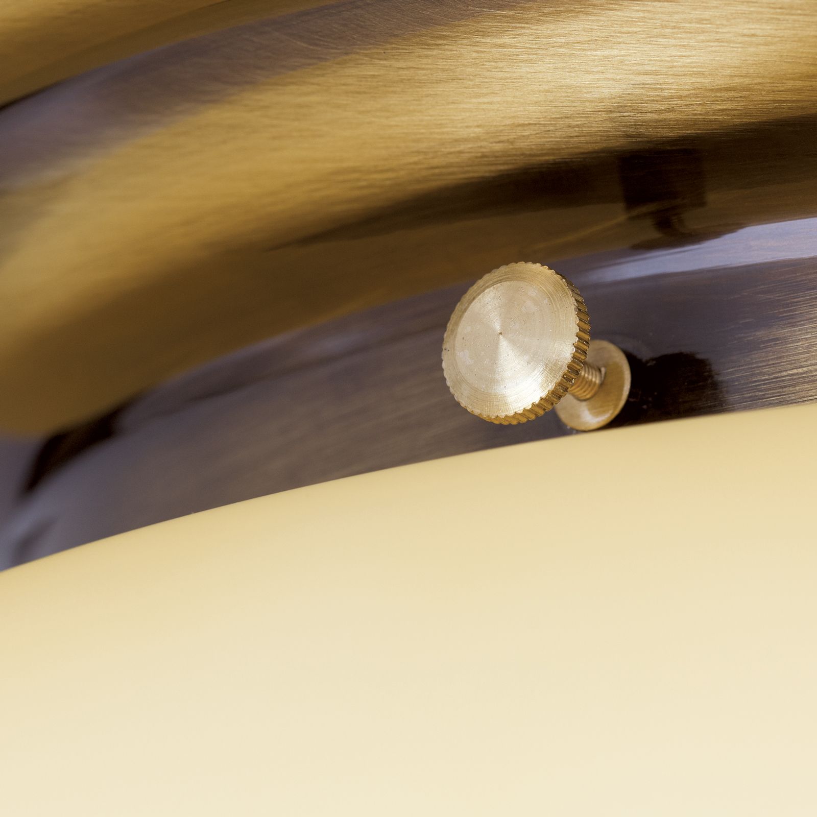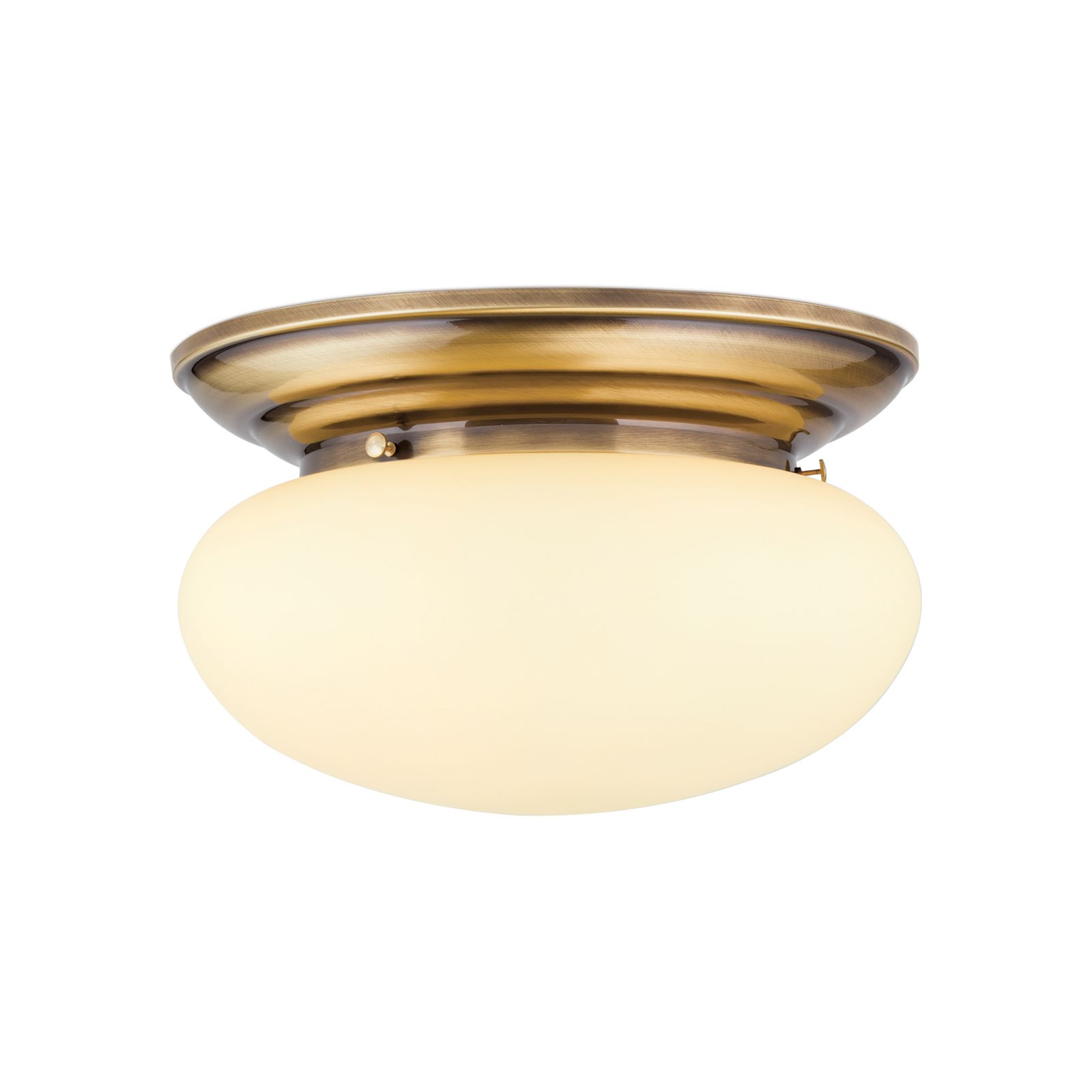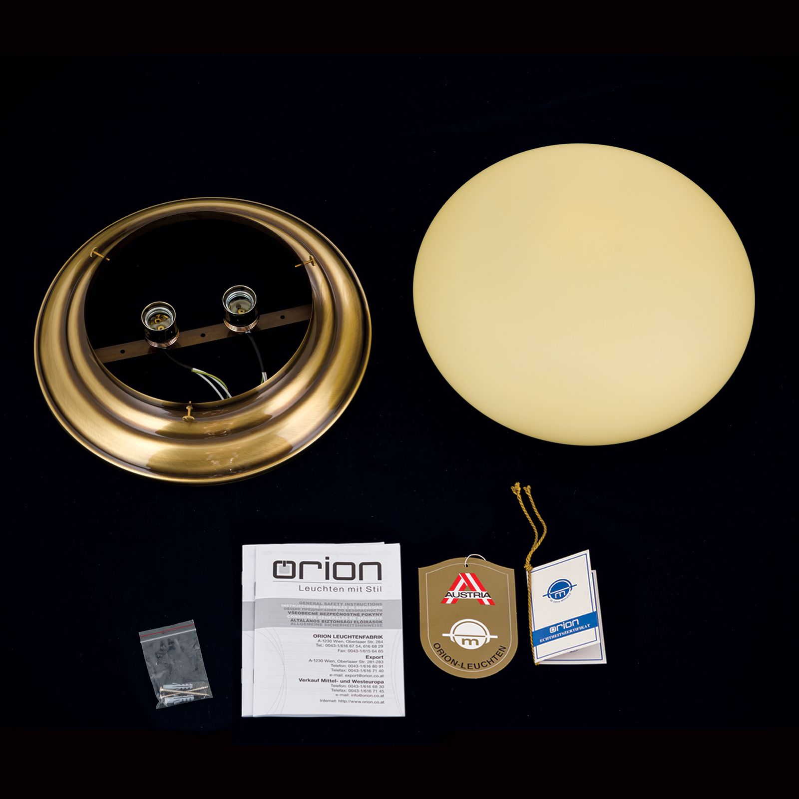Die Deckenleuchte aus der WIENER NOSTALGIE-Serie verfügt über einen Durchmesser von 40 Zentimetern. Diese erlaubt den Einsatz in großen Fluren, Schlaf-, Esszimmern und überall dort, wo eine starke Grundbeleuchtung gewünscht ist. Die reflektierende Eigenschaft des Messingkorpus lässt die Leuchte selbstbewusst als Einrichtungselement in Erscheinung treten. Die sanfte, ebenmäßige Lichtstreuung durch den matten Glasschirm taucht jedes stilvolle Interieur in eine sanft gedämpfte Atmosphäre. Die Leuchte ist mit zwei E27-Fassung zu je maximal 60 Watt ausgestattet. Die Verwendung von energieeffizienten LED-Lampen gewährleistet die Reduktion von Strom und Kosten.