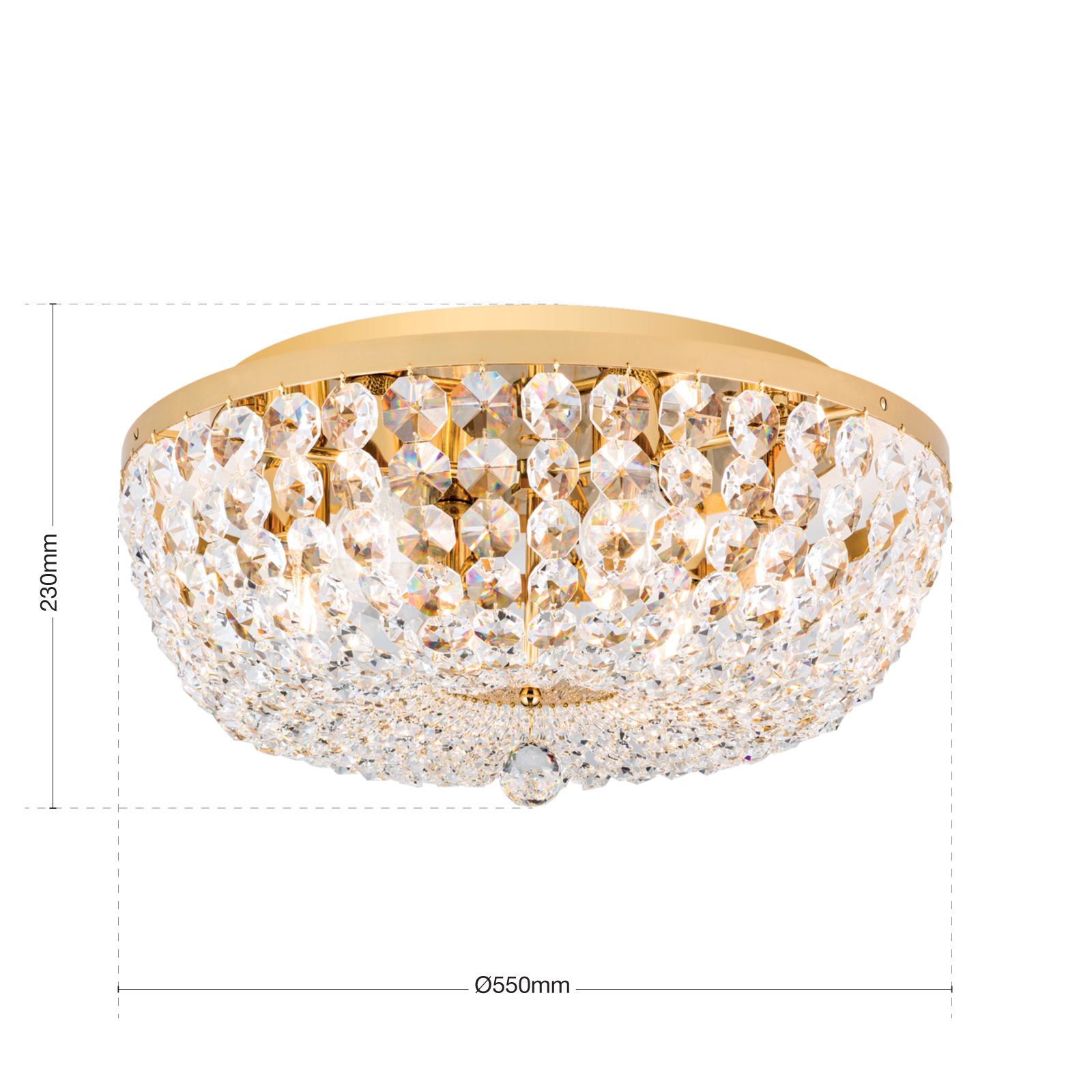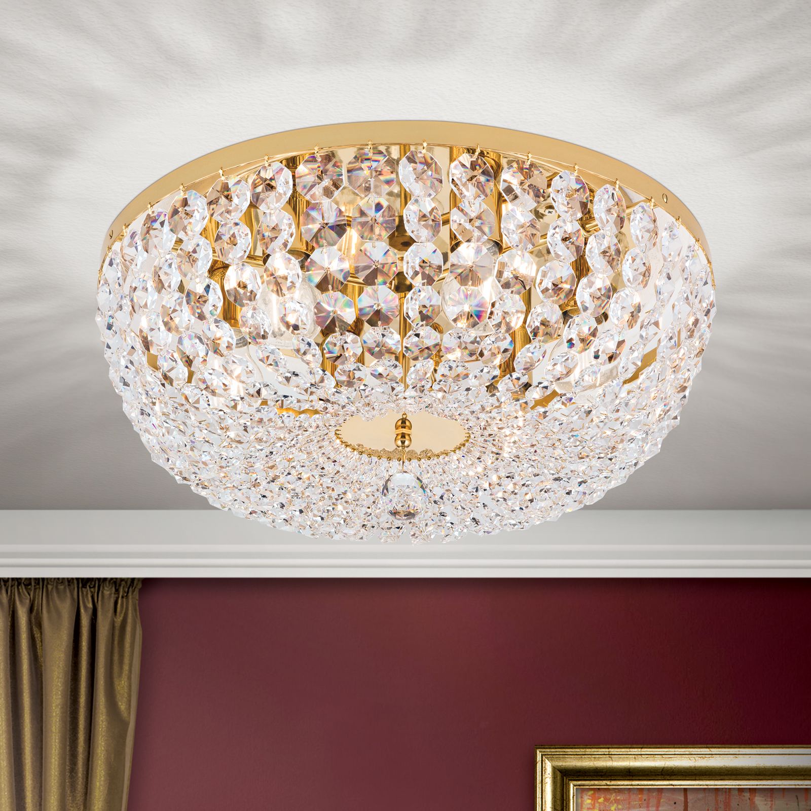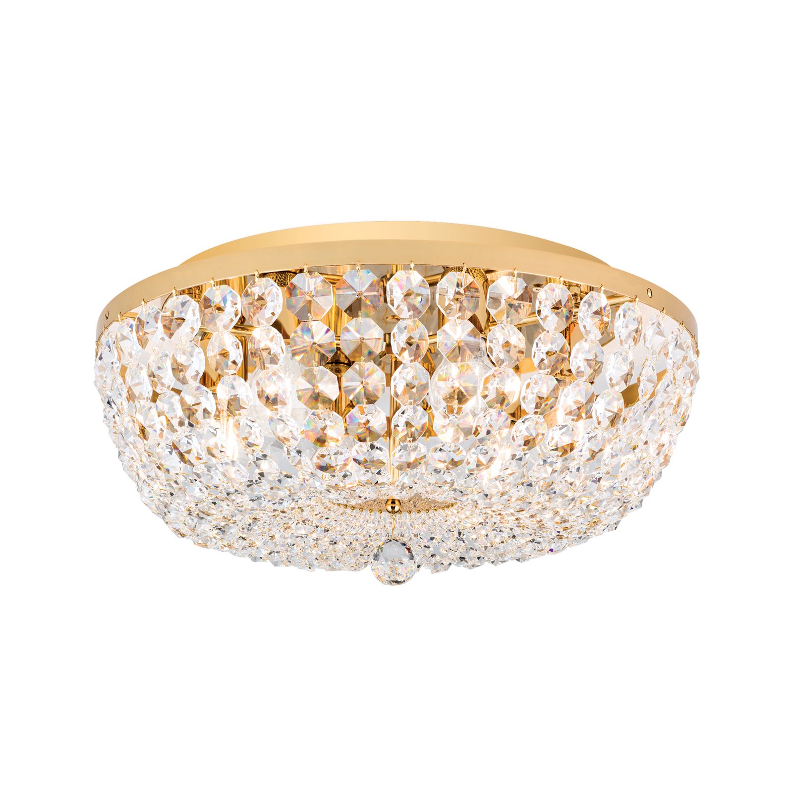 Die 24-Karat vergoldete Deckenplatte aus Vollmessing mit einem Durchmesser von 55 cm trägt einen Messingring, welcher eine Vielzahl an Kristallketten in Koppenform trägt. Die Ketten verlaufen schön geschwungen zur Mitte, wo sie auf eine facettierte Kristallkugel treffen, die für das gewisse Etwas sorgt.