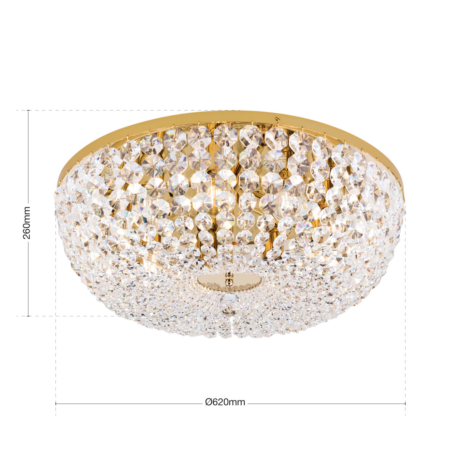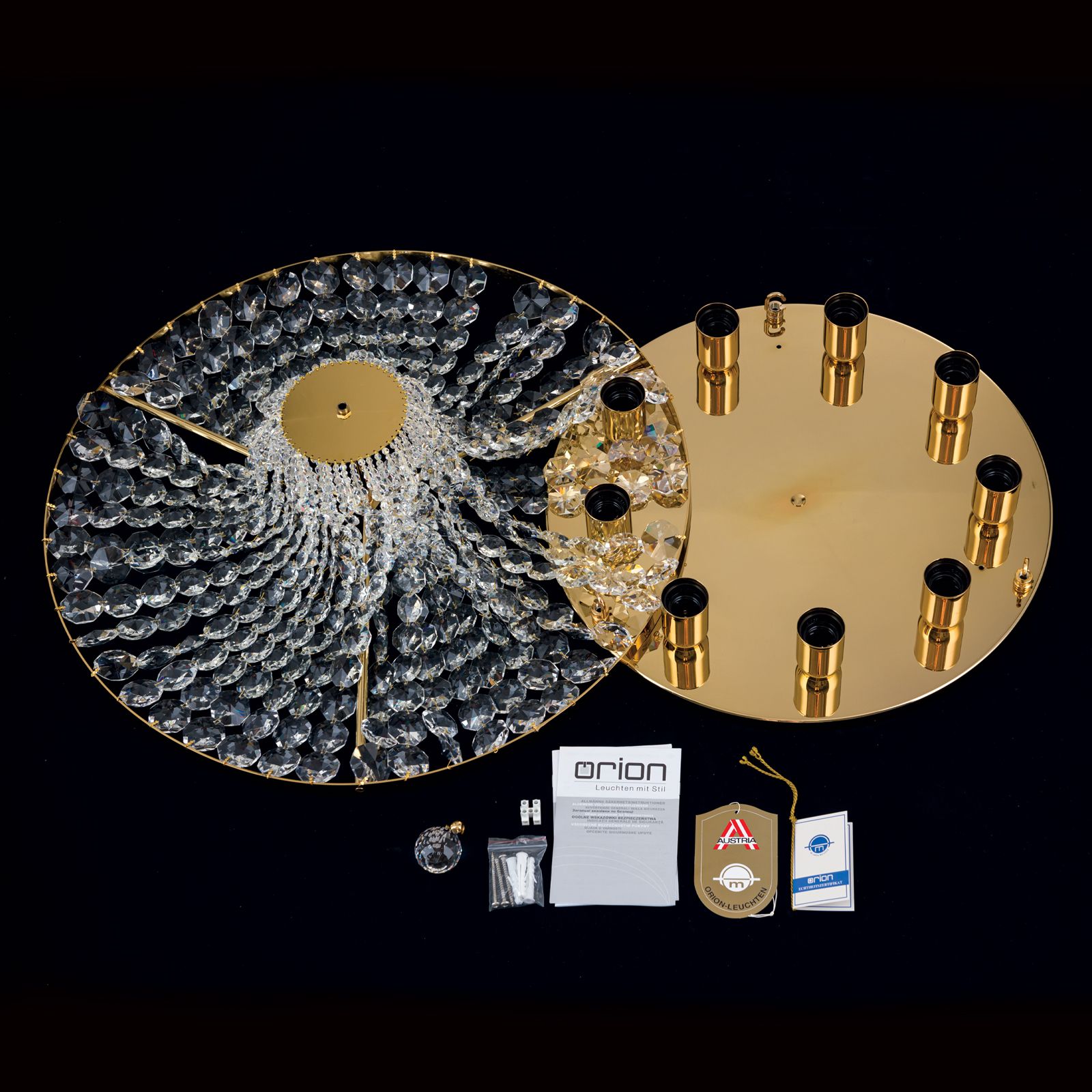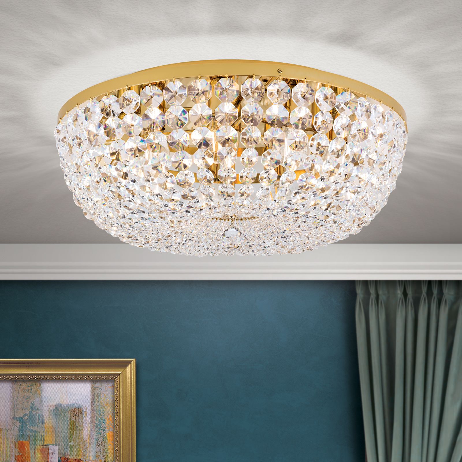 Bestehend aus einer vergoldeten Deckenplatte trägt er unzählige Kristalle, die zu Ketten verbunden mittig zusammenlaufen, wo sie auf eine facettierte Kristallkugel treffen und gemeinsam um die Wette strahlen. Versteckt hinter den beeindruckenden Kristallen sitzen die 9 E27-Fassungen, die mit maximal 60 Watt je Fassung betrieben werden. Für die Regulierung der Lichtintensität kann die Leuchte mit einem Dimmer kombiniert werden.