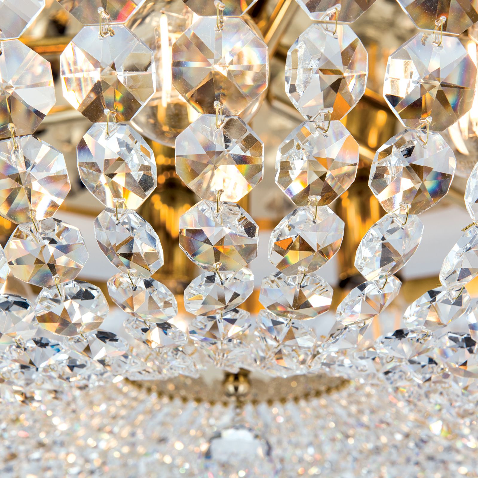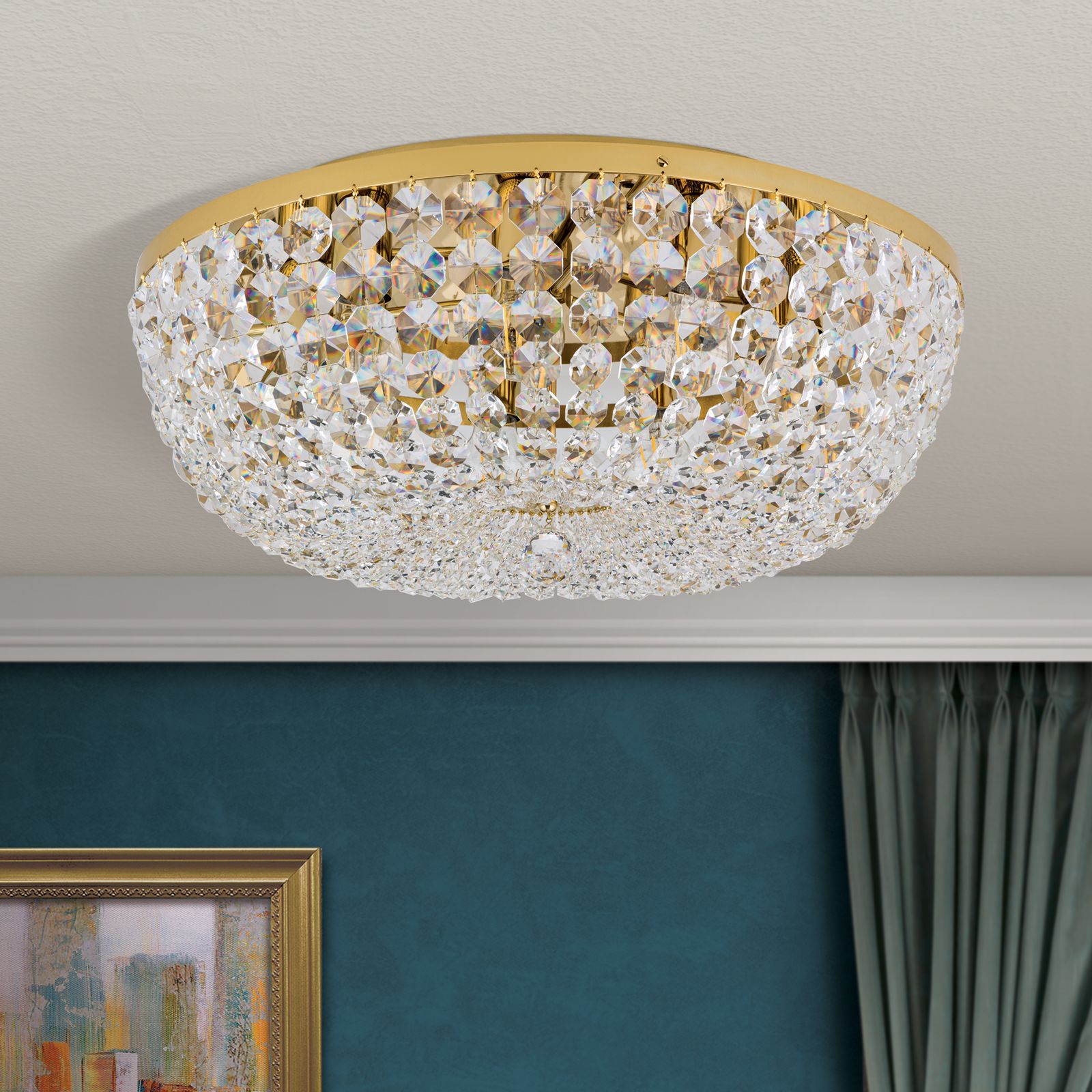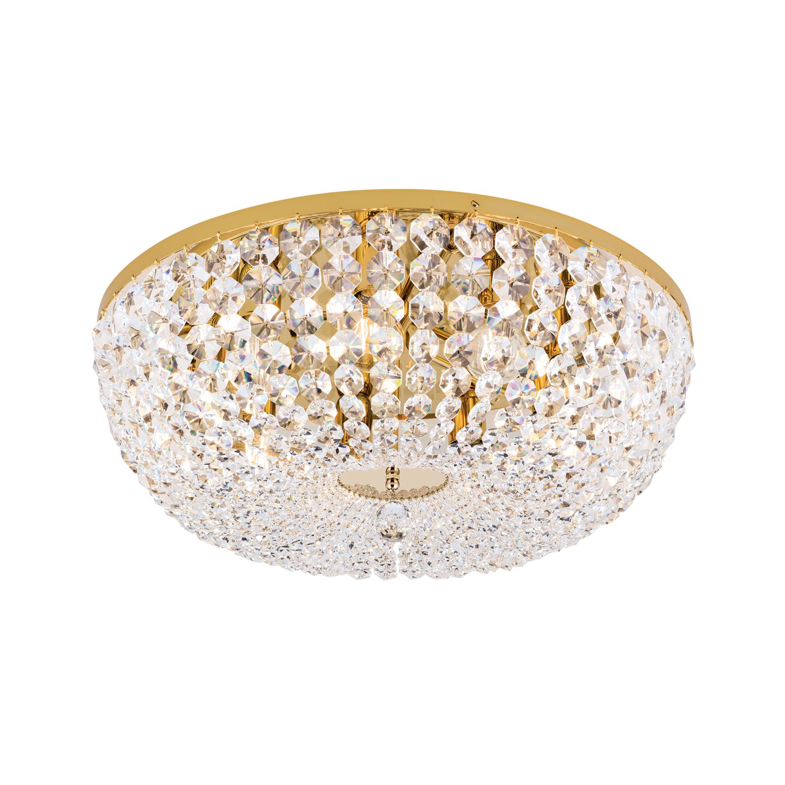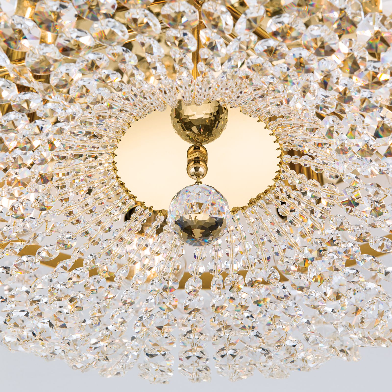 Bestehend aus einer vergoldeten Deckenplatte trägt er unzählige Kristalle, die zu Ketten verbunden mittig zusammenlaufen, wo sie auf eine facettierte Kristallkugel treffen und gemeinsam um die Wette strahlen. Versteckt hinter den beeindruckenden Kristallen sitzen die 9 E27-Fassungen, die mit maximal 60 Watt je Fassung betrieben werden. Für die Regulierung der Lichtintensität kann die Leuchte mit einem Dimmer kombiniert werden.
