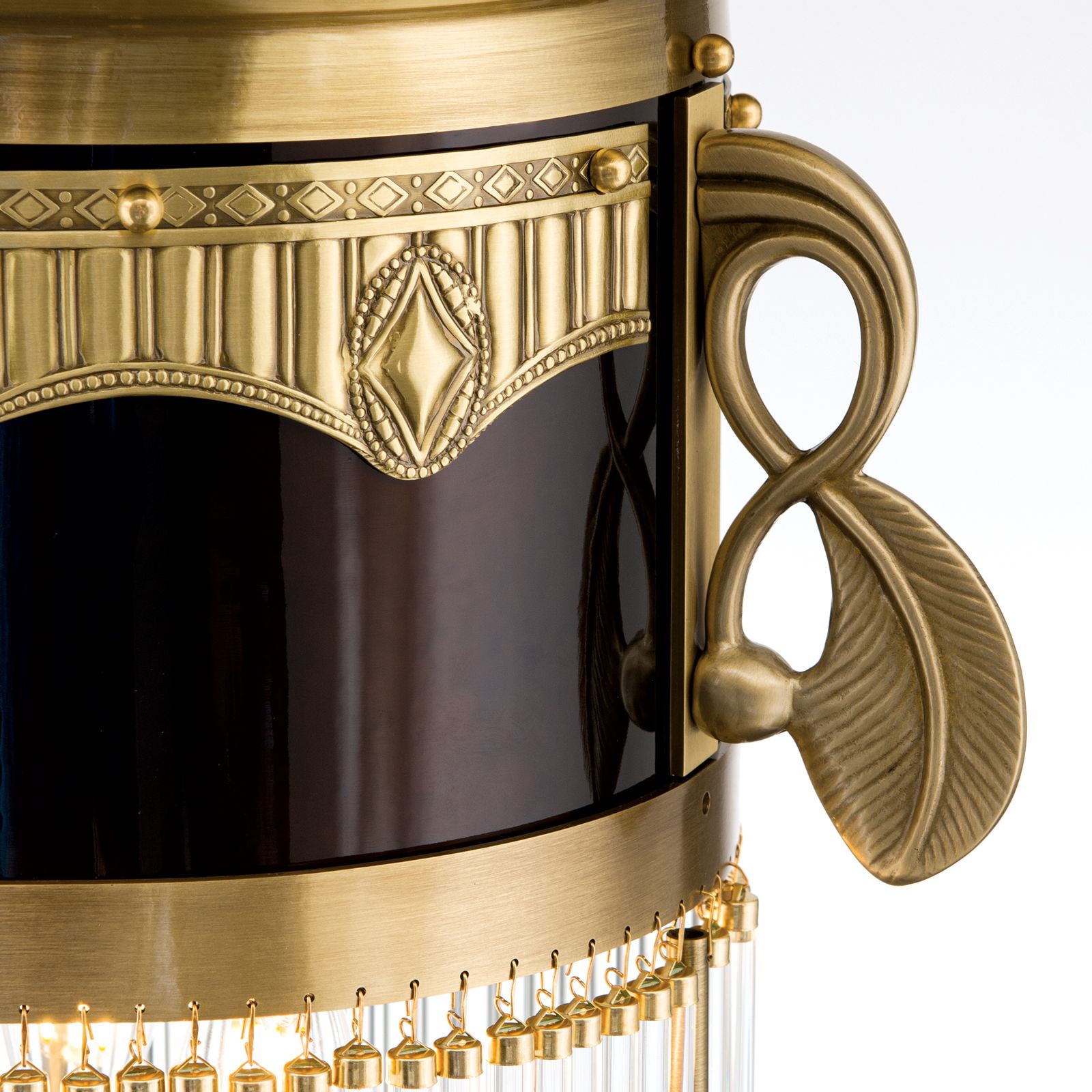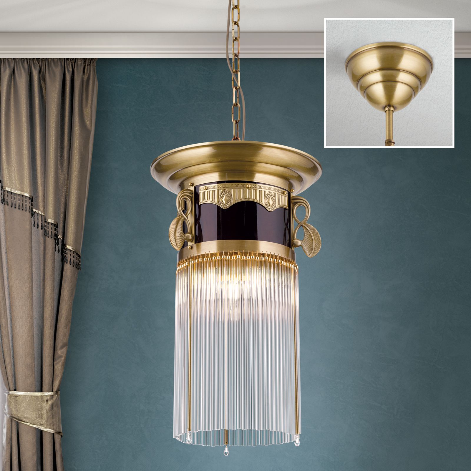 Die Hängeleuchte aus der ADELE-Reihe ist mit ihrem Durchmesser von 37 Zentimetern besonders beliebt als Lichtquelle über einem Esszimmertisch, als warmes Entree in einem Vorraum und als stilvolle Beleuchtung in einer Küche. Das Licht wird durch die Hängestäbchen in einen Glasvorhang gehüllt, der zur Seite und besonders nachunten abstrahlt. Deshalb eignet sich die Leuchte für intime, heimelige Stimmungen. Auch das Messing erzeugt eine wohlige Stimmung. Die Blattverzierungen und das Zierband der Einfassung runden das stilvolle Ensemble ab.