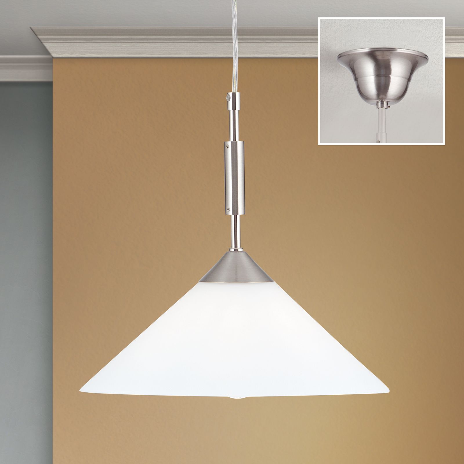 Ein flacher Kegelschirm aus satiniertem Glas und eine Fassung aus Messing bilden die einfachen und schlichten Komponenten der einflammigen Hängeleuchte. Sie lässt sich in nahezu jedes Farb- und Einrichtungskonzept integrieren und strahlt angenehmes Licht in die Umgebung und nach unten ab. So eignet sie sich hervorragend für die Beleuchtung von Tischen und Theken und kann hervorragend mit Kopfspiegellampgen kombiniert werden, die vor Blendung schützen.