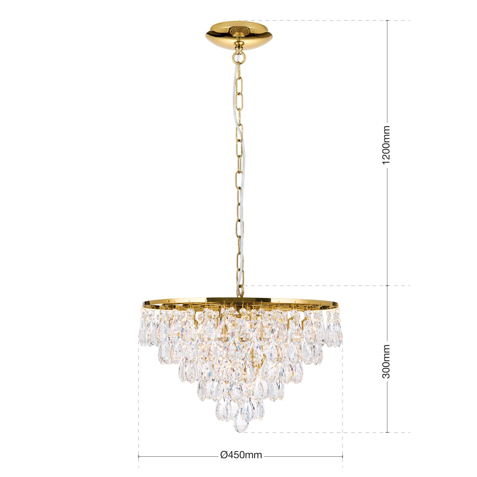 Von der Decke an einer Kette herabhängend findet sich ein Metallgestell mit einem Durchmesser von 45 Zentimetern, an dem kaskadenförmig Kristalle in Tropfenform zur Mitte finden. Das glänzende Gestell intensiviert das betörende Funkeln des Kristallbehangs und sorgt für ein unglaubliches Lichtspiel.