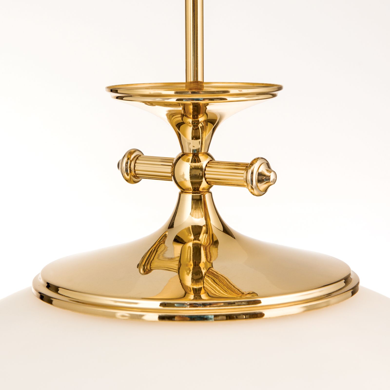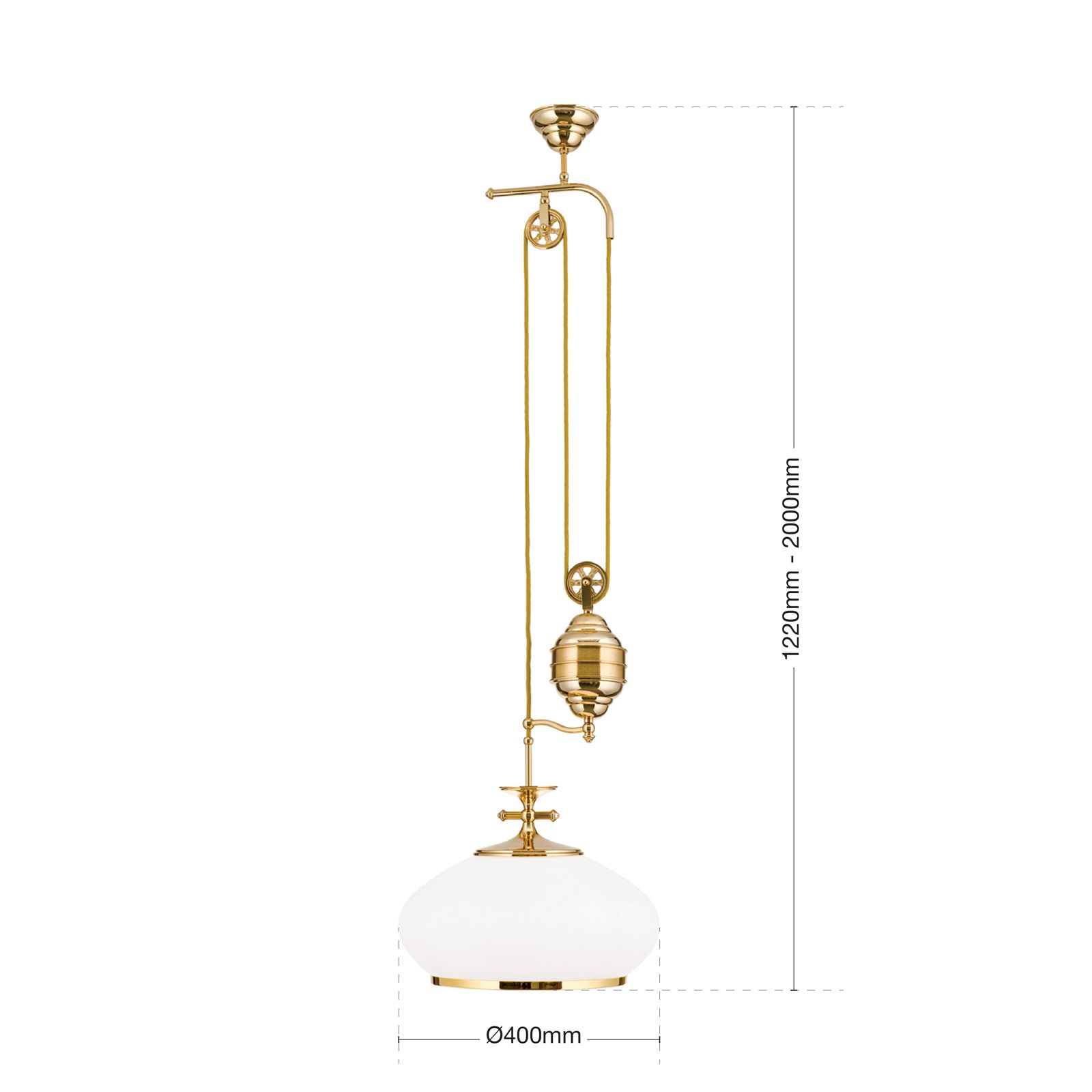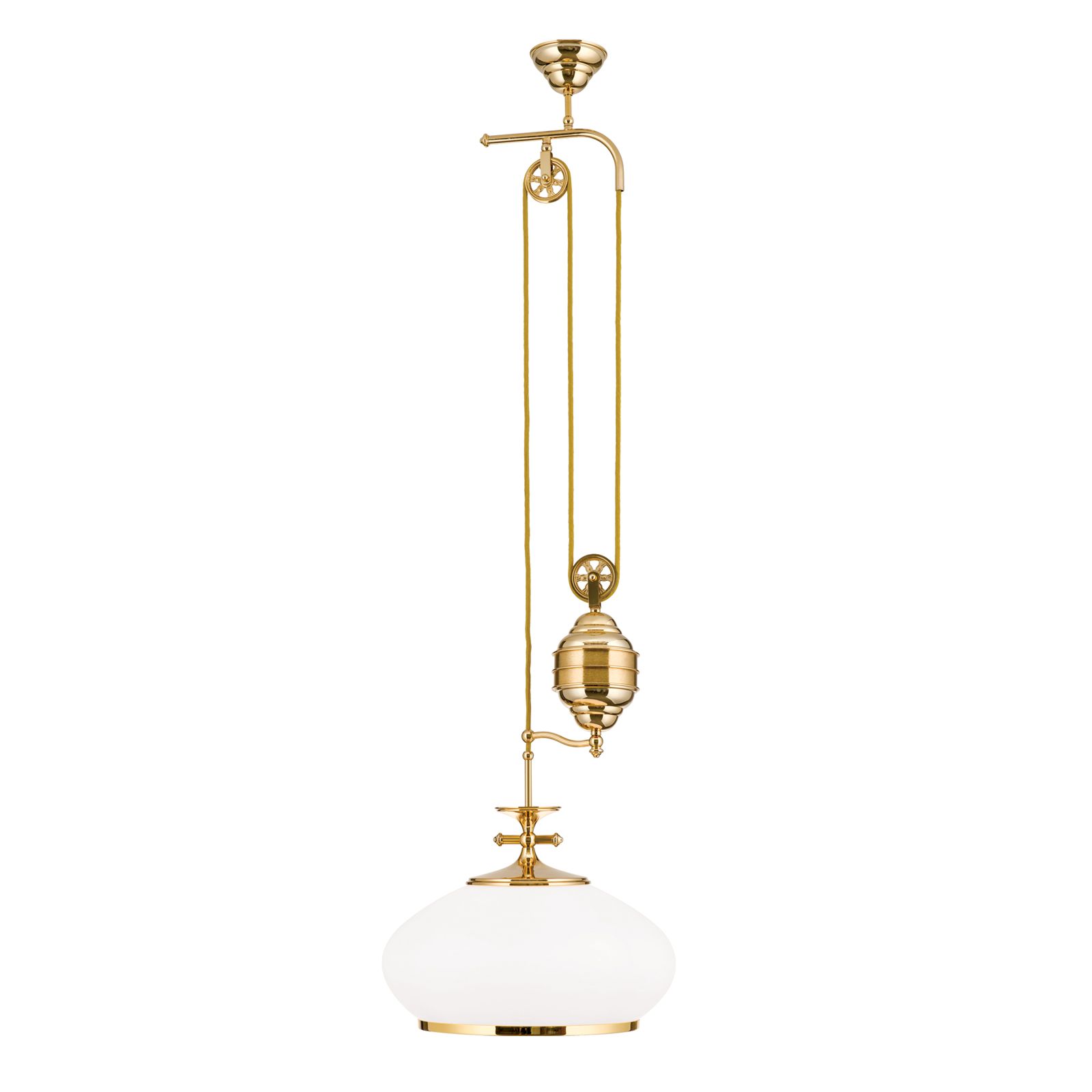 Die Hängeleuchte aus der Serie EMPIRE überzeugt nicht nur durch ihre klassische, ewig junge Form, sondern auch durch die Flexibilität des Einsatzes. Der Zug erfolgt über eine mit einem Gewicht beschwerte Umlenkrolle, wodurch die Höhe ohne Kraftanstrengung verstellt werden kann. Das Gewicht verfügt am unteren Ende über einen Abstandhalter, der gleichzeitig als Kabelführung dient. Ein Griff unter der Messingeinfassung des Schirmes ermöglicht die komfortable Bedienung. Das warmmatte Licht eignet sich zur sanften Rundumausleuchtung eines stilvoll eingerichteten Raumes bei stark konzentrierter Beleuchtung unterhalb der Schirmöffnung. Mit einer E27-Fassung für bis zu 75 Watt ist für satte Lichtleistung gesorgt.