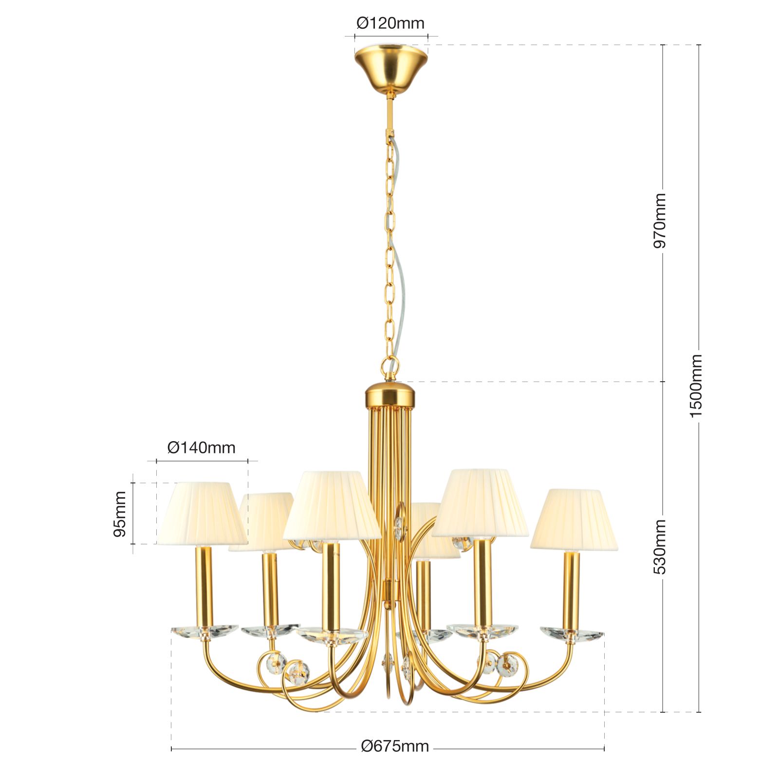 Die Fassungen des Kronleuchters sind für E14-Leuchtmittel ausgelegt und bieten Ihnen Flexibilität bei der Wahl Ihrer Beleuchtung. Sie können den Look des Kronleuchters weiter anpassen, indem Sie entweder weiße Schirme für die dunkel-nickel-matte Oberfläche oder champagnerfarbene Schirme für die gold-matte Oberfläche hinzufügen. Alternativ können Sie sich für ein schirmloses Design entscheiden, um den vollen Glanz zur Geltung zu bringen.