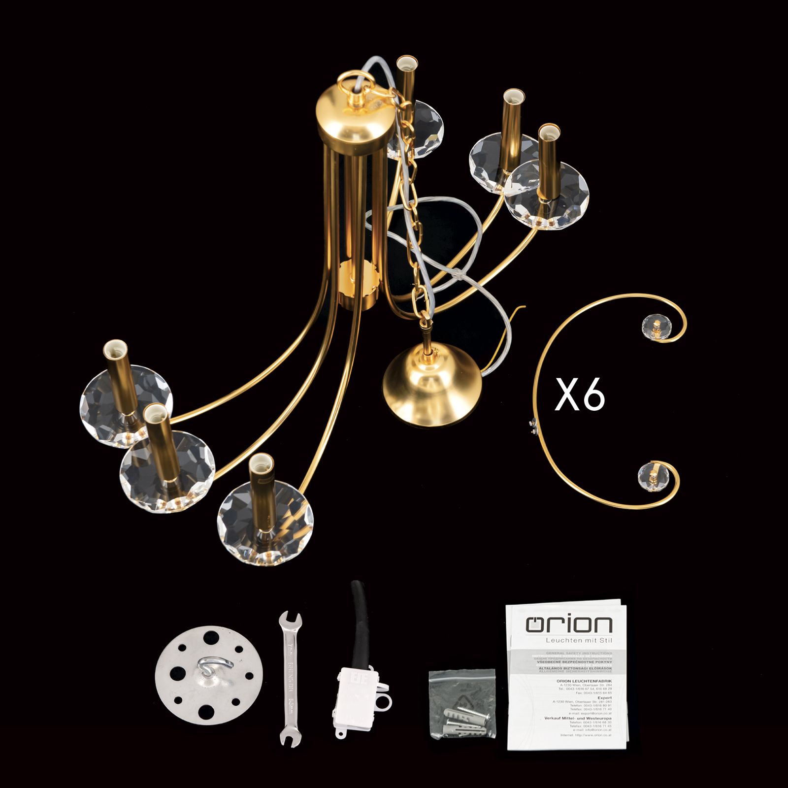 Tauchen Sie ein in zeitlose Eleganz mit dem Design by ORION Kristallluster ARIANE. Dieser 6-flammige Kronleuchter verkörpert klassischen Stil und zeitlose Schönheit, perfekt geeignet, um Ihrem Raum einen Hauch von Raffinesse zu verleihen. Erhältlich in einer gold-matten oder dunkel-nickel-matten Oberfläche, passt dieser Kronleuchter zu verschiedenen Einrichtungsstilen und Farbschemata.