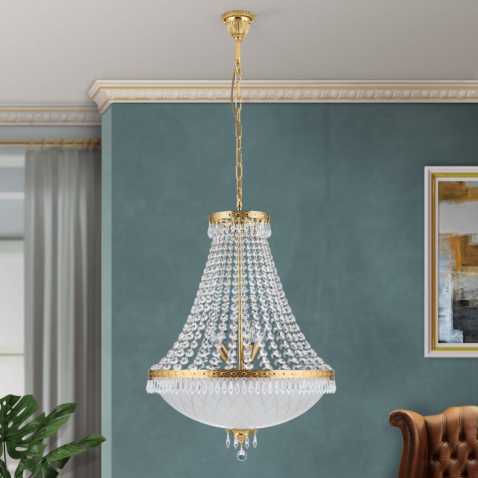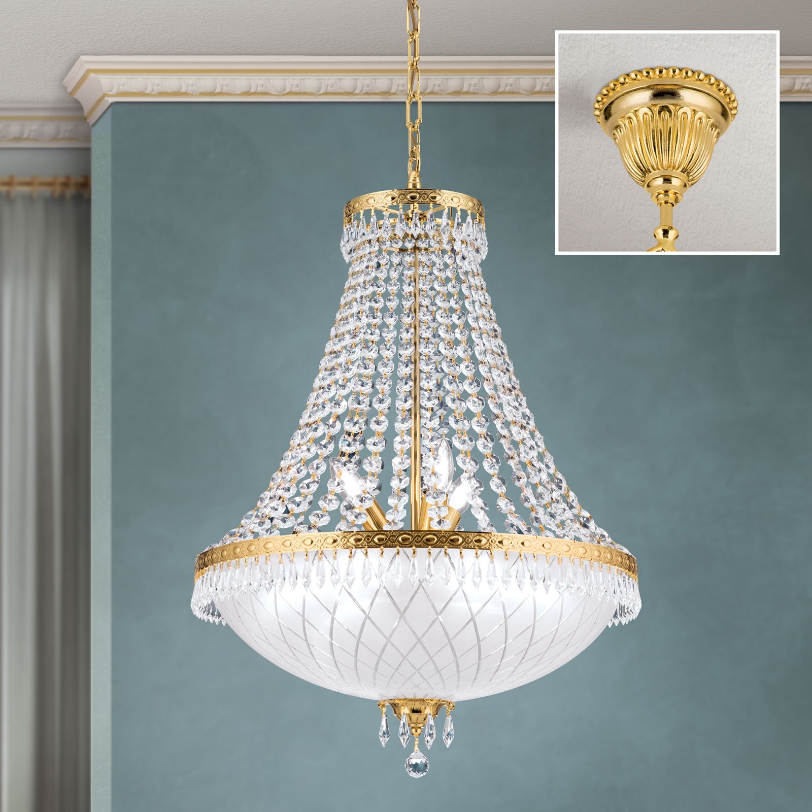 Behagliches Licht und einzigartige Lichtreflexionen lassen sich durch den repräsentativen Kronleuchter EMPIRE CRYSTAL erzeugen. Repräsentative Räumlichkeiten wie Eingangsbereiche, Empfangsräume oder Salons bieten den Raum, um seine volle Wirkung zu entfalten. An einer kunstvoll gestalteten Deckenrosette hängt das Gestell aus Vollmessing mit einer Gesamthöhe von 153 cm, welches durch aufwendige Details geschmückt ist. Geprägte Zierbänder in Kombination mit filigranen Kristallketten aus dem Hause Schöler und einer satinierten und im Diamantschliffverfahren verzierten Glasabdeckung ergeben ein exklusives Gesamtbild, das durch die 24-Karat-Veredelung intensiviert wird.