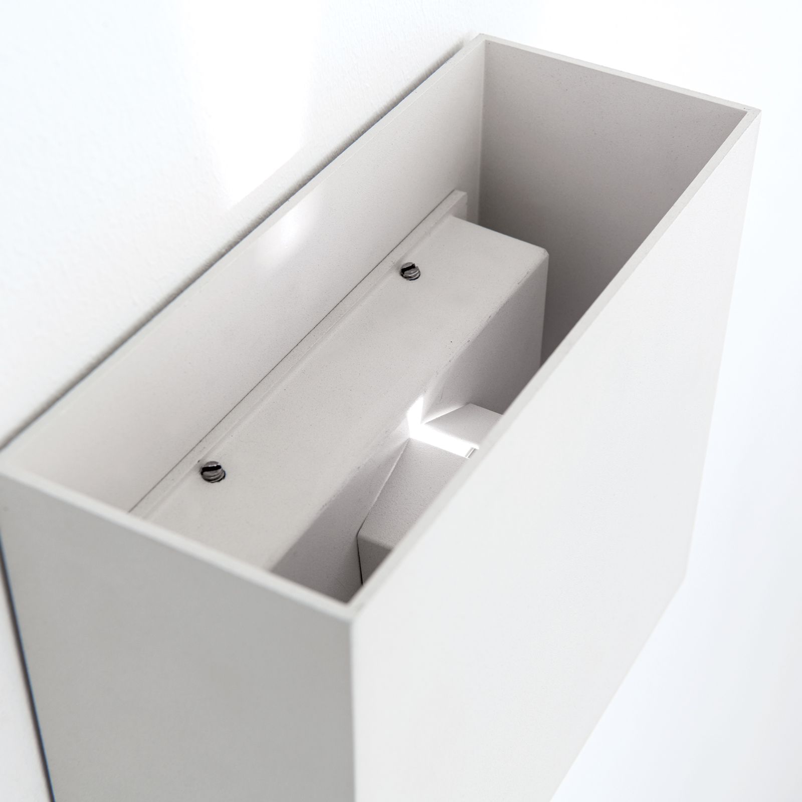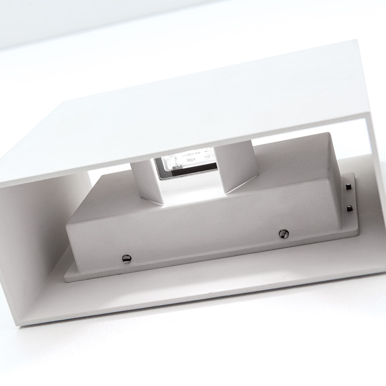 Die flache Wandleuchte AKZENT besticht durch ihre klare, geometrische Form und das direkt und indirekt strahlende Licht.