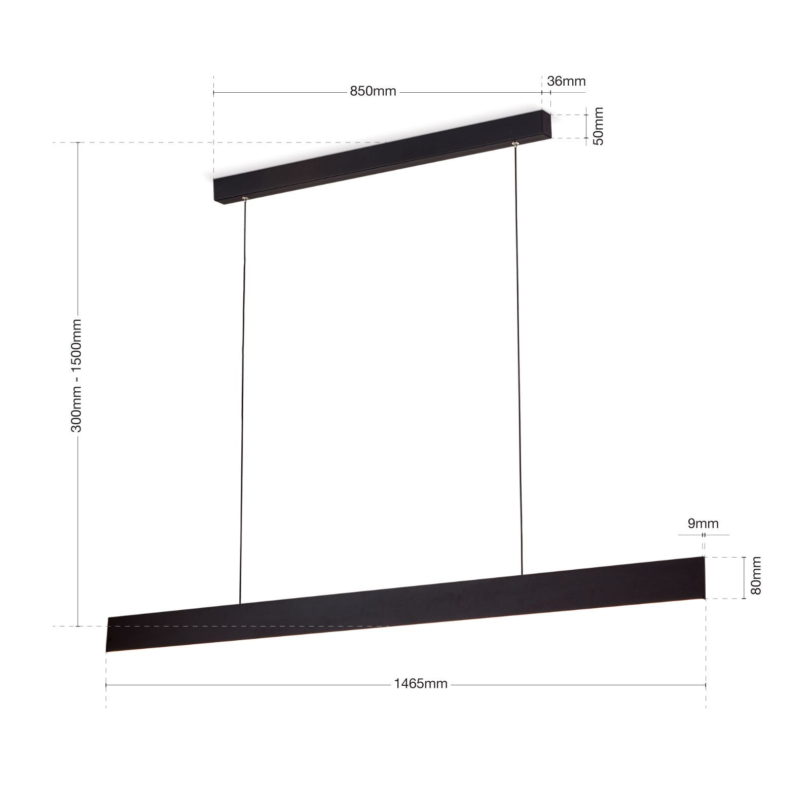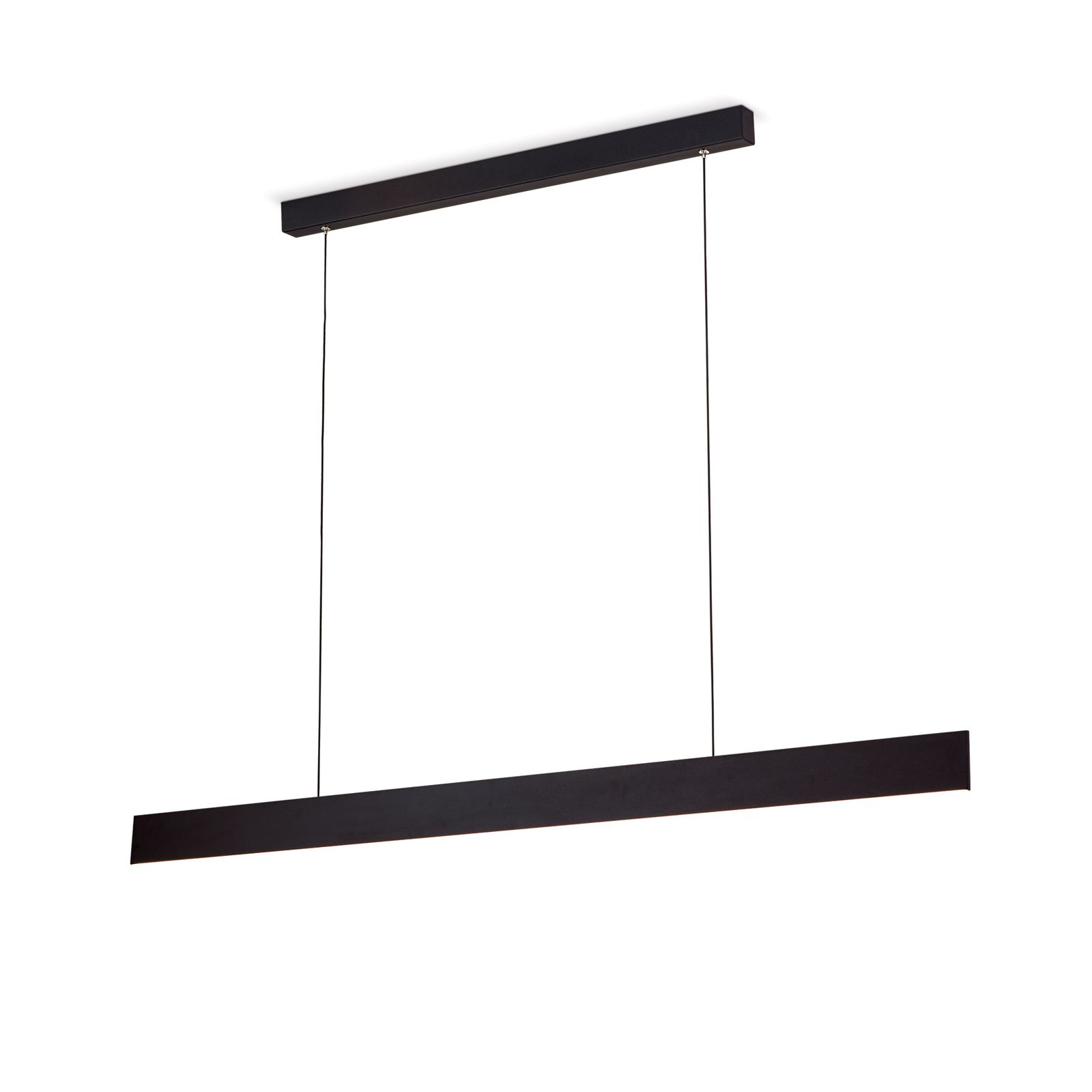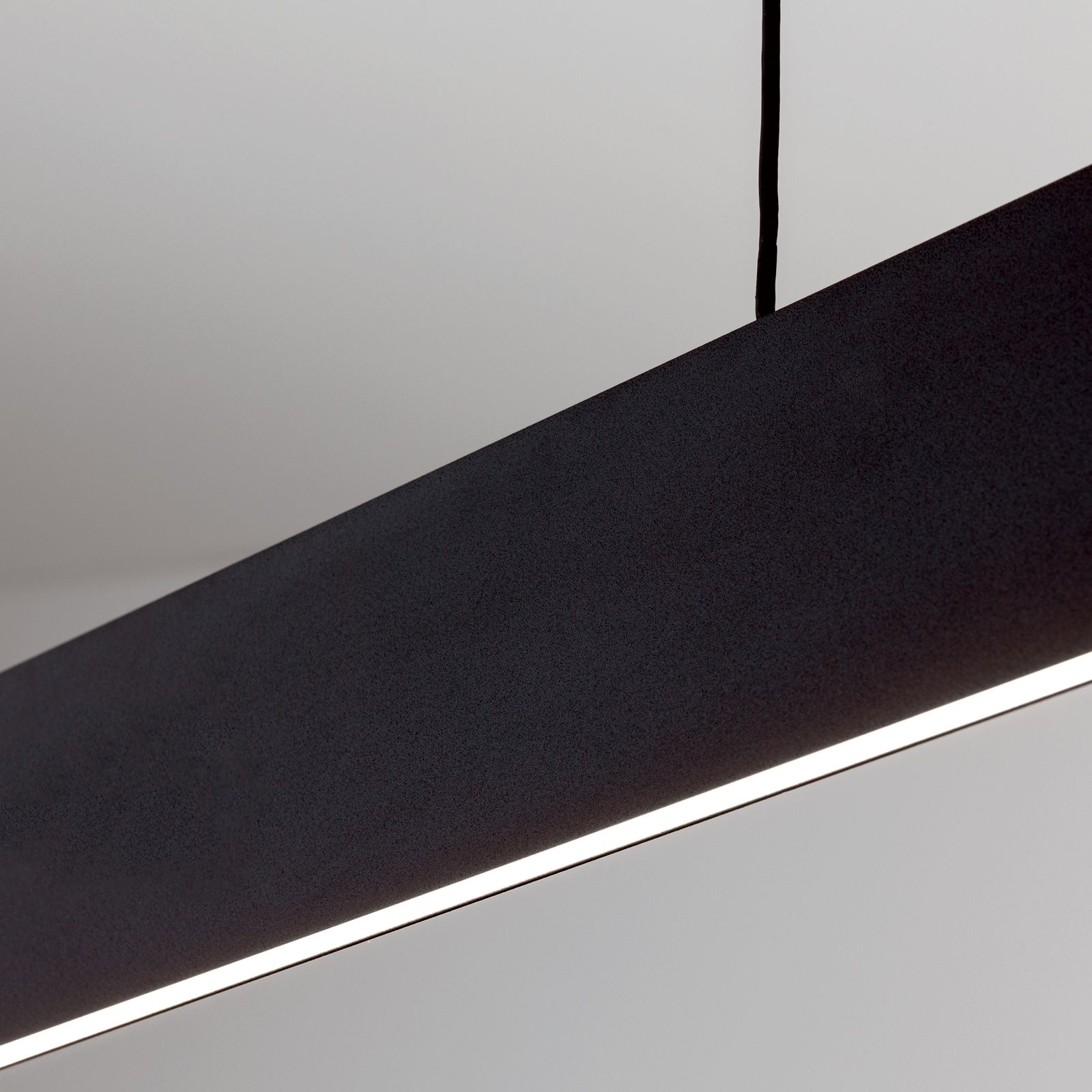 Das Zusammenspiel aus klaren Linien und Flächen bestimmt das Design der modernen LED Hängeleuchte GIDEON. Eine wahlweise mattschwarze- oder weiße Lackierung veredelt den schlanken, eineinhalb Meter langen Metallkörper der Leuchte.