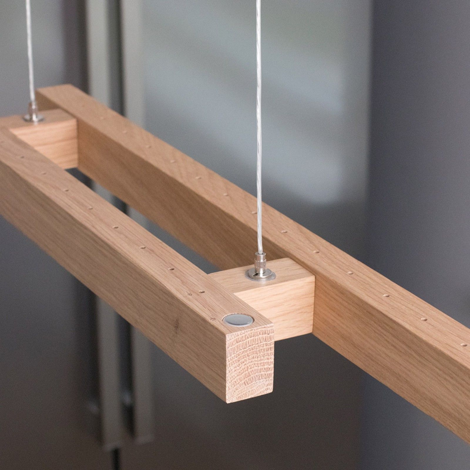 Das Gehäuse der SONAS Hängeleuchte ist aus hochwertigem Eichenholz gefertigt, was nicht nur für eine ansprechende Optik sorgt, sondern auch eine langlebige und robuste Struktur gewährleistet. Die natürliche Maserung des Holzes verleiht der Leuchte eine organische Note und macht sie zu einem echten Blickfang in jedem Raum.