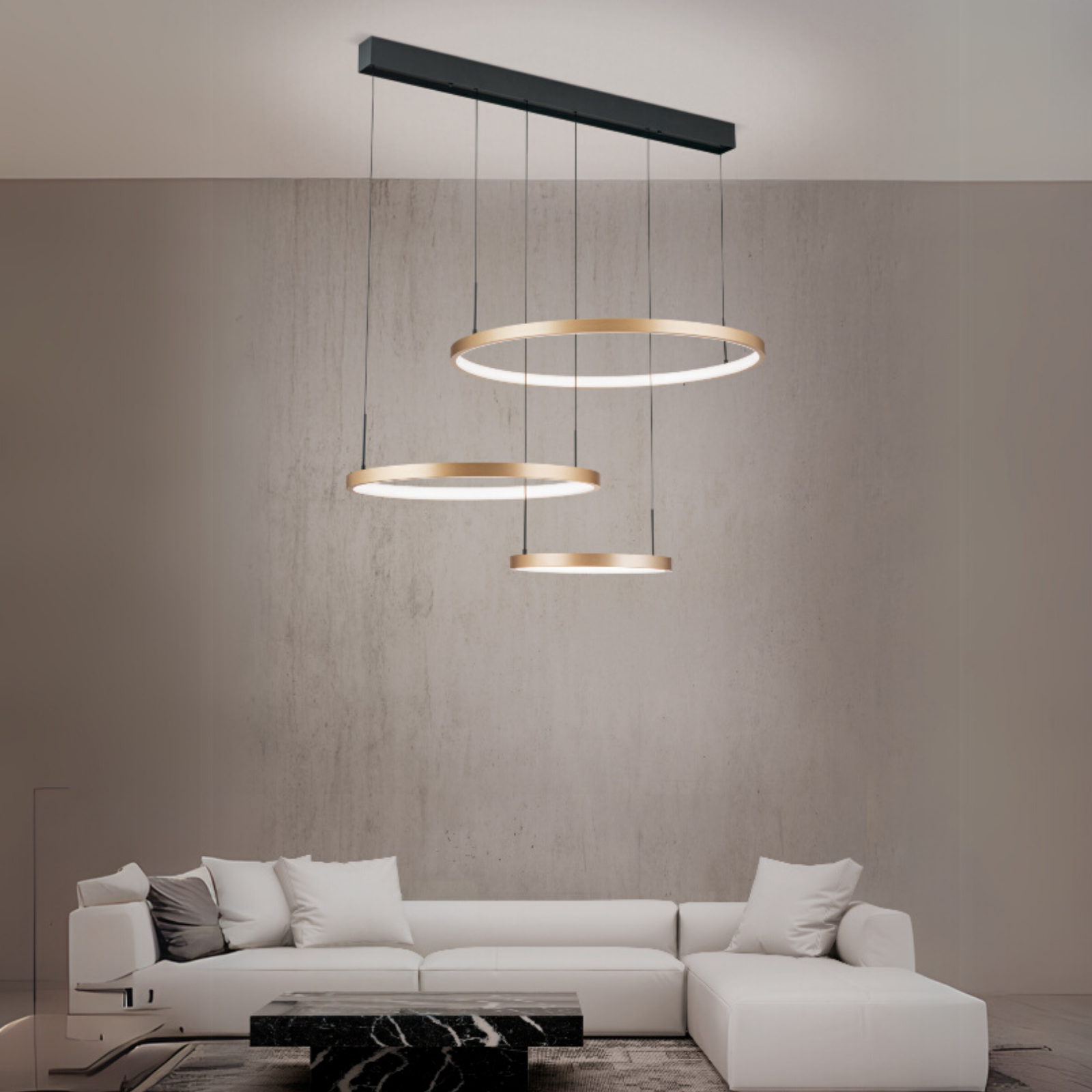 Die LED Hängeleuchte SPHERE ist ein beeindruckendes Beispiel modernen Designs mit klassischen und zeitlosen Elementen. Das schwarze Gestell der Leuchte ist elegant und unaufdringlich und bildet eine perfekte Basis für die dezenten schwarzen Abhängungen. An diesen schweben drei goldfarbene Ringe mit Durchmessern von 80cm, 60cm und 40cm, die durch ihre schlichte Eleganz bestechen.