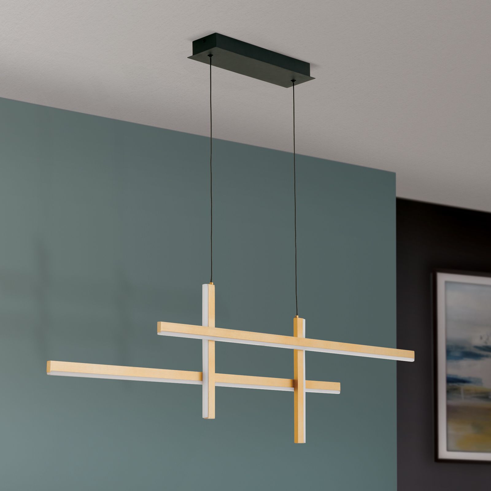 Die LED-Hängeleuchte STARTGATE überzeugt durch ihr auffälliges, lineares Erscheinungsbild. Vier über Kreuz angebrachte linienförmige LED-Element mit einem goldmatten Finish bilden den außergewöhnlichen Leuchtenkorpus. Die waagrechten Elemente geben ihr Licht nach unten ab, die senkrechten Element strahlen in den Raum. Sie sind mit schwarzen Kabeln ausgestattet, die in einem schlichten schwarzen Baldachin enden.