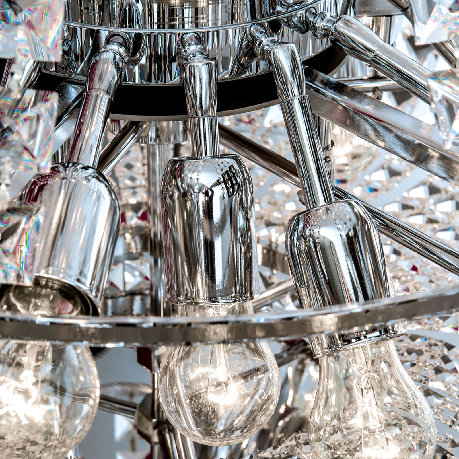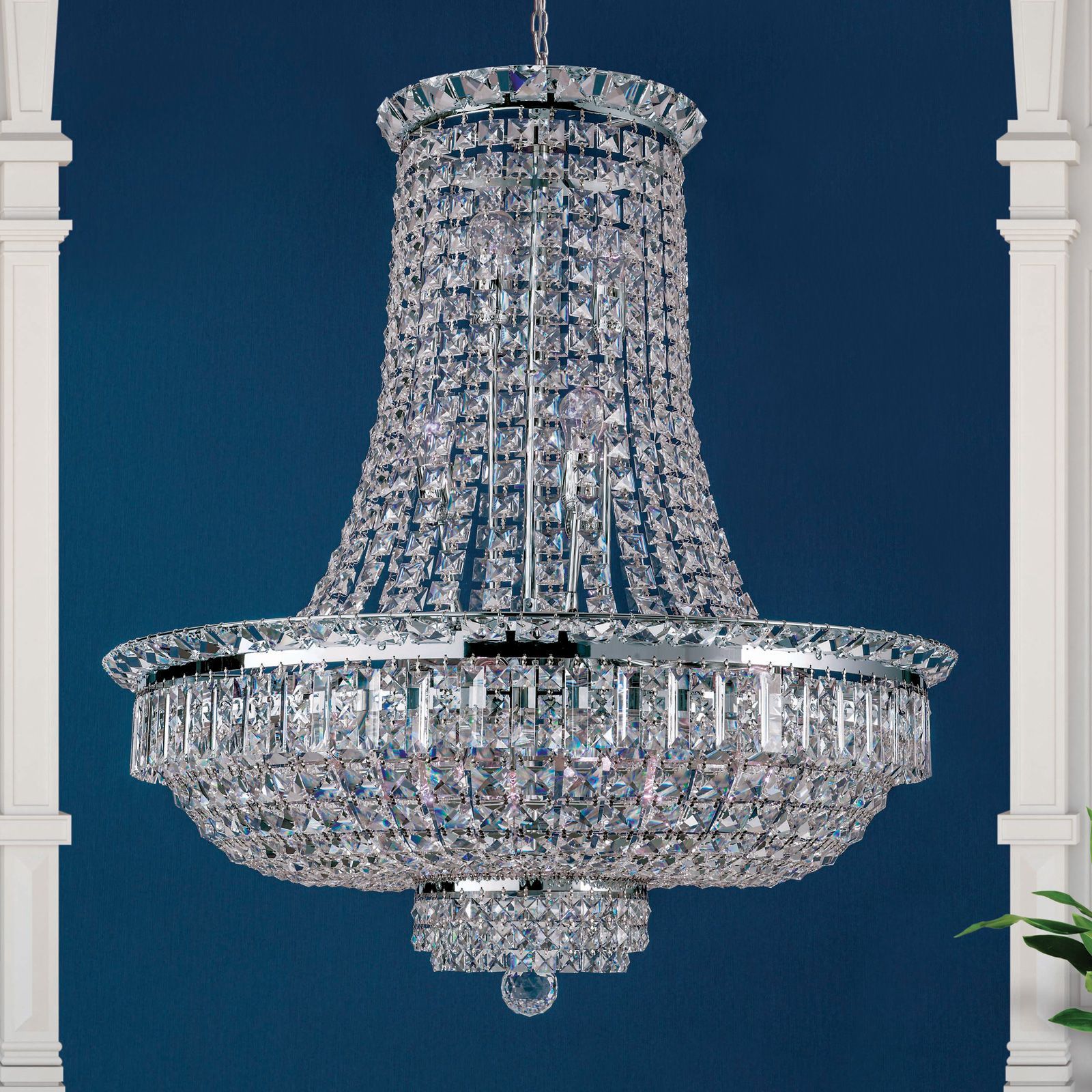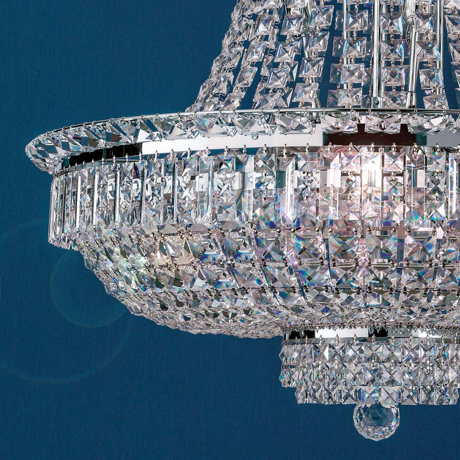 Die STRASS® Swarovski® Crystal-Kristalle in prismen- und quadratischer Form auf verschiedenen Ebenen sorgen für glanzvolle Beleuchtungseffekte und tauchen den Raum in Glitzern und Funkeln. Intensiviert wird dies durch die verchromten Vollmessingteile. Den Abschluss des Kronleuchters bildet eine große formschöne Kristallkugel, die unterhalb in der Mitte eines Kristallkranzes angebracht ist. Versteckt hinter den vielen Kristallen sitzen die beachtlichen 21 E27-Fassungen, die mit je maximal 60 Watt ausgestattet werden können.