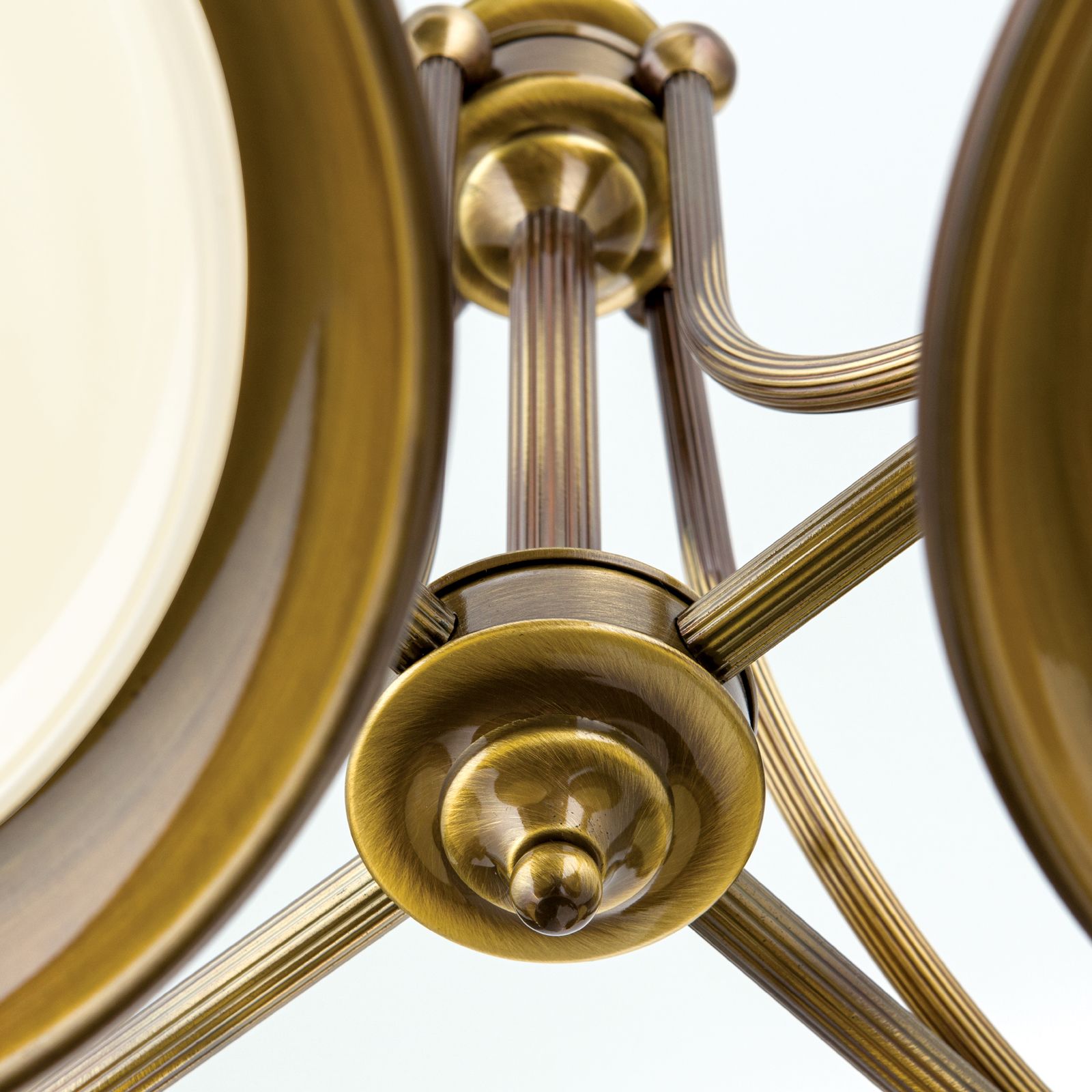 Die beiden Arme des Kronleuchters sind mit edlen champagnerfarbenen Gläsern ausgestattet, die das Licht auf zauberhafte Weise brechen und im Raum verteilen. Das Besondere an diesen Gläsern ist der eingearbeitete Patinaring, der nicht nur die Schönheit der Gläser unterstreicht, sondern dem Kronleuchter auch eine ganz besondere Note verleiht.