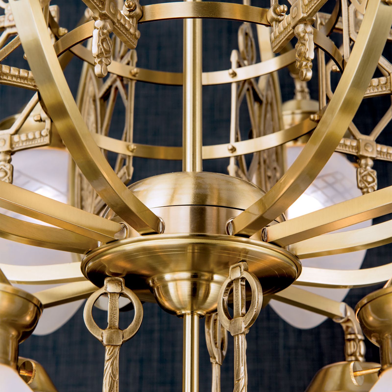 Der 28-flammige Luster aus der BUDAPEST-Kollektion rückt große Räume in ein berückend gutes Licht. Drei abwärts strahlende Lichterreigen verjüngen sich konzentrisch nach unten. Dadurch wird für eine gute allgemeine Ausleuchtung und für strahlende Beleuchtung des unteren Raumbereiches gesorgt. Die mondäne Anmutung der Messingarbeiten rührt von einem für das ungarische Art nouveau typischen Experimentierdrang. Merkmale des Secessionsstils paaren sich mit Rokoko-Motiven und traditionellen magyarischen Mustern. Die schiere Größe des Kronleuchters prädestiniert ihn für die Montage in Konferenzräumen, Sälen oder Hallen. Der Kronleuchter ist mit 28 E27-Fassungen zu je höchstens 60 Watt versehen. Energieeffiziente LED-Lampen helfen Strom und Kosten zu sparen.