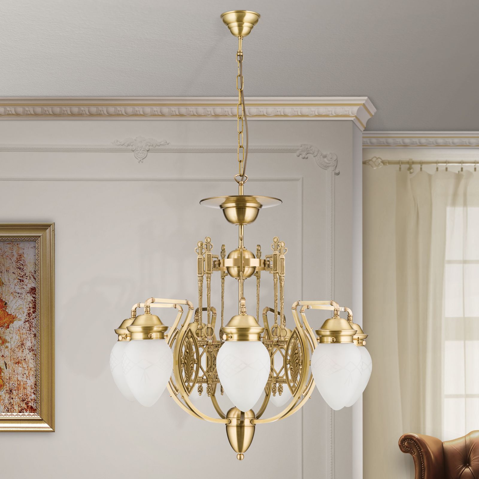 Der Luster aus der BUDAPEST-Reihe ist ein wahrhaft „königliches“ Einrichtungsobjekt. Die Anordnung der sieben Arme um eine zentrale Säule erinnert in der Tat an eine Krone. Die Säule ziert gleichsam ein Reichsapfel, um den sich Schäfte gruppieren, die die Leuchtenarme tragen. Kunstfertig geformte Bogen gehen in helmförmige Lampeneinfassungen über. Unverkennbar vom Jugendstil inspirierte Ornamente - Kränze, Rauten - und historisierendes Blattwerk runden die erfindungsreiche Komposition ab.