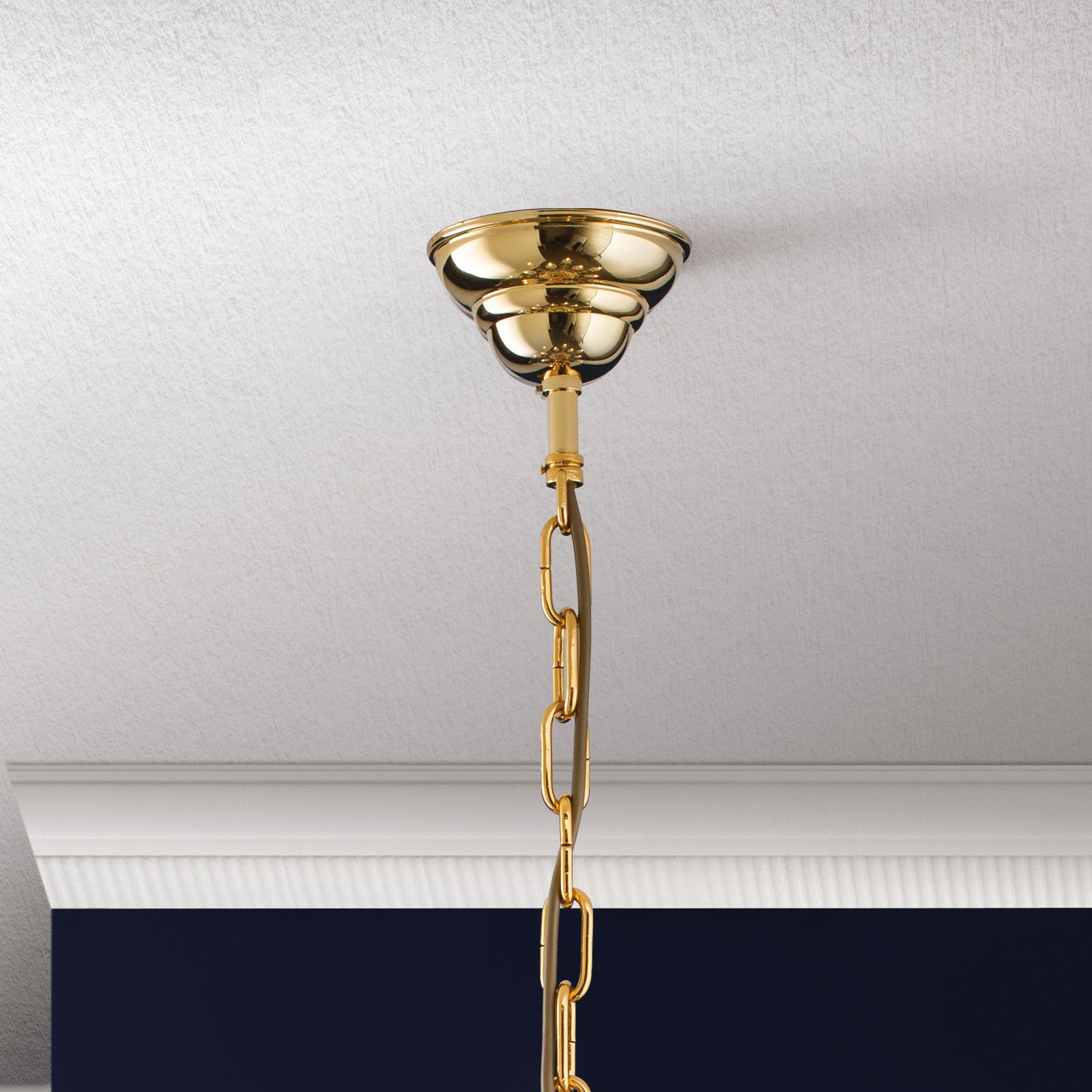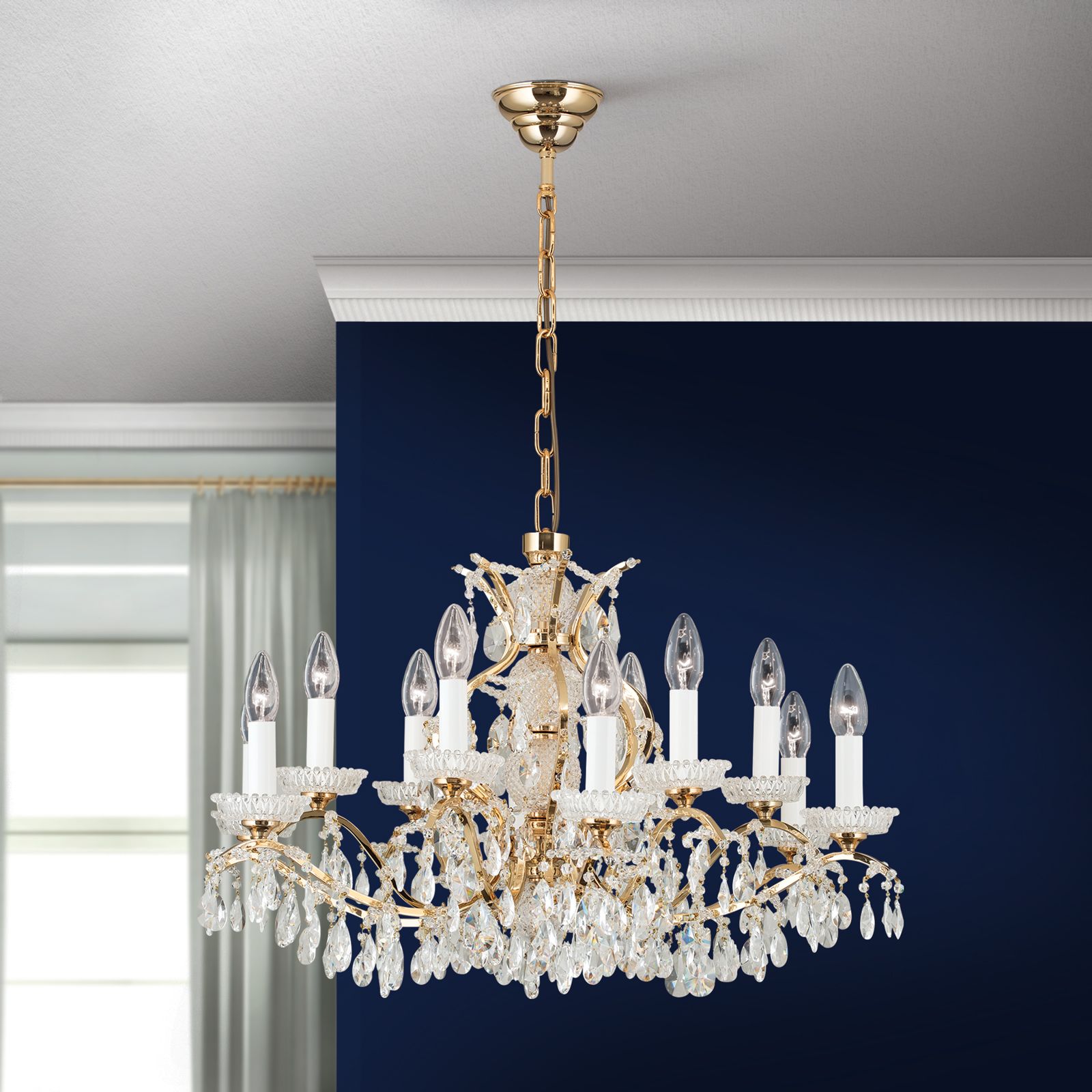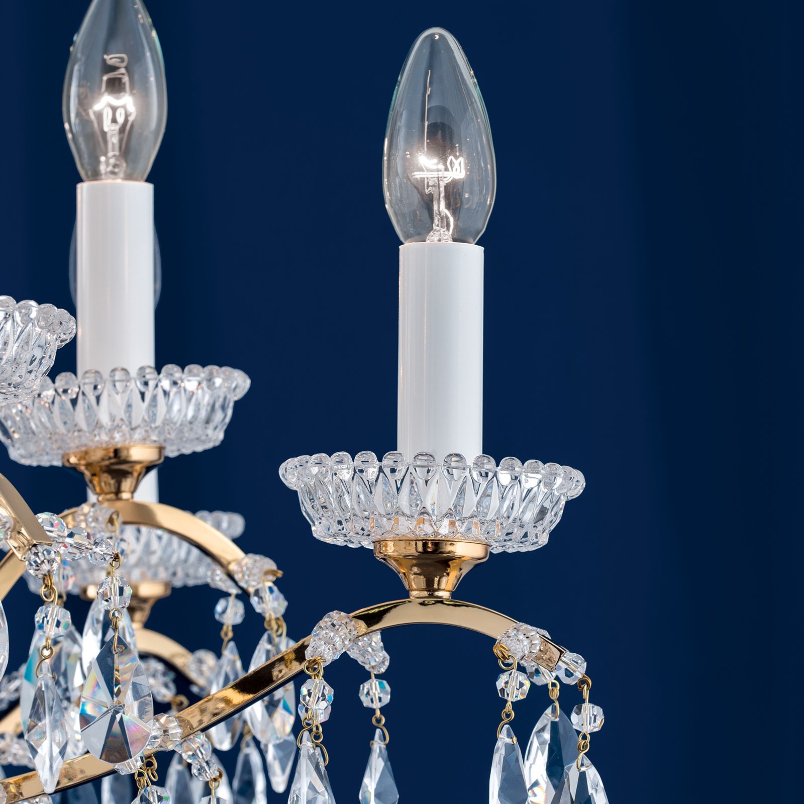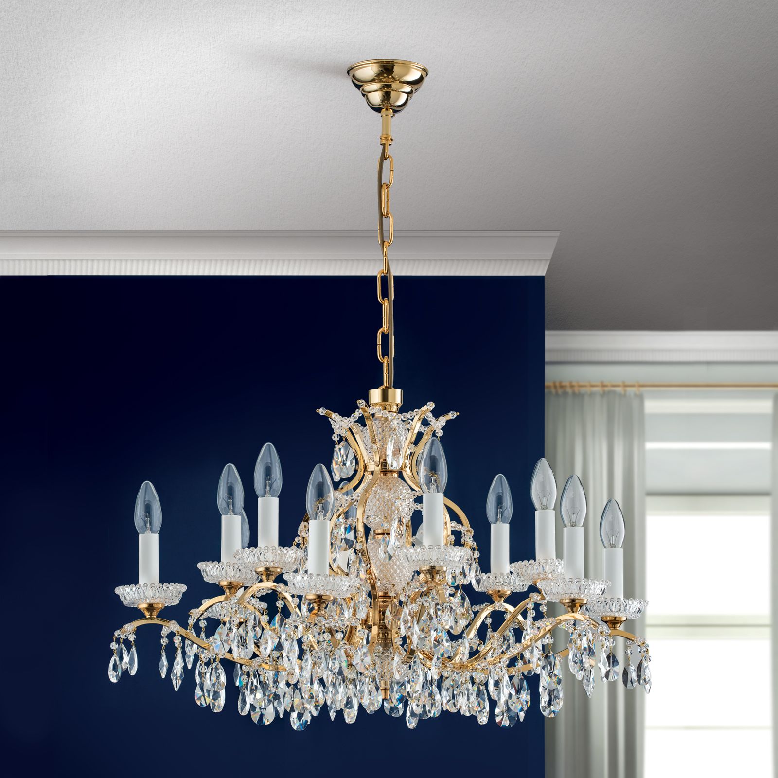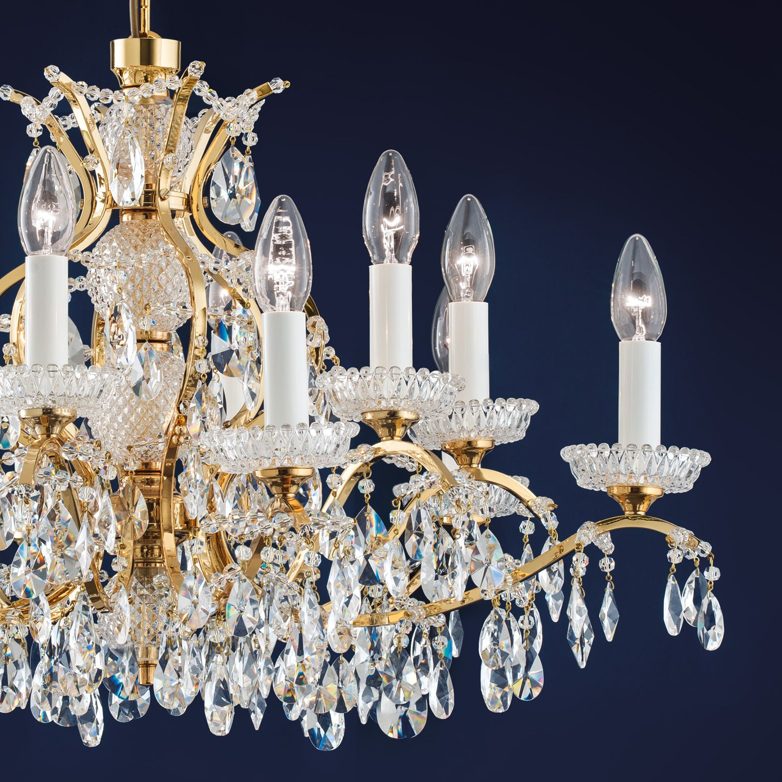 Der 6+6-flammige Luster aus der HIROHITO-Reihe lädt uns auf eine Reise in imperiale Welten ein. Was dem japanischen Tenno zusagt, kann sich auch in den heimischen vier Wänden sehen lassen. Zwei Lichtkränze zu je sechs Flammen umfassen das prunkvolle Zentrum, einen kristallenen balusterförmigen Schaft. Dieser wird umgeben von vergoldeten Spangen, die in kräftig geschwungene, weit ausladende Arme übergehen. Die in Kerzenoptik gehaltenen Lampenfassungen stehen auf Tropfschalen aus Bleikristall. Die Lichtwirkung der zwölf E14-Fassungen zu je maximal 40 Watt gemeinsam mit all den Reflexkörpern – Rosette, Kette, Korpus aus Gold, reicher Kristallbehang - macht jedem Raum mit großzügigen Dimensionen alle Ehre.
