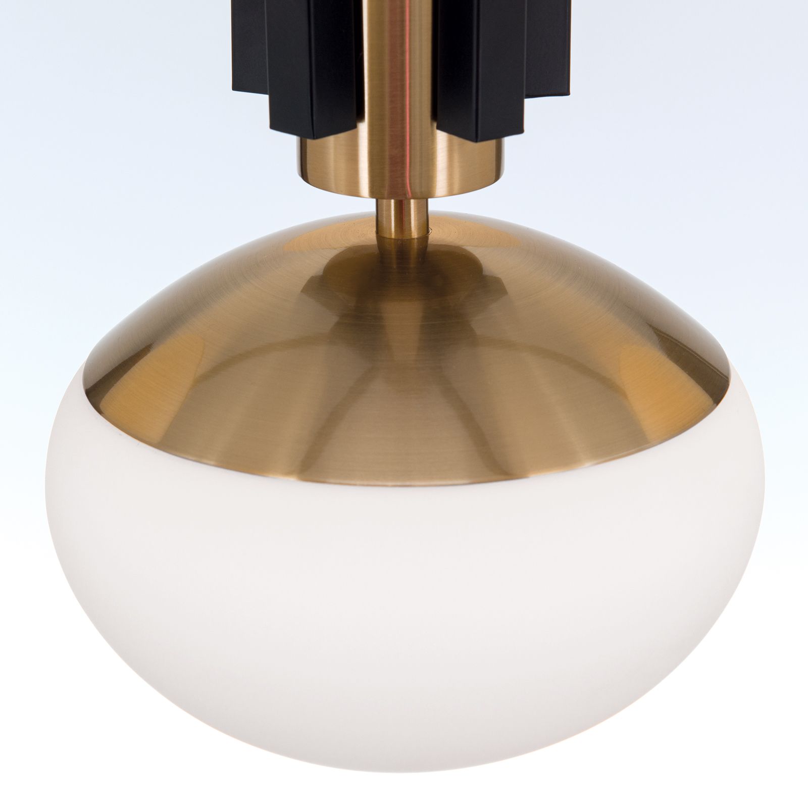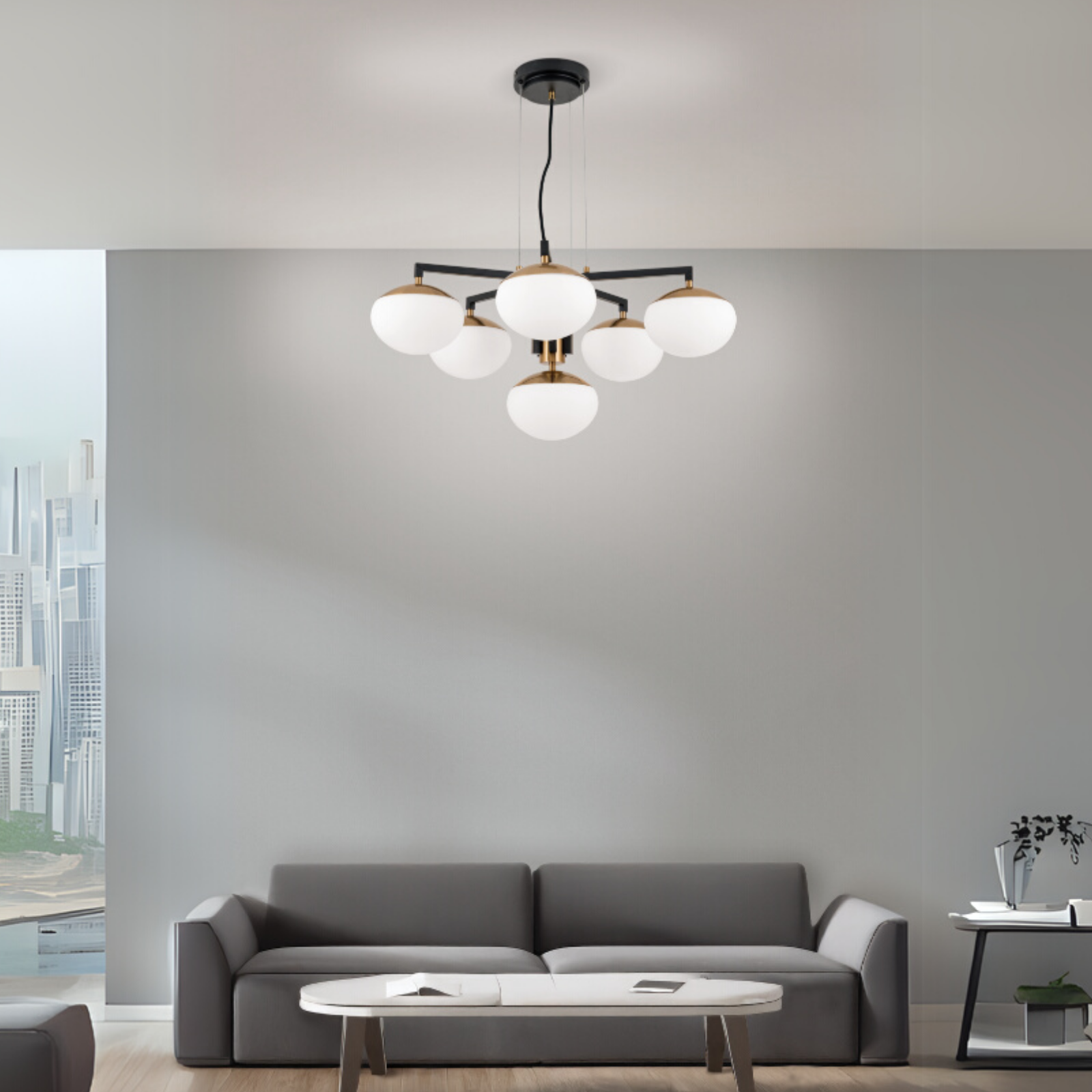 Dieser Luster ist nicht nur ein wunderbarer Blickfang, sondern auch funktional. Die opalweißen Glasschirme bieten eine angenehme Beleuchtung, die perfekt für das Abendessen oder das Lesen eines Buches geeignet ist.