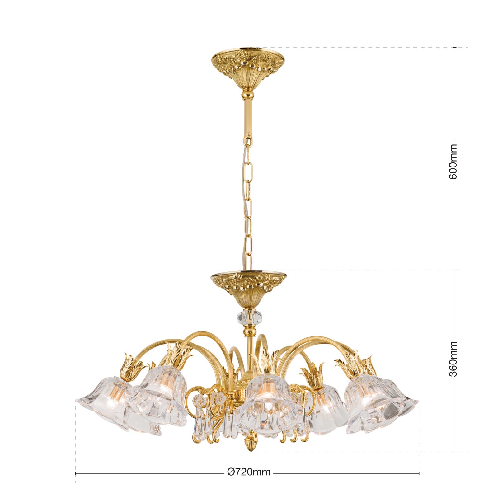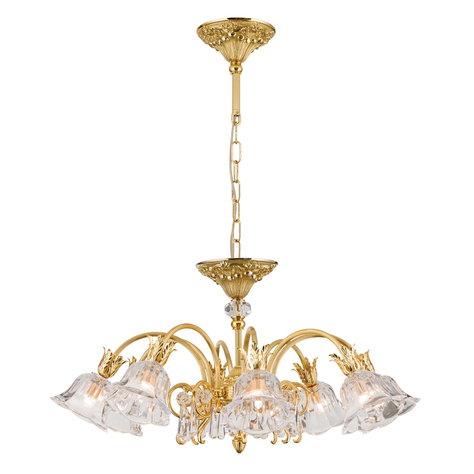An einer kunstvollen Deckenrosette hängt an einer Kette der üppig floral verzierte Kronleuchter herab. Das Gestell des Kronleuchters besteht aus Vollmessing. Die schwungvollen kannelierten Arme sind schräg nach unten gerichtet, was den Lichtradius erweitert. Besonders auffallend sind die stilisierten Akanthusblätter, die jeweils am Ende eines Armes angebracht sind. An ihnen sind klare Kristallschirme befestigt, die aufgrund ihrer gewellten Form stark an Blüten erinnern und perfekt mit dem Rest des Designs harmonieren. Der Kristallbehang aus 1A Vollschliff Kristallglas lässt ihn noch prachtvoller wirken und erzeugt schöne Lichtspiele.