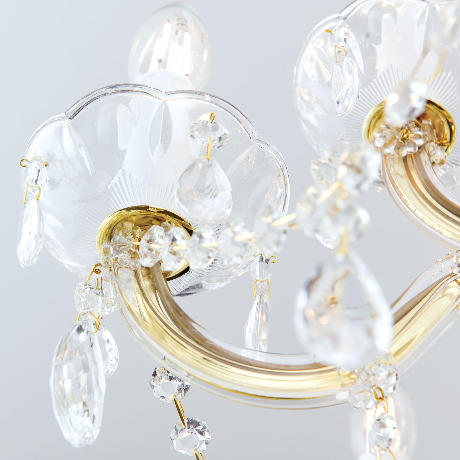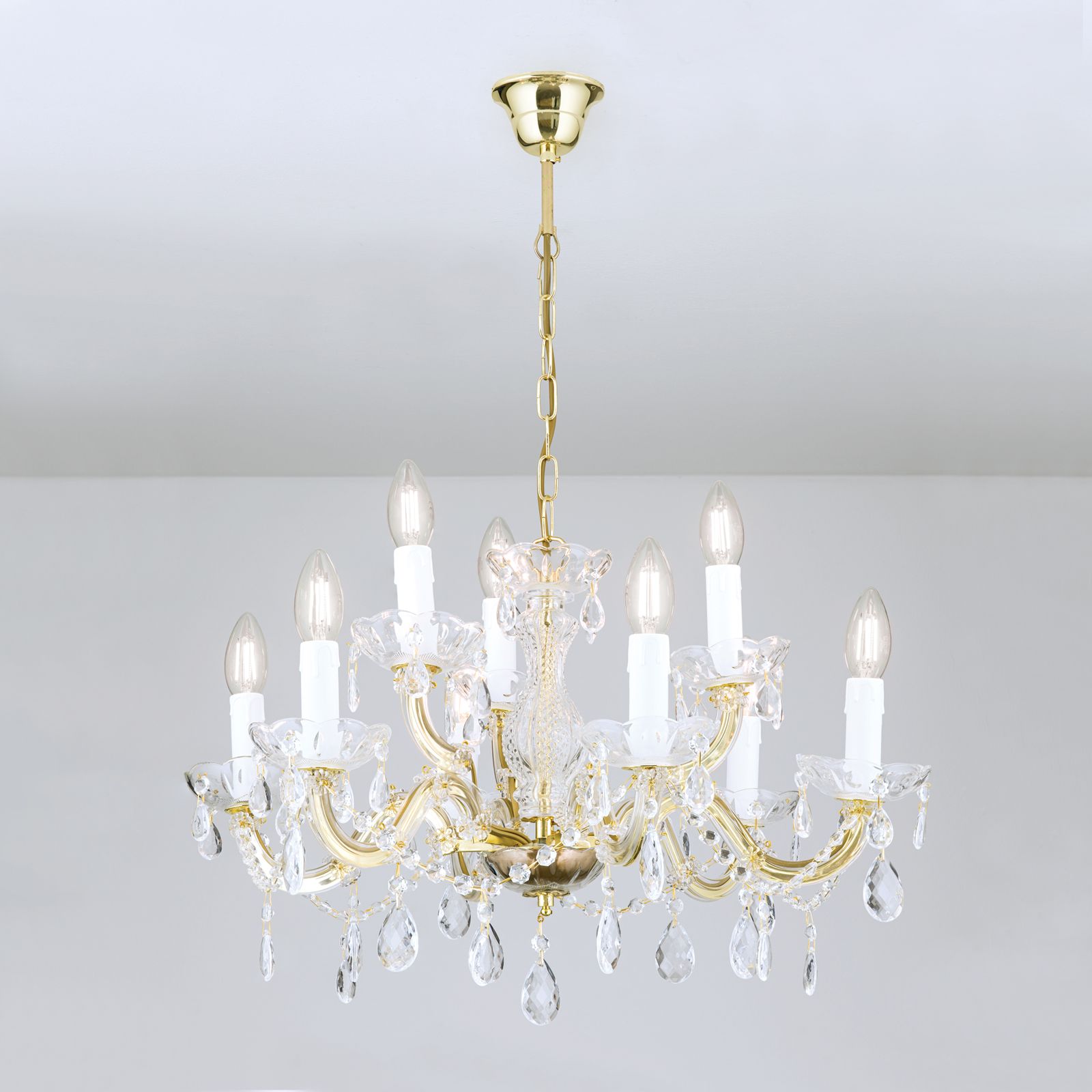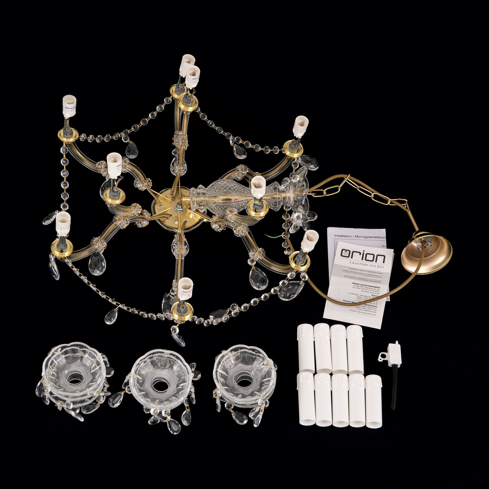 Der zarte 9-flammige Luster aus der MARIE CLAIRE-Reihe erstrahlt in einem Kreis von sechs und darüber einem von drei Flammen. So entsteht im Wohnzimmer oder über einer festlichen Tafel im Esszimmer eine glanzvolle Stimmung. Die Glasschliffarbeiten der Mittelsäule, der Behang mit Kristallen in Wachtelform, Perlenketten, der dezente Einsatz von Gold: Alles ist wie aus einem barocken Traum. Um das Bild zu vervollkommnen, bedarf es eigentlich nur noch stilgerechter Windstoßkerzenlampen. Der Luster ist mit neun E14-Fassungen zu je bis zu 40 Watt versehen.
