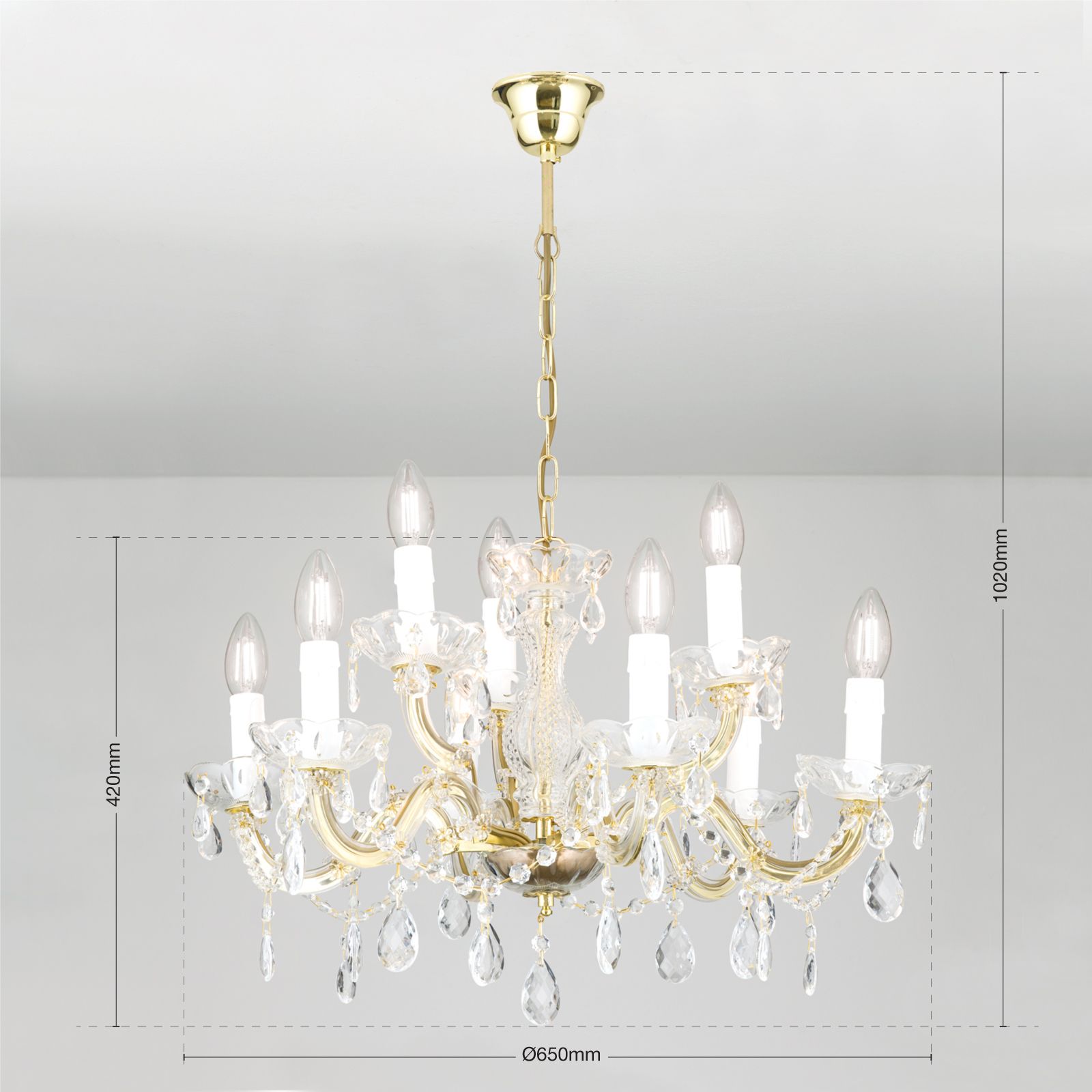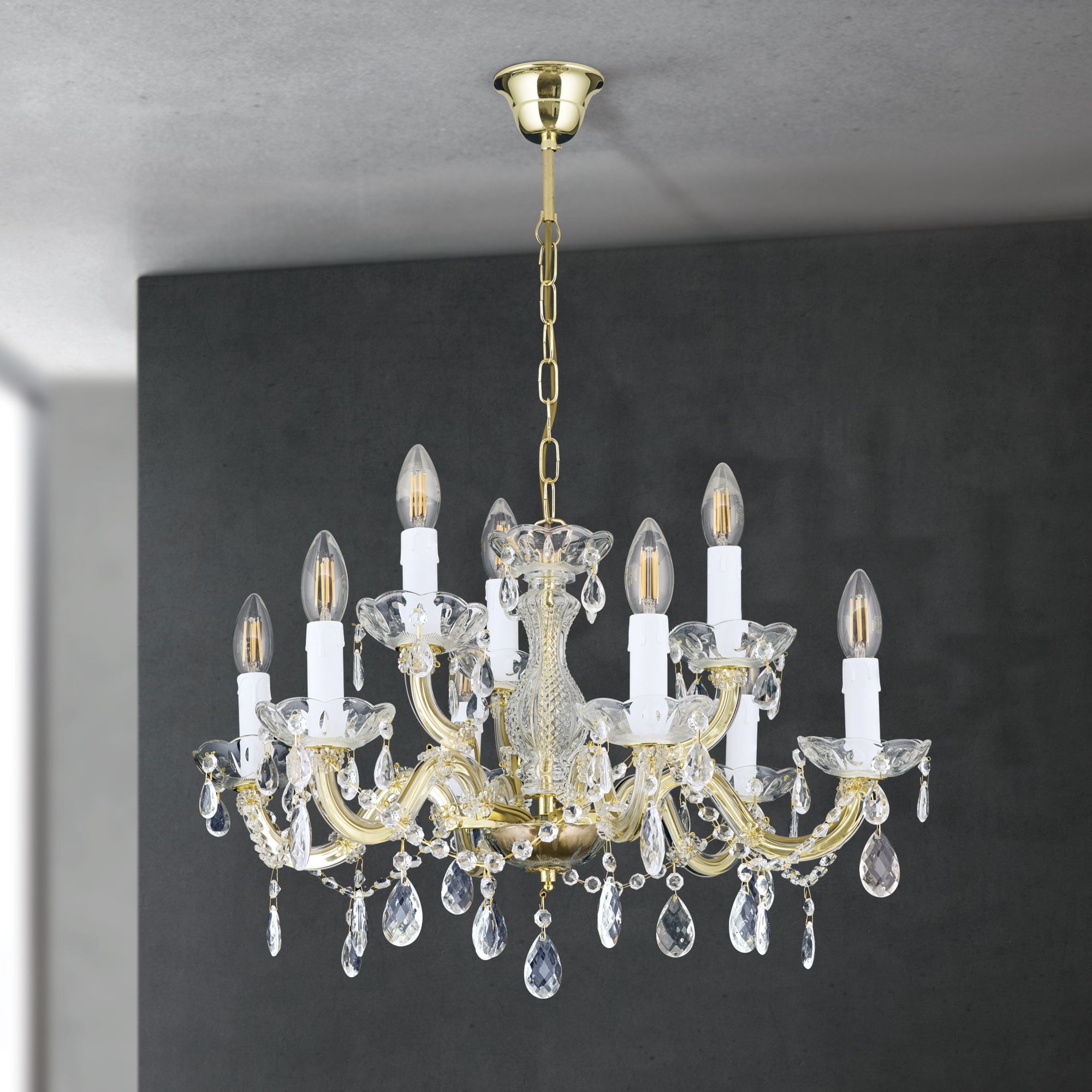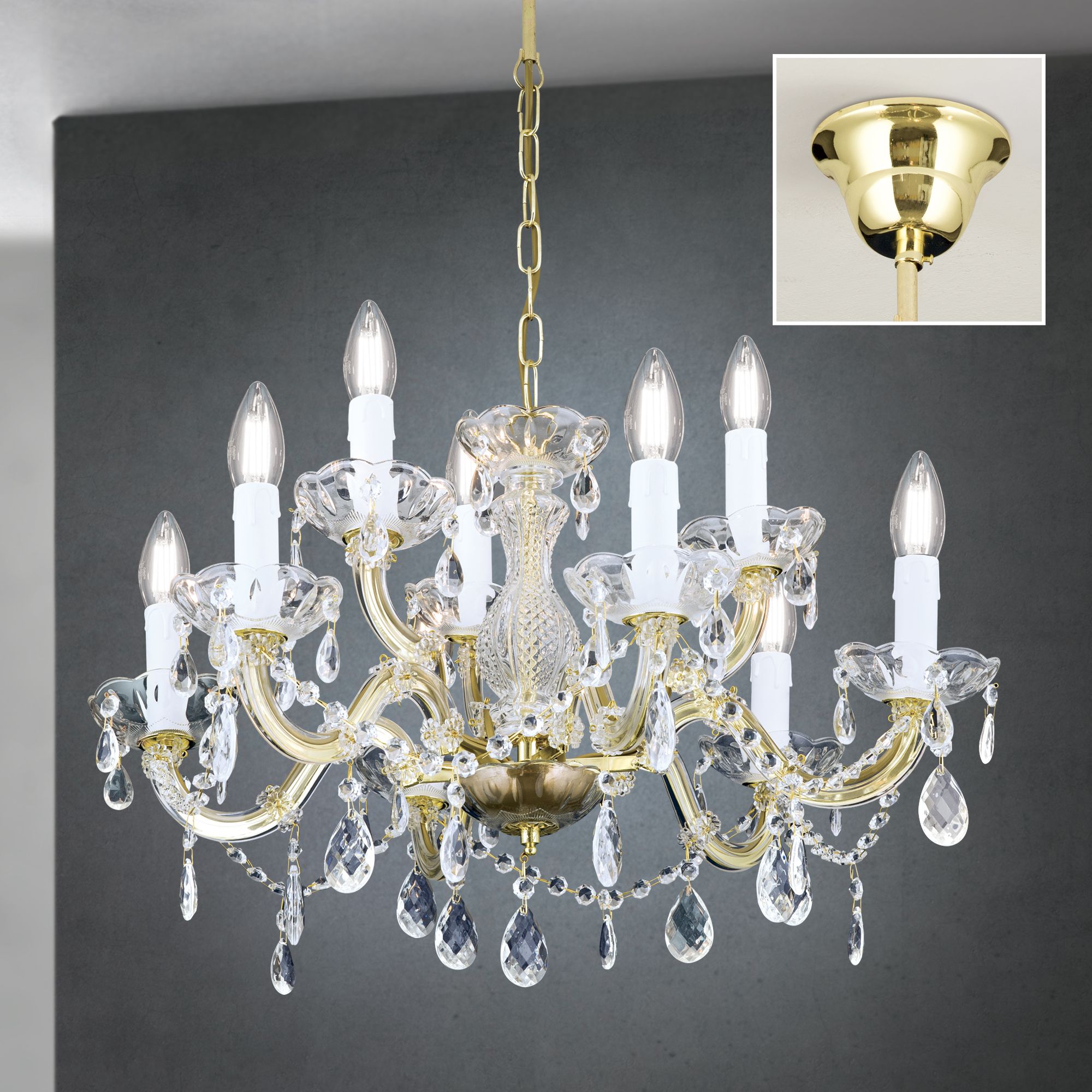 Der zarte 9-flammige Luster aus der MARIE CLAIRE-Reihe erstrahlt in einem Kreis von sechs und darüber einem von drei Flammen. So entsteht im Wohnzimmer oder über einer festlichen Tafel im Esszimmer eine glanzvolle Stimmung. Die Glasschliffarbeiten der Mittelsäule, der Behang mit Kristallen in Wachtelform, Perlenketten, der dezente Einsatz von Gold: Alles ist wie aus einem barocken Traum. Um das Bild zu vervollkommnen, bedarf es eigentlich nur noch stilgerechter Windstoßkerzenlampen. Der Luster ist mit neun E14-Fassungen zu je bis zu 40 Watt versehen.