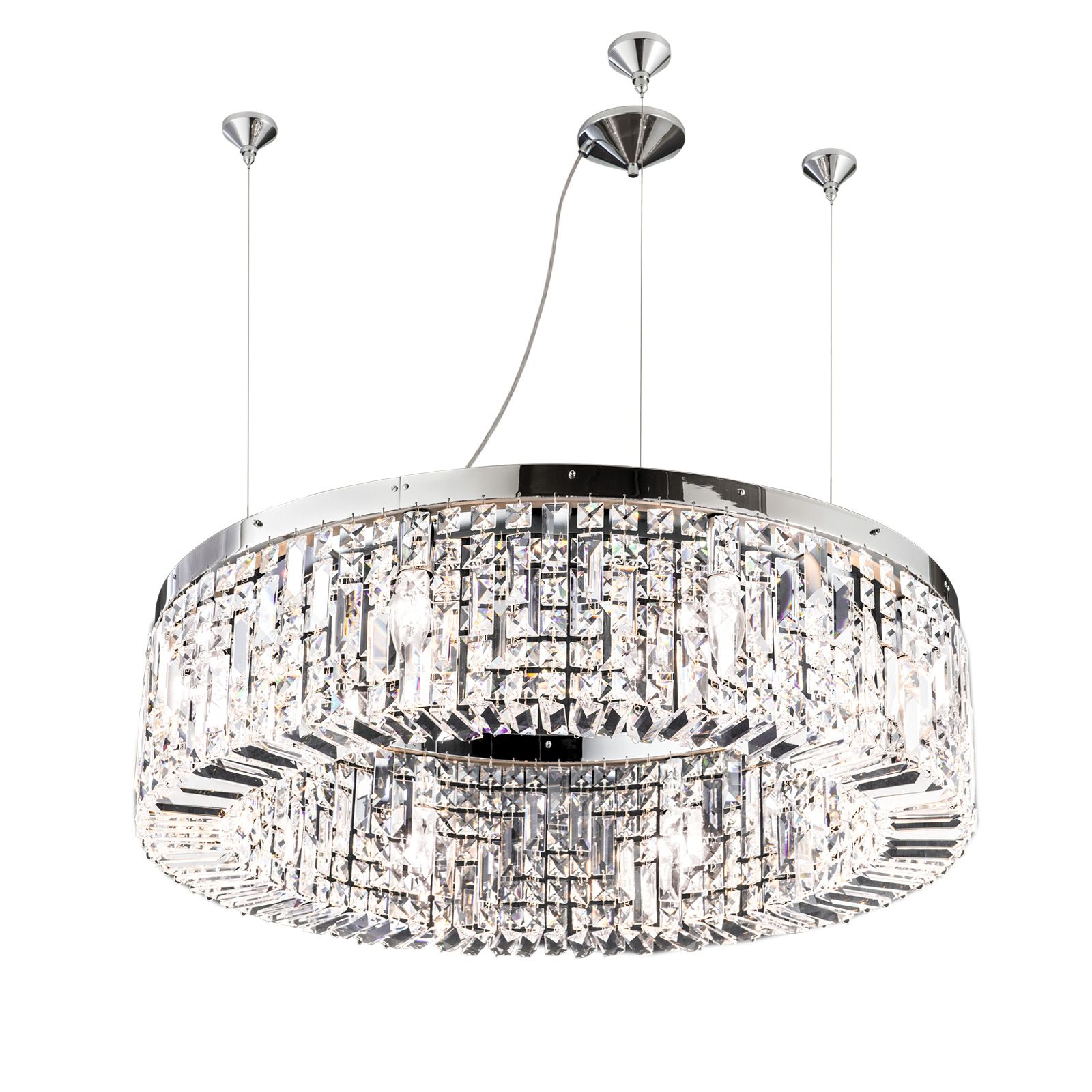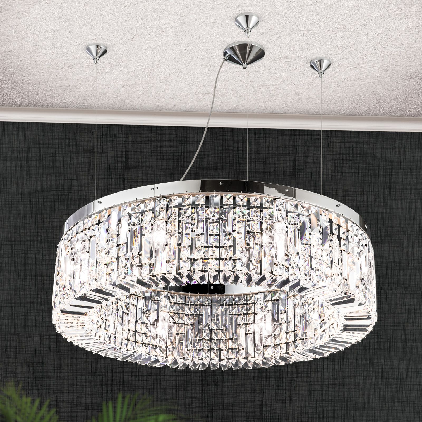 Der extravagante Kronleuchter aus der Serie RING ist ein wahres Schmuckstück und lässt sich sowohl in klassisch als auch modern eingerichtete Wohnbereiche integrieren. In Ess- und auch Wohnzimmern leuchtet er den gewünschten Bereich aus. Die zahlreichen klaren Asfour-Kristalle in Prismenform sind an einem runden Messinggestell befestigt und sind für einzigartige Lichteffekte verantwortlich. Das glänzende Oberflächenfinish intensiviert das Funkeln der formschönen Kristalle, die nicht nur beim Einschalten für besondere Lichtreflexionen sorgen. 8 Leuchtmittel befinden sich hinter dem Kristallbehang und können mit maximal 40 Watt bestückt werden. Mithilfe eines Dimmers kann die Helligkeit des Lichts reguliert werden, wodurch die Atmosphäre günstig beeinflusst werden kann. Der Luster hat eine Gesamthöhe von 30-160 cm mit einer Abhängung von 150 cm und einen Durchmesser von 80 cm. Erhältlich ist dieser in den Farben Chrom und Gold.