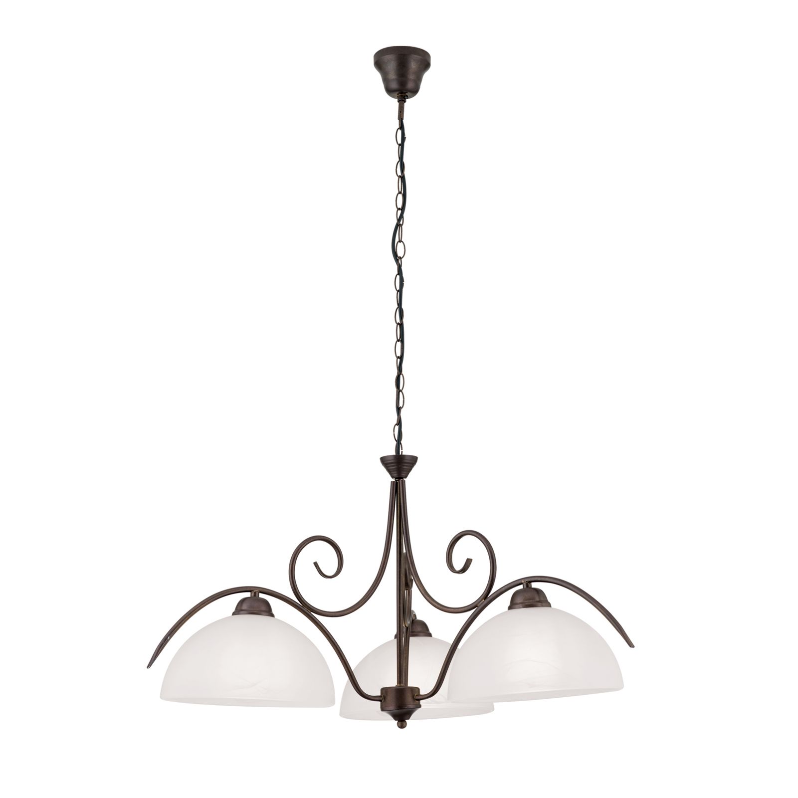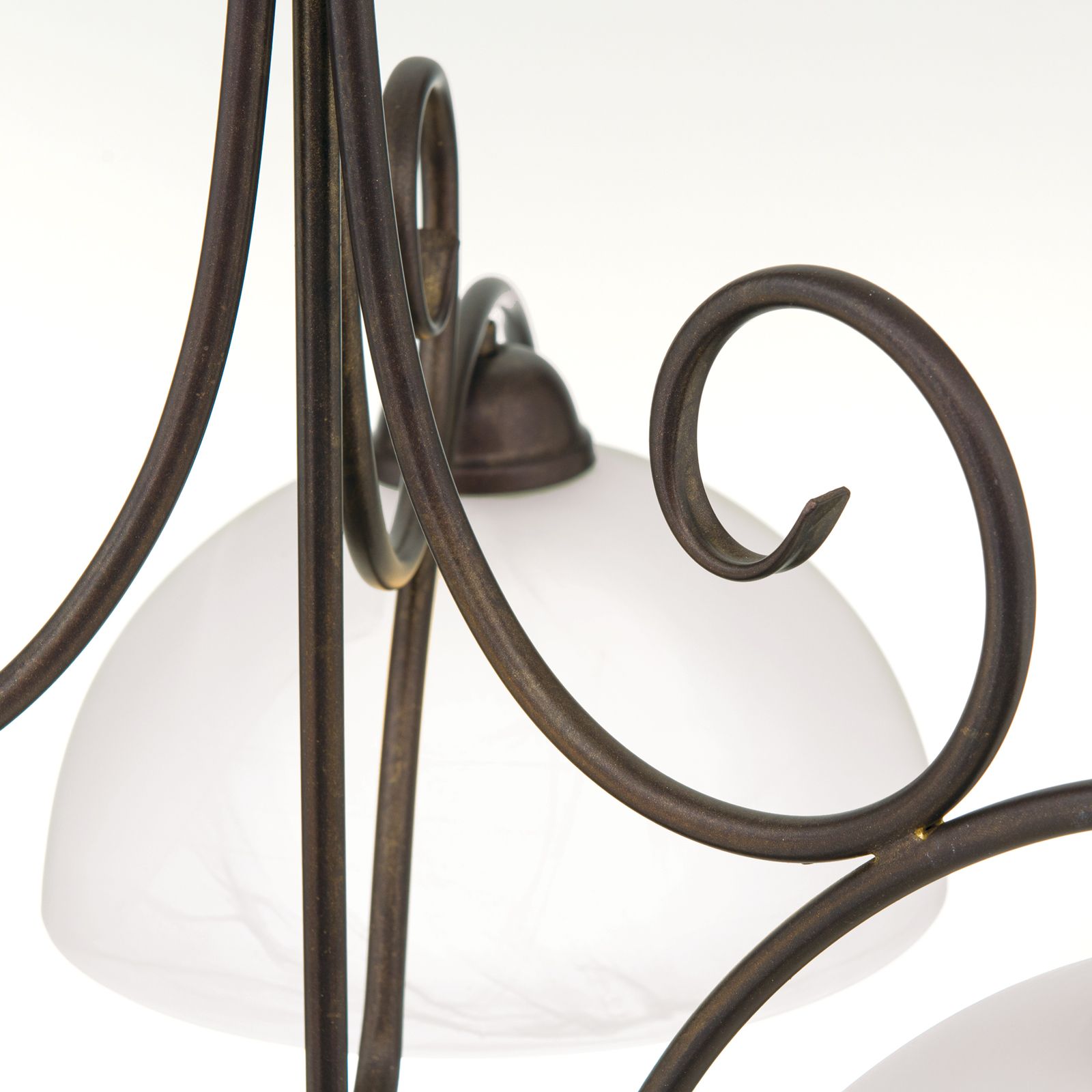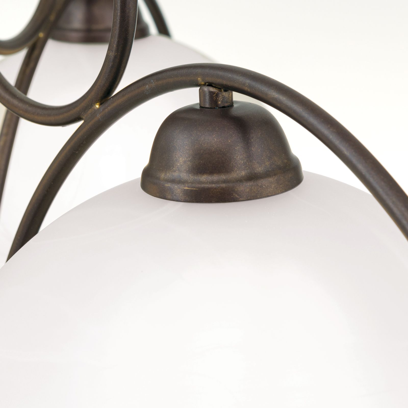 Der Kronleuchter aus der Serie RULA verleiht dem Raum eine angenehme und wohlige Stimmung. Idealerweise ist dieser für Esszimmer aber auch Wohnzimmer geeignet, die im Landhausstil eingerichtet sind. Das geschwungene Metallgestell ist antikbraun und wird von drei opalmatten Glasschirmen ergänzt, welche den Raum angenehm ausleuchten und für Gemütlichkeit sorgen.