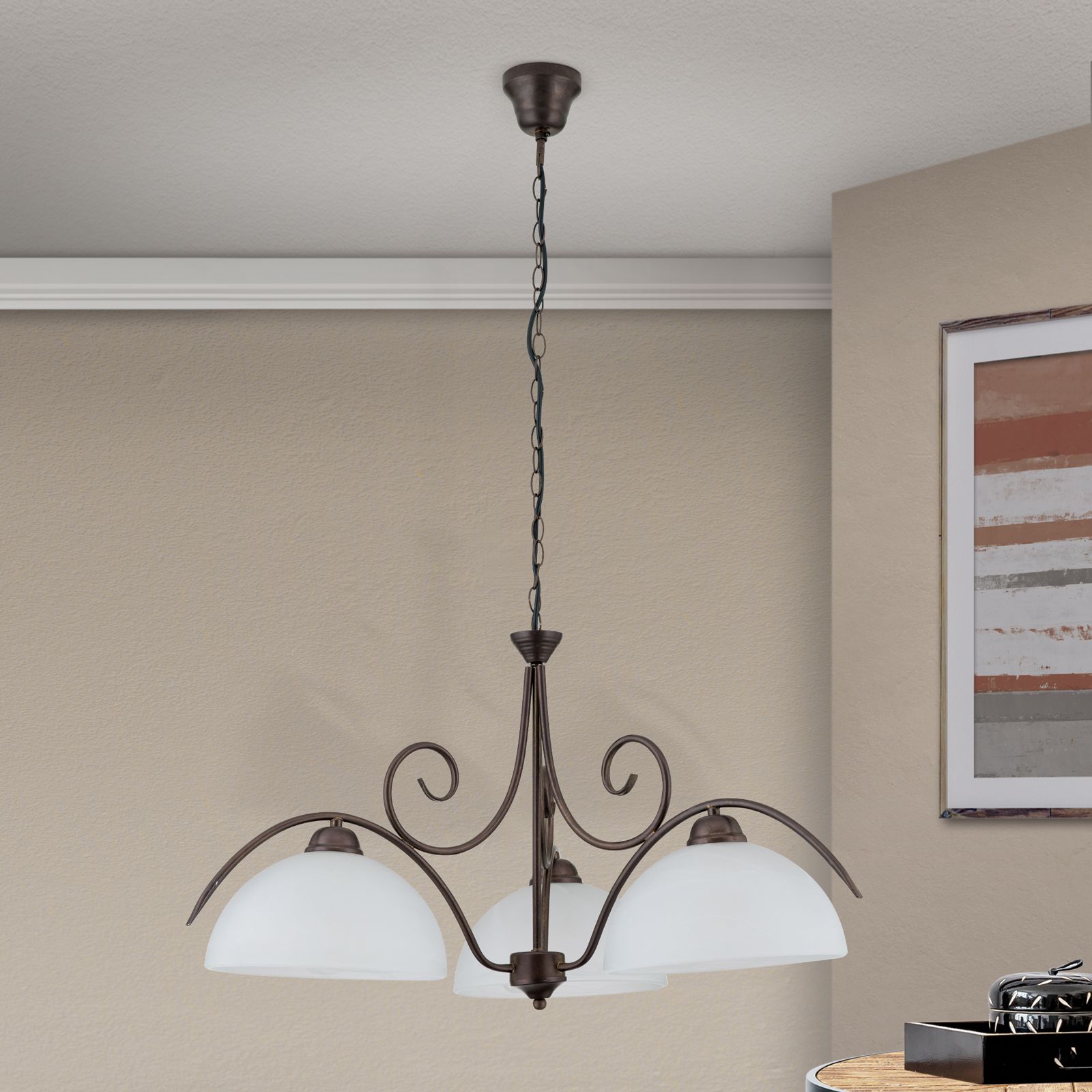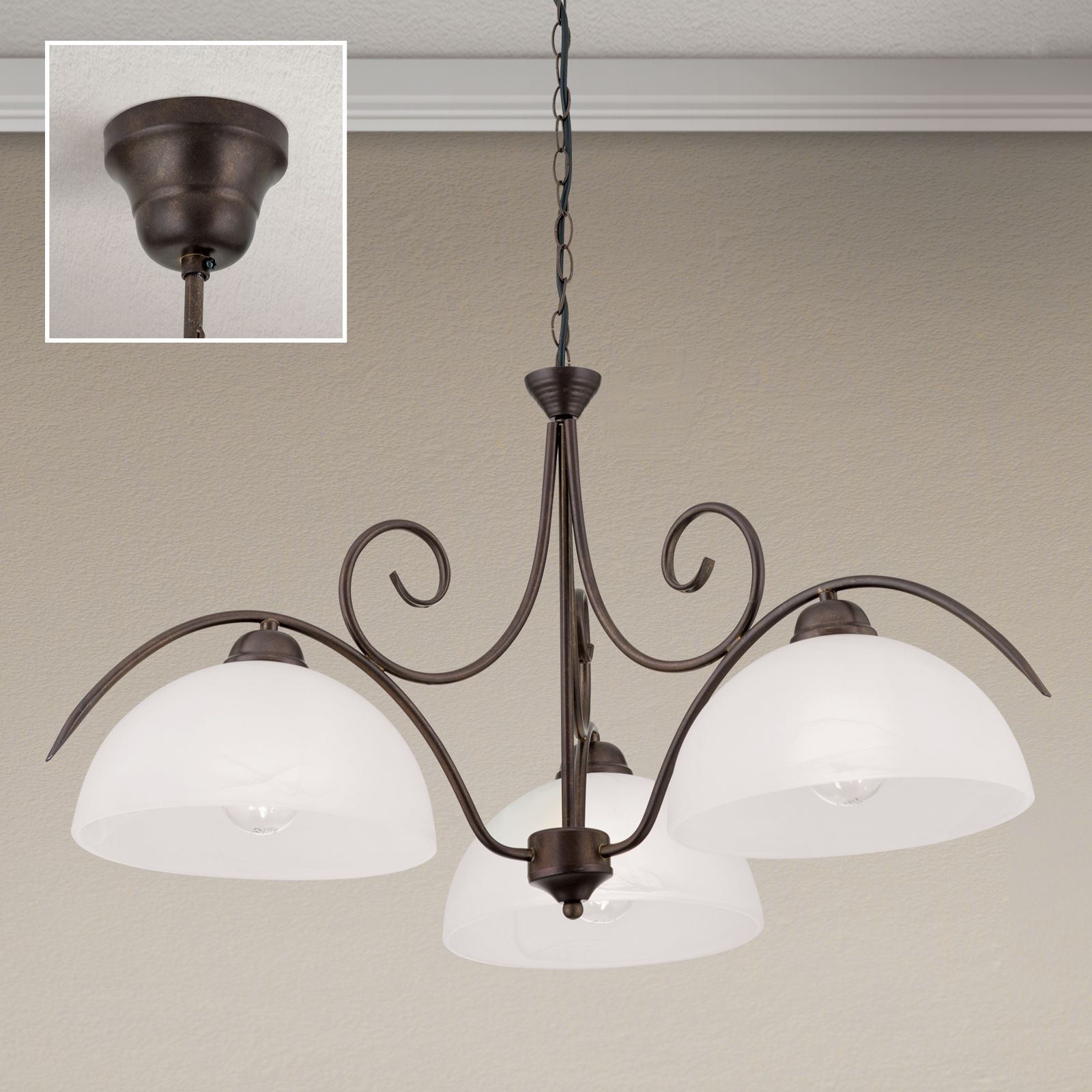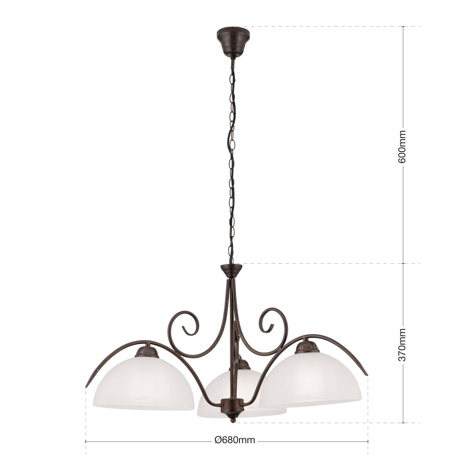 Der Kronleuchter aus der Serie RULA verleiht dem Raum eine angenehme und wohlige Stimmung. Idealerweise ist dieser für Esszimmer aber auch Wohnzimmer geeignet, die im Landhausstil eingerichtet sind. Das geschwungene Metallgestell ist antikbraun und wird von drei opalmatten Glasschirmen ergänzt, welche den Raum angenehm ausleuchten und für Gemütlichkeit sorgen.