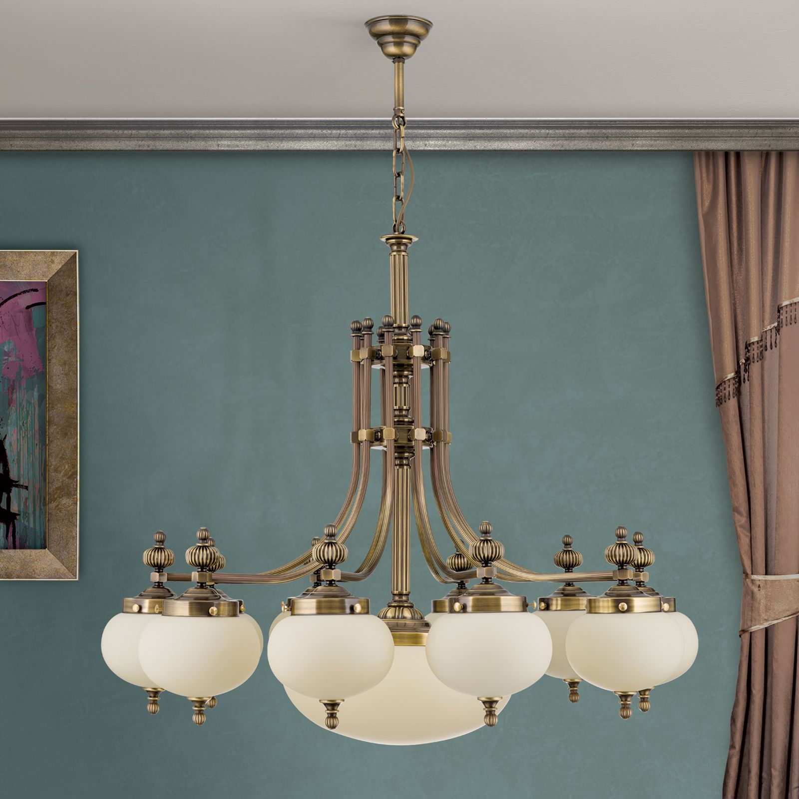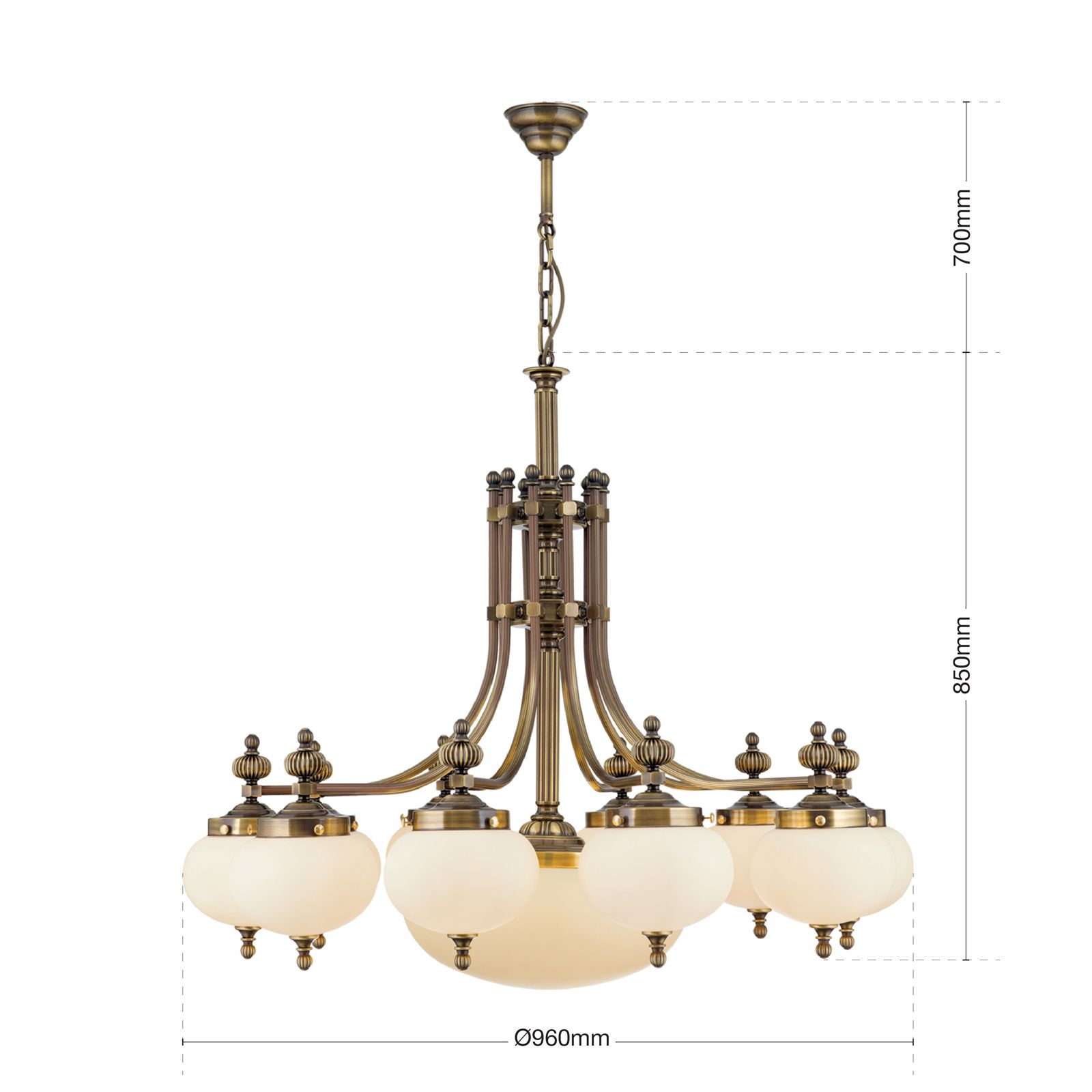 Der 11-flammige Kronleuchter WIENER NOSTALGIE versprüht das Flair eines alten Wiener Kaffeehauses und leuchtet zugleich optimal große Räume wie etwa einen Ballsaal, Salon oder Geschäftsraum aus. Um einen zentral angebrachten Schirm befinden sich ringförmig 10 weitere Schirme, die aus opal mattem Glas gefertigt sind und somit für eine homogene Lichtverteilung sorgen. Das Leuchtengestell besteht aus Messing und ist mit einem glänzenden Messing-Finish versehen. Kannelierte Leuchtenarme tragen die zahlreichen Schirme, die ober- sowie unterhalb Verzierungen aufweisen und das Gesamtbild abrunden. Der Luster mit einer Gesamthöhe von 155 cm ist mit 10 E27-Fassungen für je bis zu 60 Watt und mit 1 E27-Fassung zu 75 Watt ausgestattet. Bei Bedarf ist eine Regulierung der Helligkeit mittels Dimmers möglich, um so für die geeignete Beleuchten zu sorgen. Mit sparsamen LED's kann der Kronleuchter zur energieeffizienten, permanenten Beleuchtung genutzt werden.