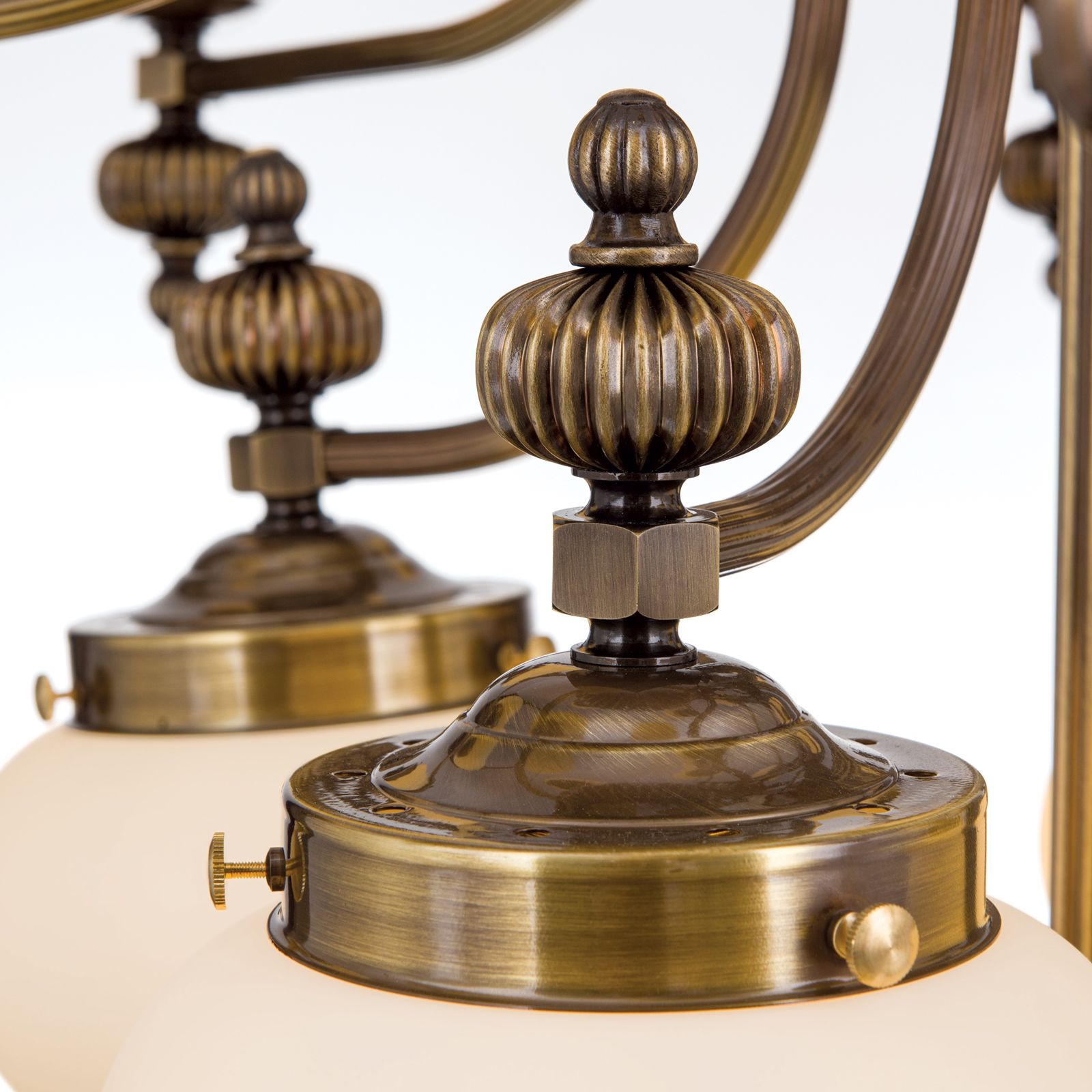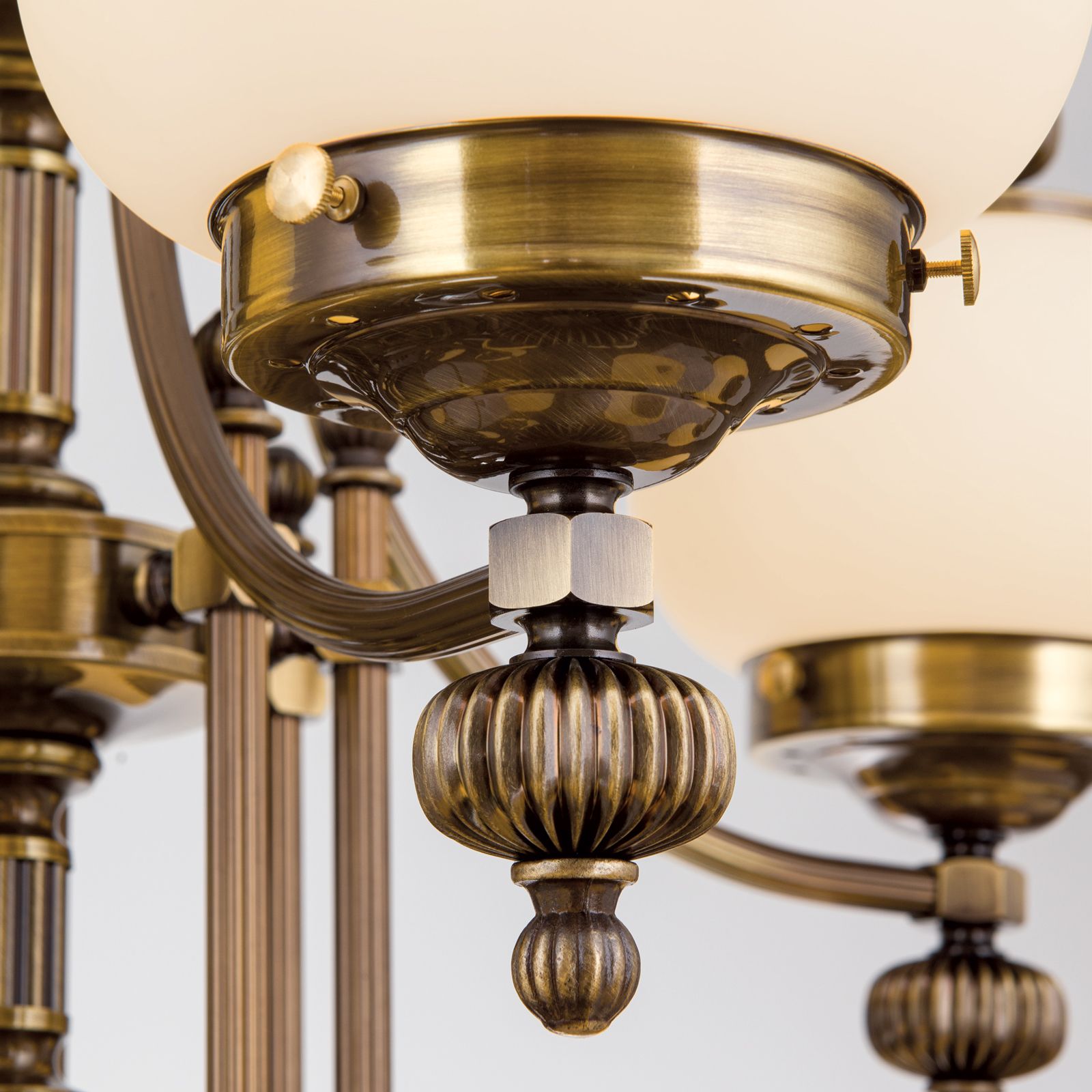 Auch als patinierte Variante mit champagne matten Schirmen ist der Kronleuchter verfügbar.