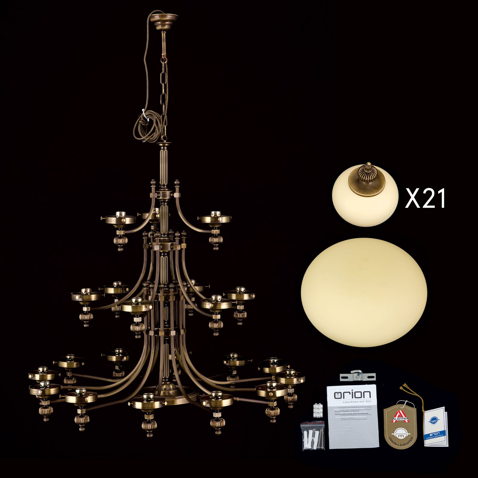 In der Serie WIENER NOSTALGIE nehmen die Kronleuchter eine prominente Rolle ein: Vom 3-flammigen Luster bis zum 4-stöckigen Leuchtenwunder wird für jeden Geschmack und jede Raumgröße etwas geboten. Mit einer Höhe von 120 und einem Durchmesser von 110 Zentimetern gehört er zu den Großleuchten der ORION Leuchten Manufaktur. Die Ausführung mit 22 Flammen kann getrost in einen hundert Quadratmeter großen Saal gehängt werden. Die beeindruckende Leuchtkraft kann aber auch gedimmt werden und im Handumdrehen wird aus einem hell ausgeleuchteten ein stimmungsvoller Raum mit gedämpftem Licht. Die messingenen Zierkörper, mit denen die Schirme versehen sind, erzeugen vielfache zauberhafte Lichtreflexe. Es entfaltet sich eine selbstbewusste, unaufgeregte Pracht. Der Kronleuchter verfügt über 21 E27-Fassungen zu je maximal 60 Watt und eine E27-Fassung für bis zu 75 Watt.