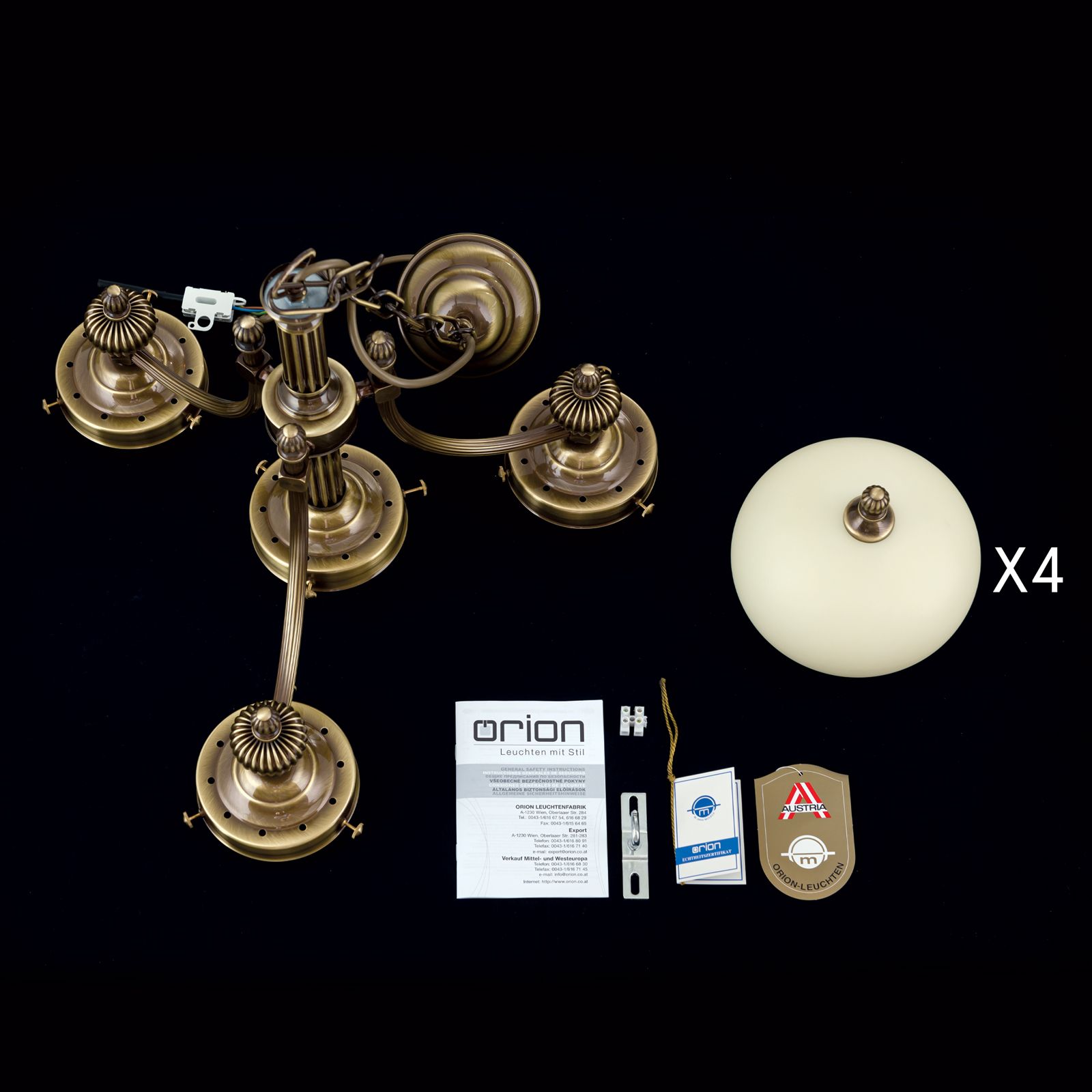 Der Kronleuchter 3+1-flammig aus der WIENER NOSTALGIE-Reihe ist eine Stilikone der Blütezeit des Wiener Kaffeehauses. Die größten, brillantesten Köpfe ihrer Zeit wurden von diesen Leuchten beschienen, vielleicht sogar erhellt: Wer weiß, welche Geistesblitze sich im Glanz des Messings reflektiert haben… Die Form und das Design sind Kind ungleicher Eltern: klassische Zierfreuden treffen auf die Klarheit der Formen der Moderne. Die richtige Mischung ist mit dieser Gestaltung ebenso gelungen wie eine gute Melange mit Schaumkrone. Die Leuchtkraft ist mit 4 Fassungen und einer maximalen Leistung von zusammen 240 Watt wie geschaffen für ein großes Wohnzimmer oder ein Schlafzimmer von großzügigen Ausmaßen. Genau so gut leuchtet sie eine Nische mit Kaffeetisch oder einen Esstisch im Restaurant aus. Der Leuchter verfügt über vier E27-Fassung zu je maximal 60 Watt.