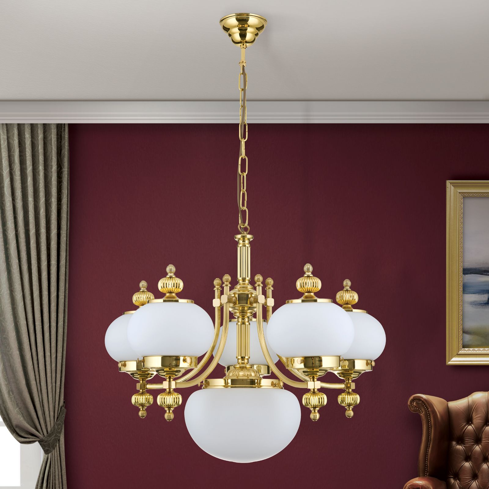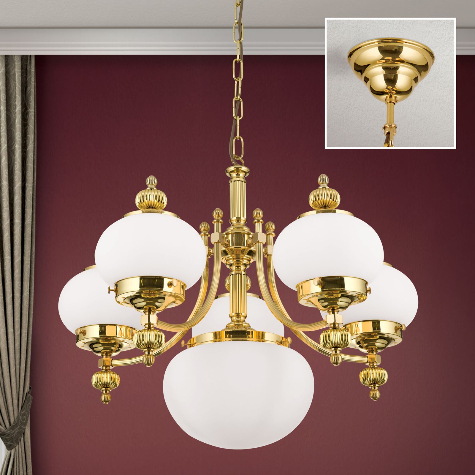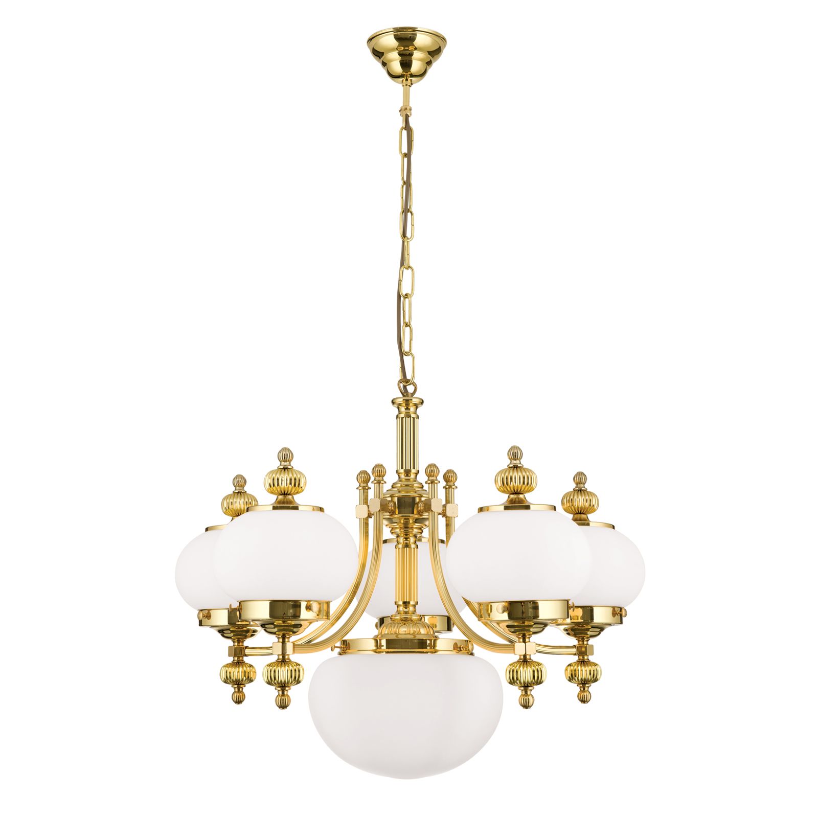 Luster WIENER NOSTALGIE, 5+1-flammig, Messing-glänzend, mit opal matten Gläsern, aufwärts