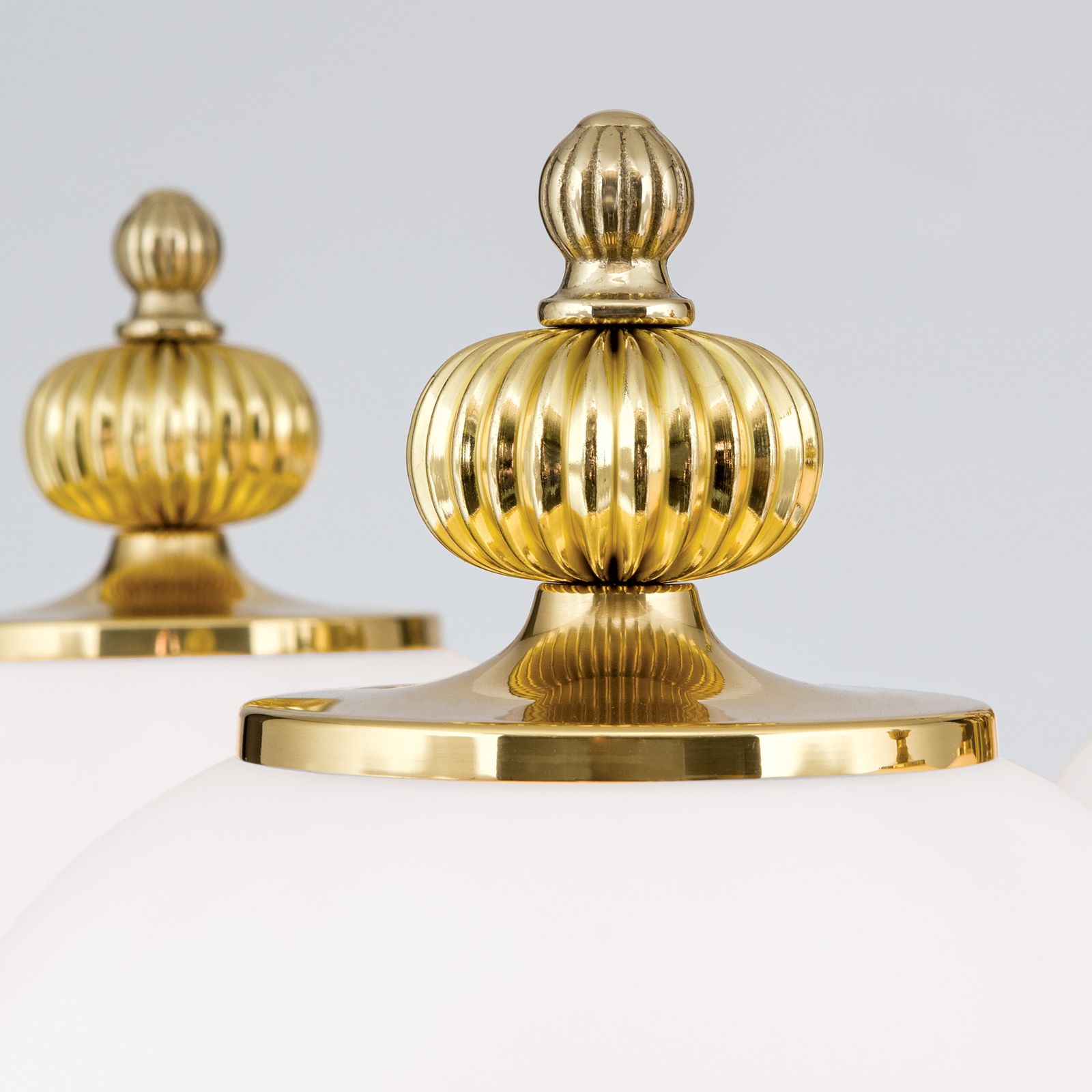 Der Leuchtenkorpus aus Vollmessing ist in den Oberflächenveredelungen Messing glanzpoliert mit opal matten Gläsern oder Patina handschattiert mit champagne matten Gläsern erhältlich. Charakteristisch ist die als Abschluss der Gläser dienende Faltkugel aus Messing.