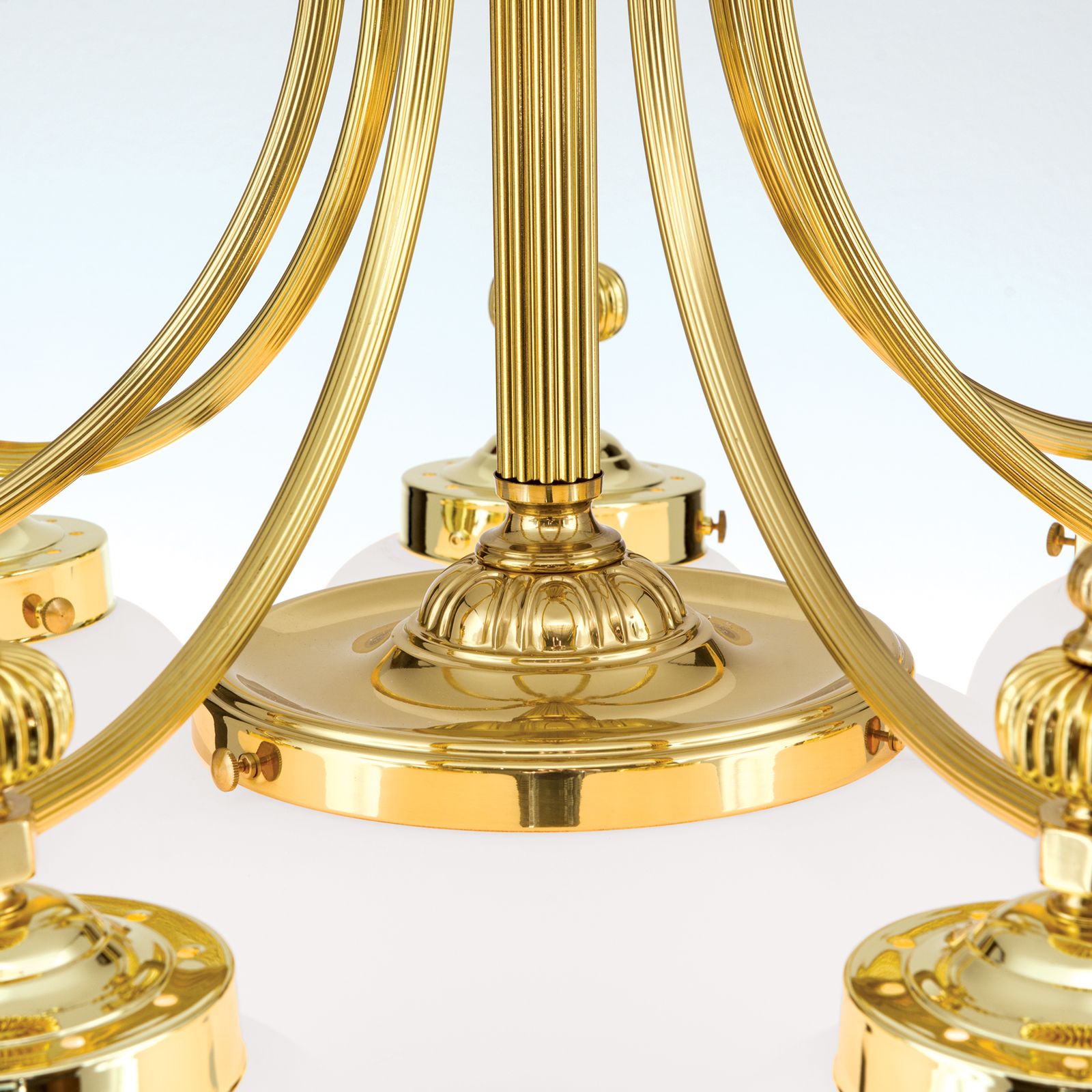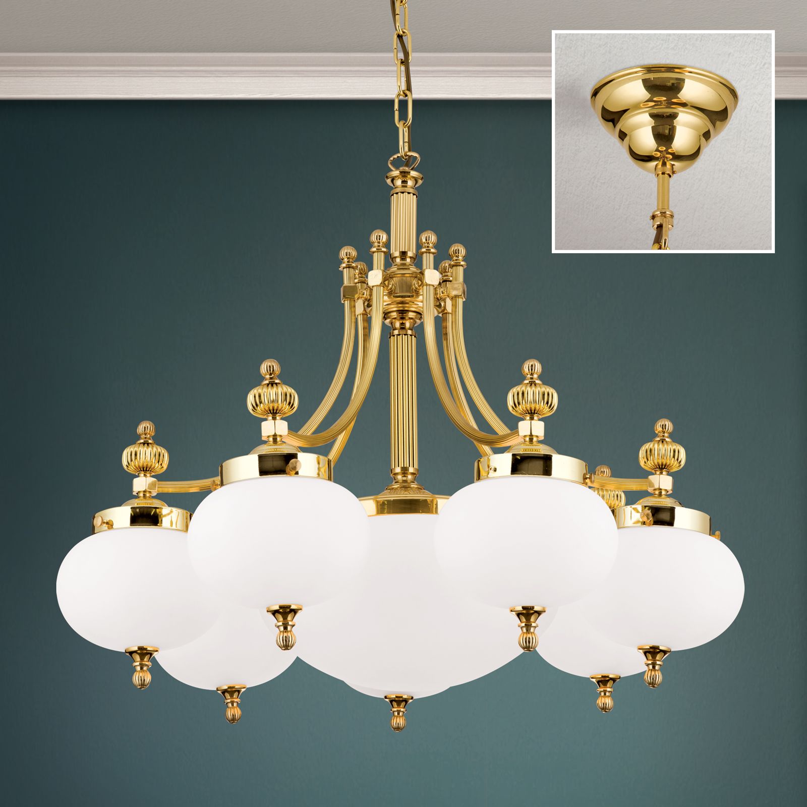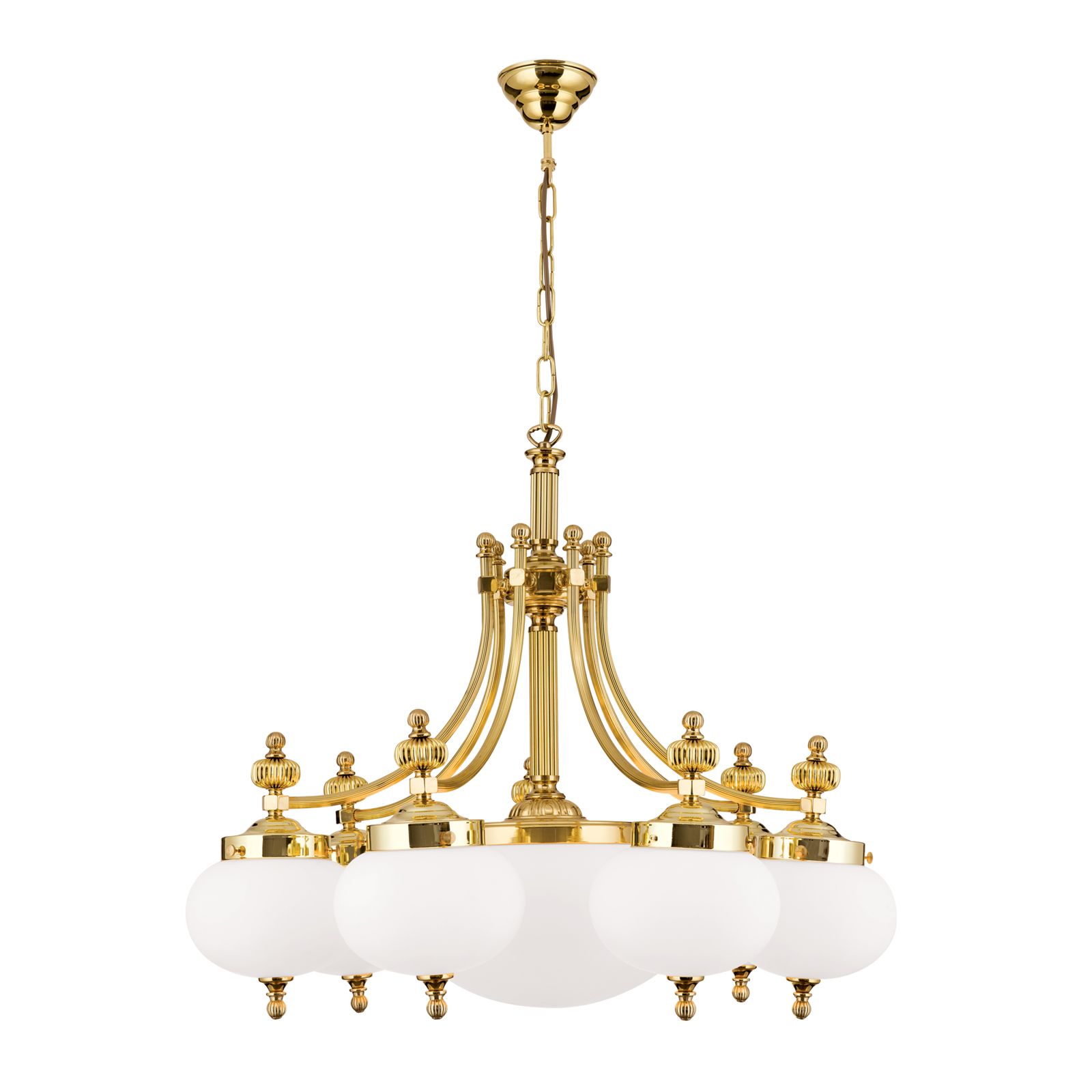 Luster WIENER NOSTALGIE, 7+1-flammig, Messing-glänzend, mit opal matten Gläsern, abwärts
