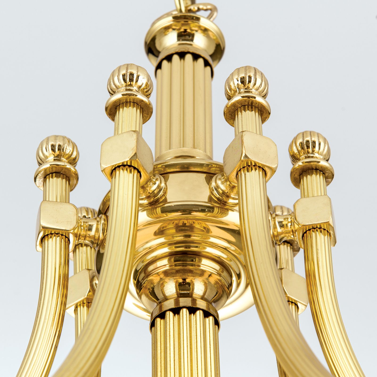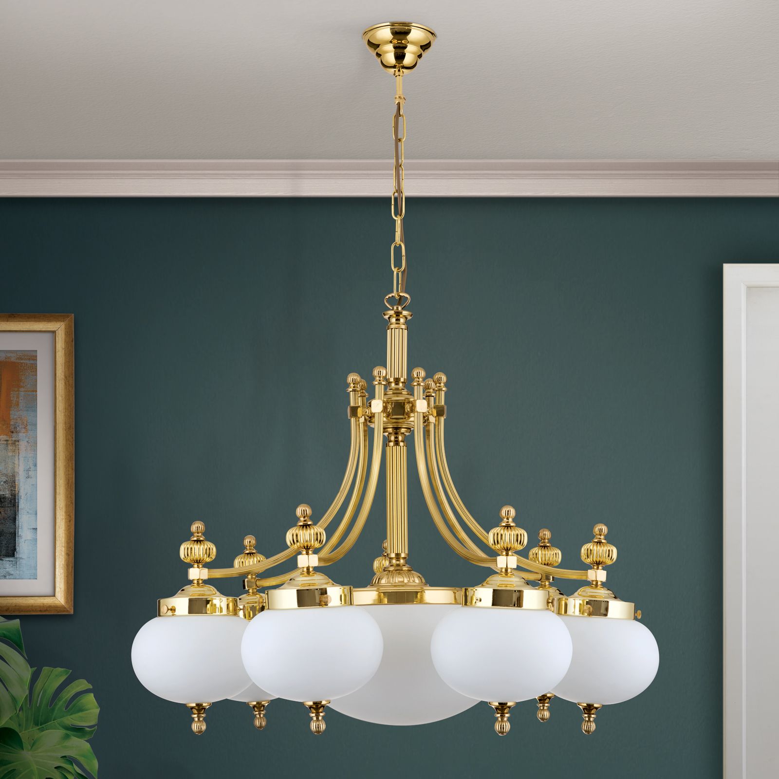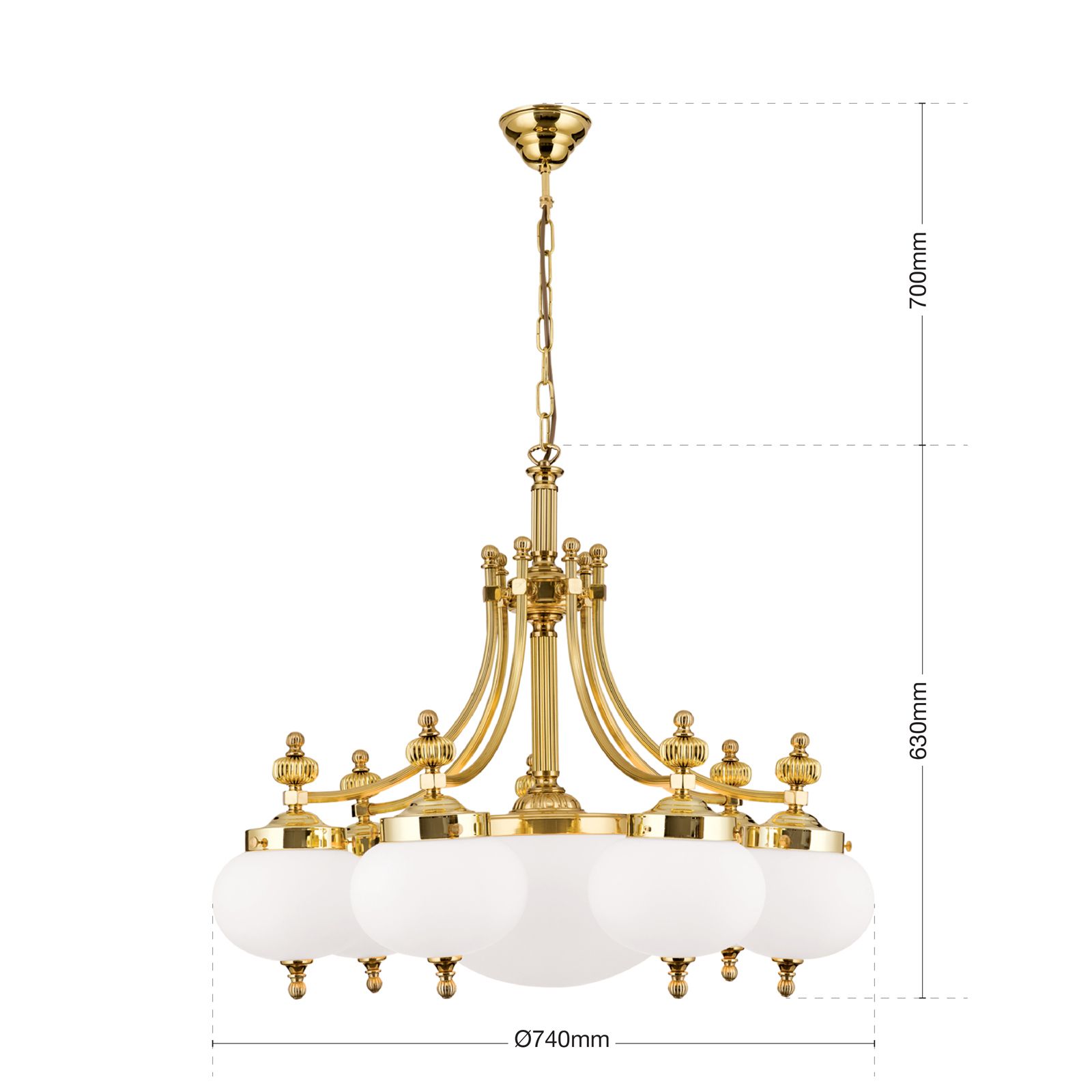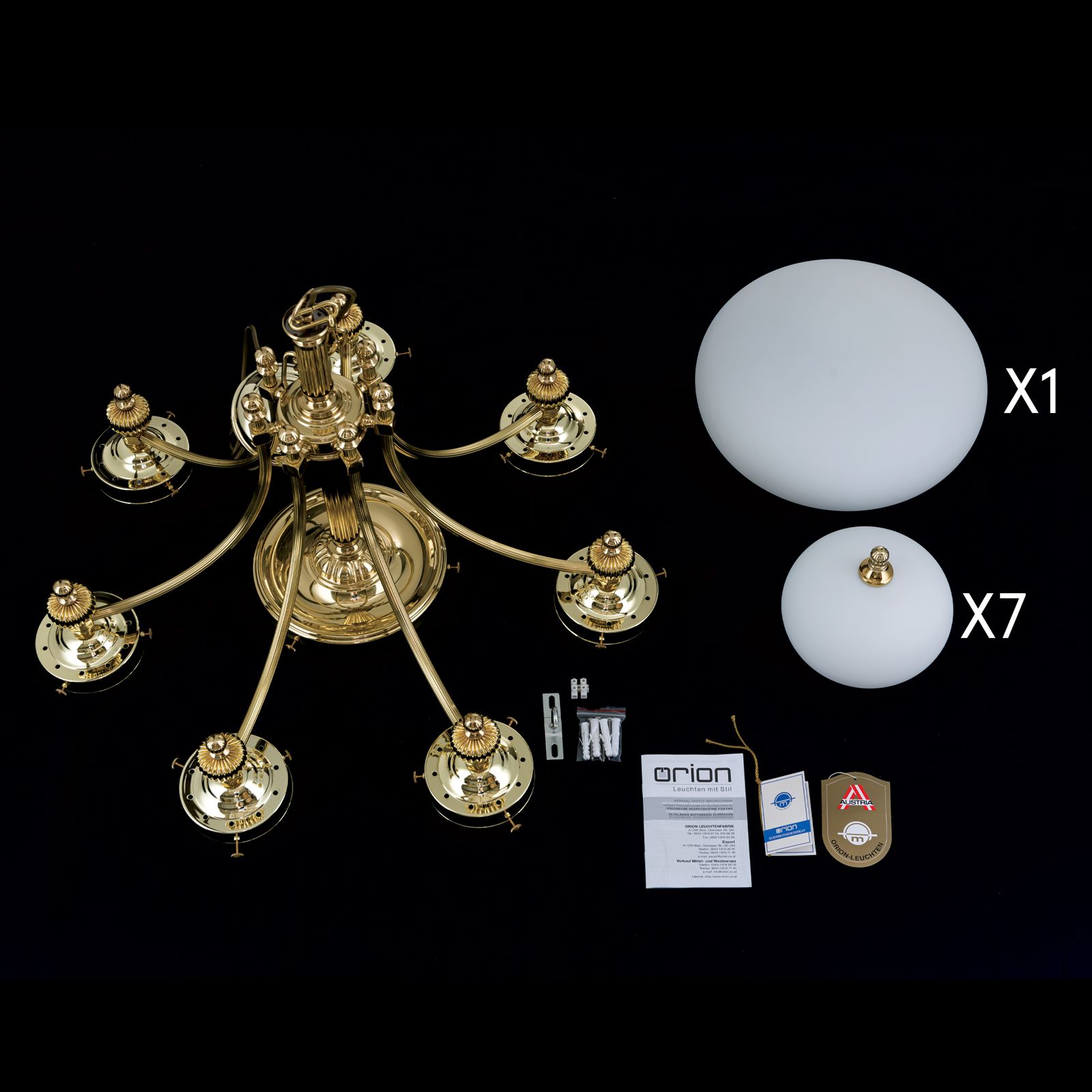 Luster WIENER NOSTALGIE, 7+1-flammig, Messing-glänzend, mit opal matten Gläsern, abwärts