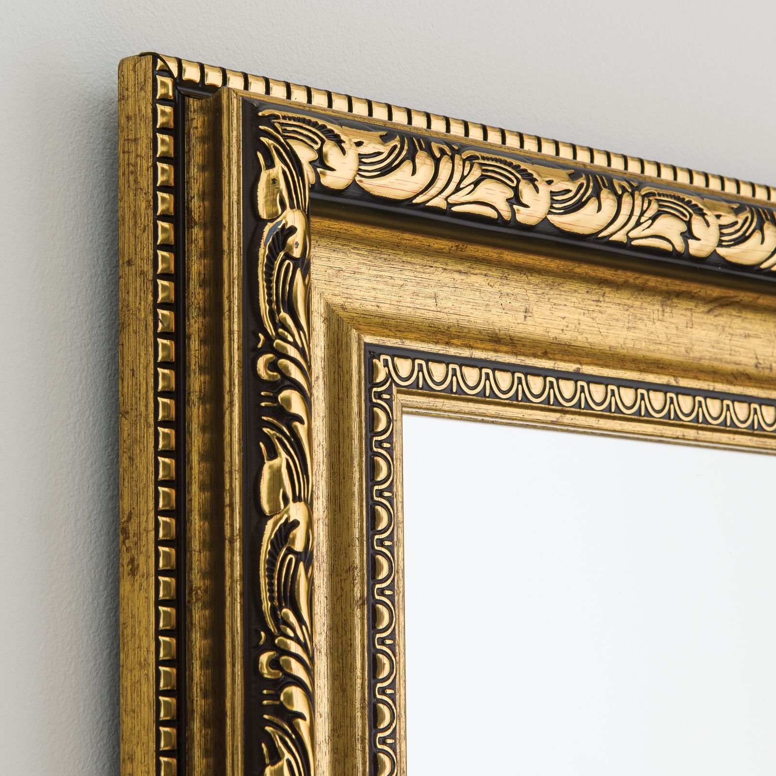 Der Wandspiegel ELISA verleiht jedem Raum eine edle und stilvolle Atmosphäre. Mit seinen Maßen von 120 cm x 70 cm ist er sowohl funktional als auch dekorativ ein echter Blickfang. Der aufwendig gestaltete Rahmen in Antik-Gold ist kunstvoll lackiert und die Holzoptik unterstreicht den klassischen Barock-Stil.
