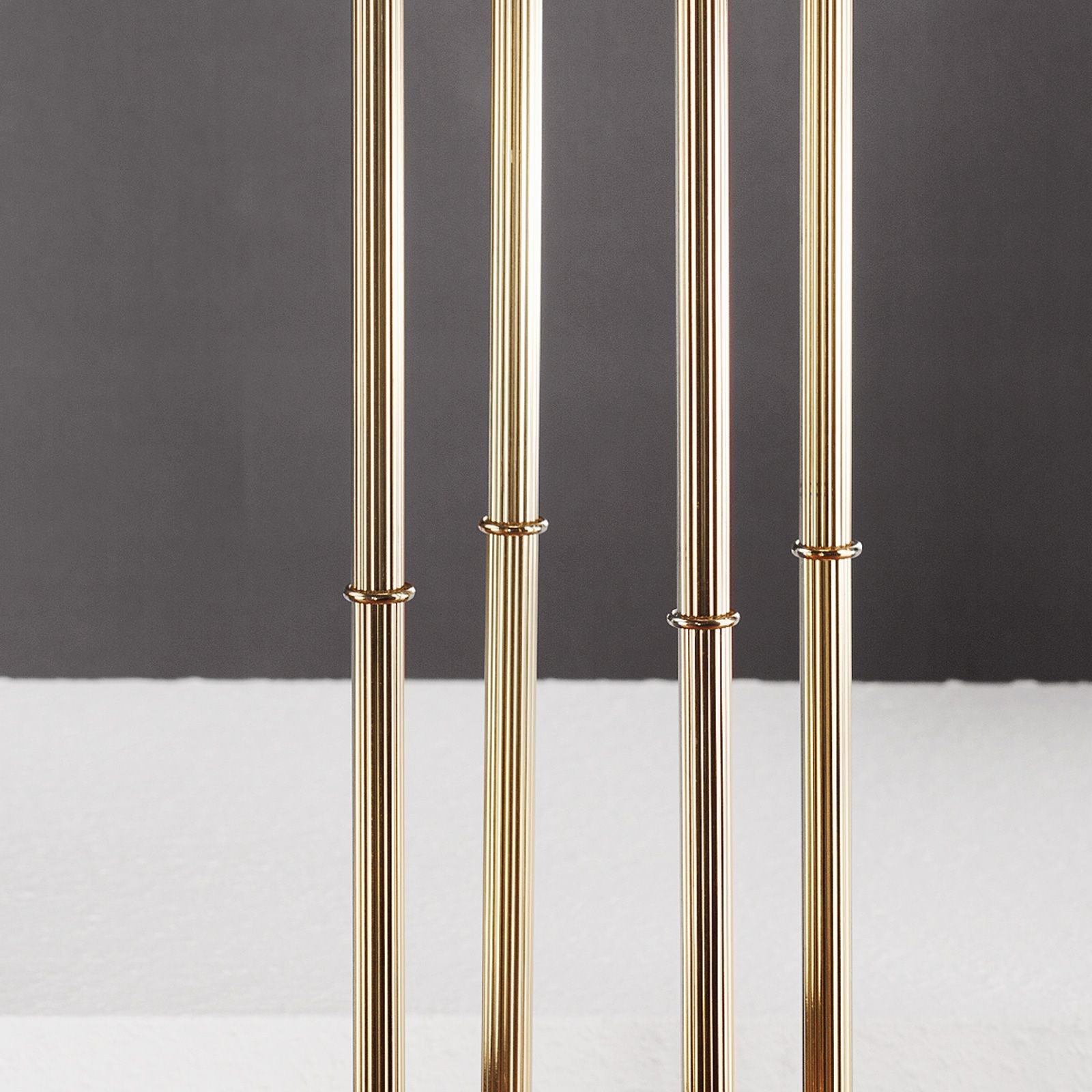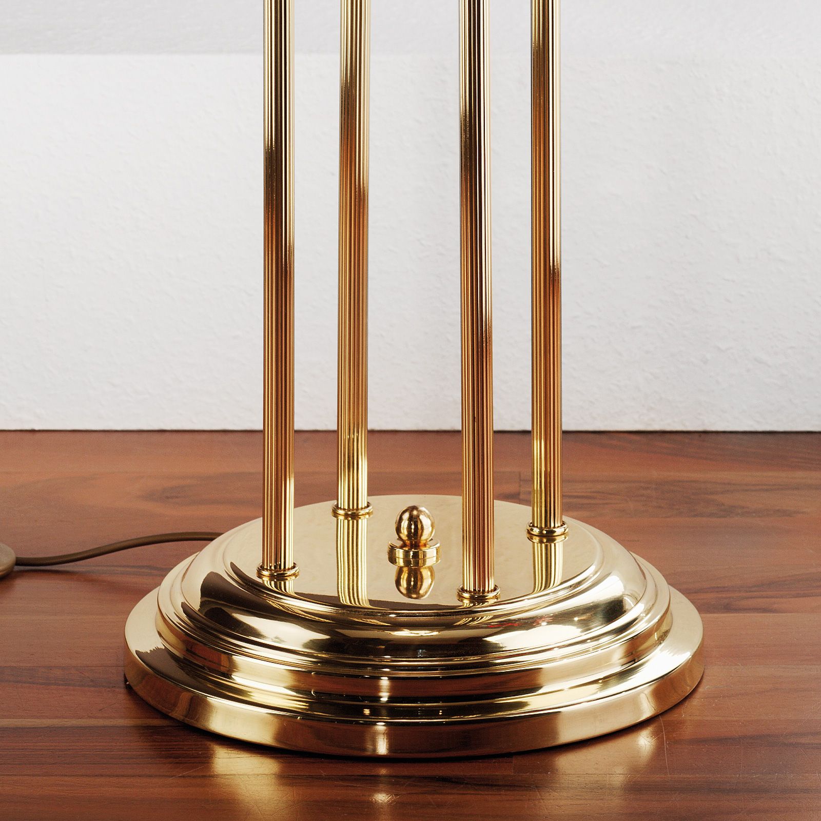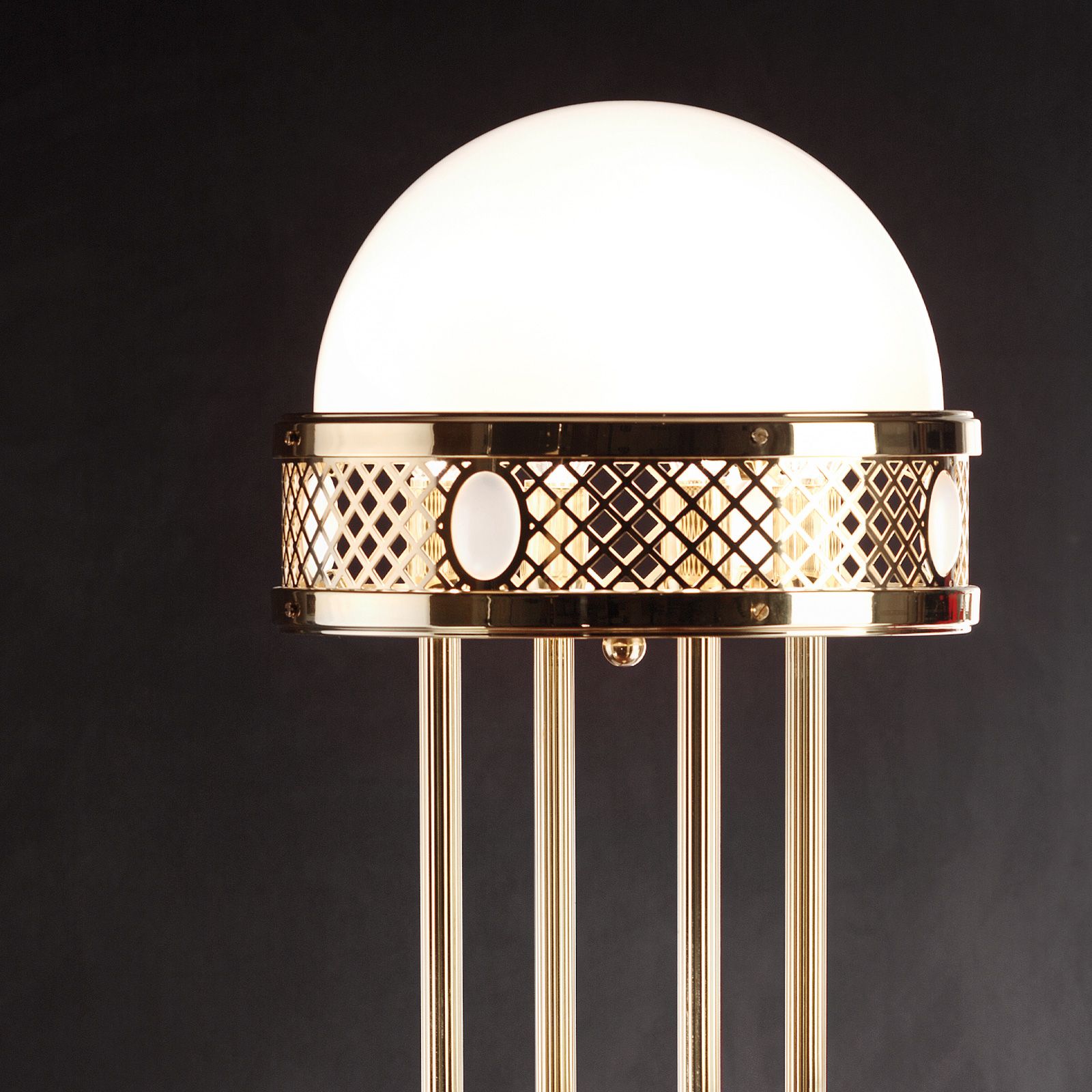 Die 170 Zentimeter hohe Stehlampe der beliebten ALT WIEN-Reihe verkörpert das Wesen des Wiener Secessionsstils: Schöne Wertarbeit, größtmögliche Klarheit der Form, und im Zentrum steht immer die Funktion. Die gewählten Materialien sind hochwertig und langlebig - Messing hochglanzpoliert, Schirm aus Opal glänzendem Glas. Die Formen sind von sachlicher, geometrischer Vollkommenheit - perfekt proportionierte Linien, Kreise, Halbkugeln, Ovale. Der Fuß ist massiv, robust, stabil, und auch hier wurde nicht auf eine gewisse Leichtigkeit in Form einer Abtreppung verzichtet. Die Stehleuchte ist mit vier E14-Fassung für je bis zu 40 Watt bestens geeignet, einem großen Raumbereich Charakter zu verleihen. Über einen Fußtrittschalter kann die Leuchte bequem bedient werden.
