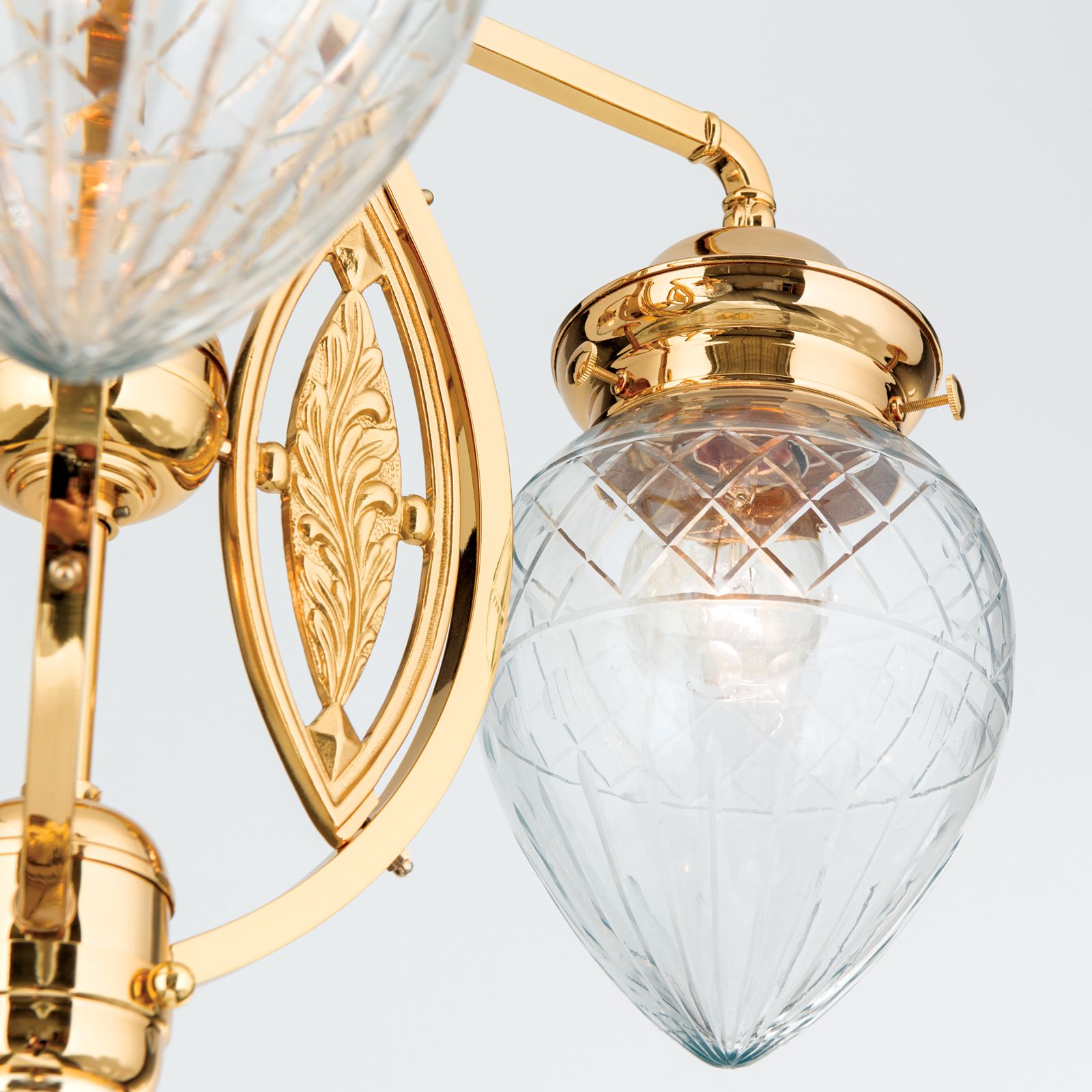 Neben der Ausführung mit bronzefarben veredeltem Messinggestell ist die Leuchte auch in einer eleganten Gold-Variante mit klar geschliffenen Gläsern erhältlich. Diese sorgt für eine brillante Lichtbrechung und setzt funkelnde Akzente, die besonders in repräsentativen Räumen zur Geltung kommen.