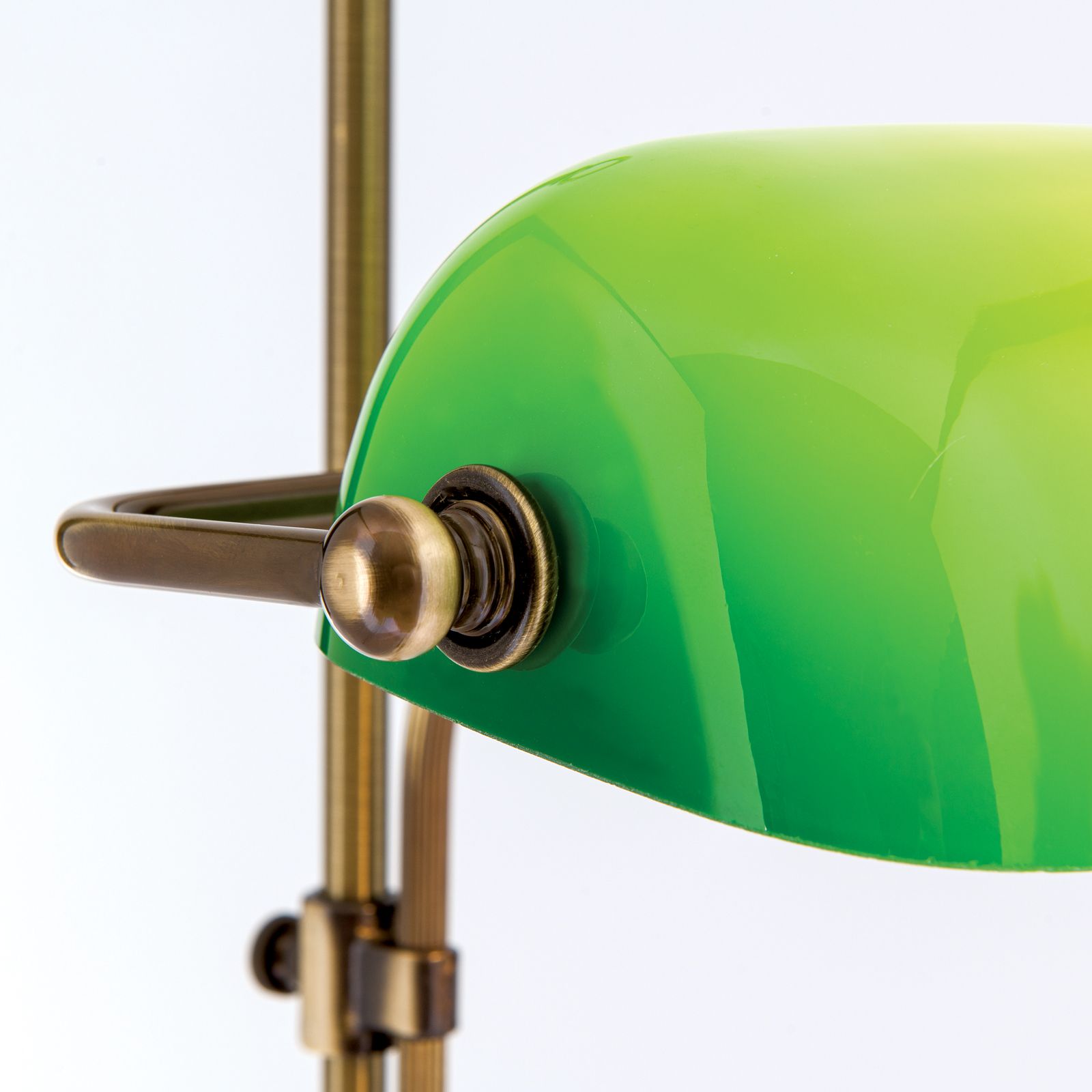 Erhältlich in drei edlen Varianten – Gestell in Patina mit grünem Glasschirm, Gestell in Satin mit opal-glänzendem Glasschirm oder Gestell in Messing mit grünem Glasschirm – fügt sich die HARVARD mühelos in unterschiedliche Wohnstile ein.