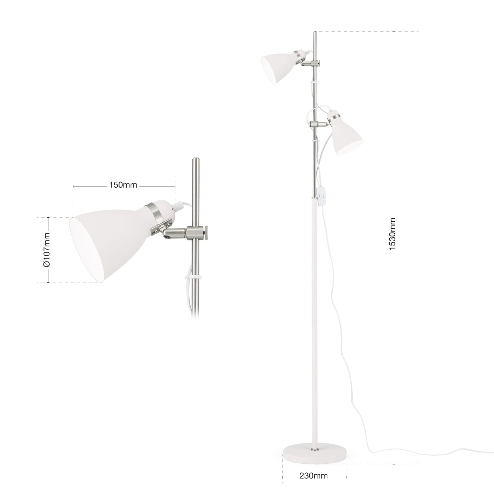 Die Stehleuchte SCHOOL lässt sich in viele verschiedene Wohnbereich eingliedern, sowohl im Arbeits-, Wohn-, Kinder- als auch Schlafzimmer findet sie ihren Platz und sorgt dort für ausreichend Licht. Sie hat 2 Schirme, die individuell ausgerichtet werden können, je nachdem, wo man den Lichtstrahl braucht. Praktisch ist auch, dass auch die Höhe der Leuchtenköpfe verstellt werden kann und sie somit noch mehr Flexibilität bietet. Sowohl der Standfuß als auch die Schirme sind farblich gleich gehalten, nur das Gestell ist Silber, was die Leuchte in ihrem Gesamtbild abrundet. Mit einem externen Schalter kann sie ganz einfach ein- und ausgeschaltet werden. Die Leuchte ist mit 2 E27-Fassungen ausgestattet und kann mit maximal 40 Watt bestückt werden. Eine Verwendung von sparsamen LEDs wird empfohlen, da sie sich durch ihren niedrigen Stromverbrauch auszeichnen.
